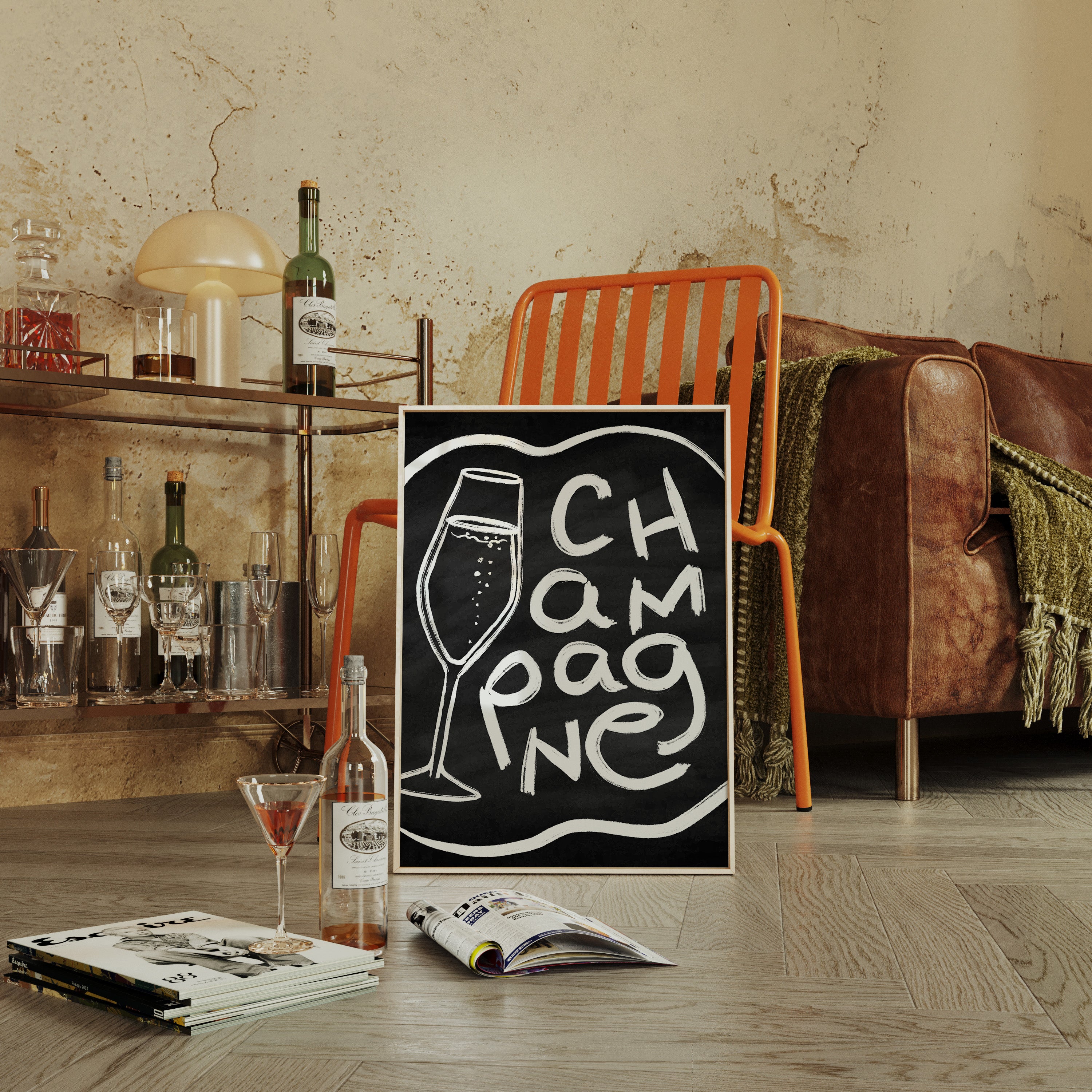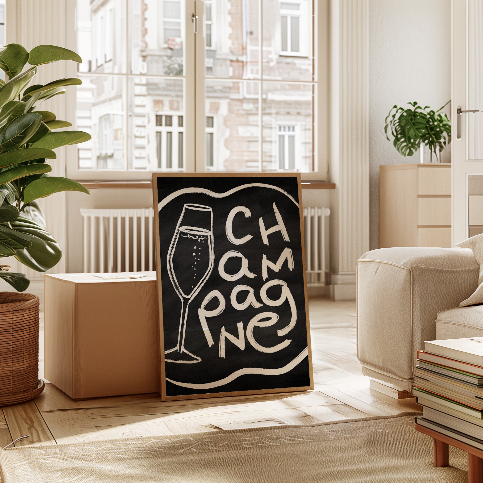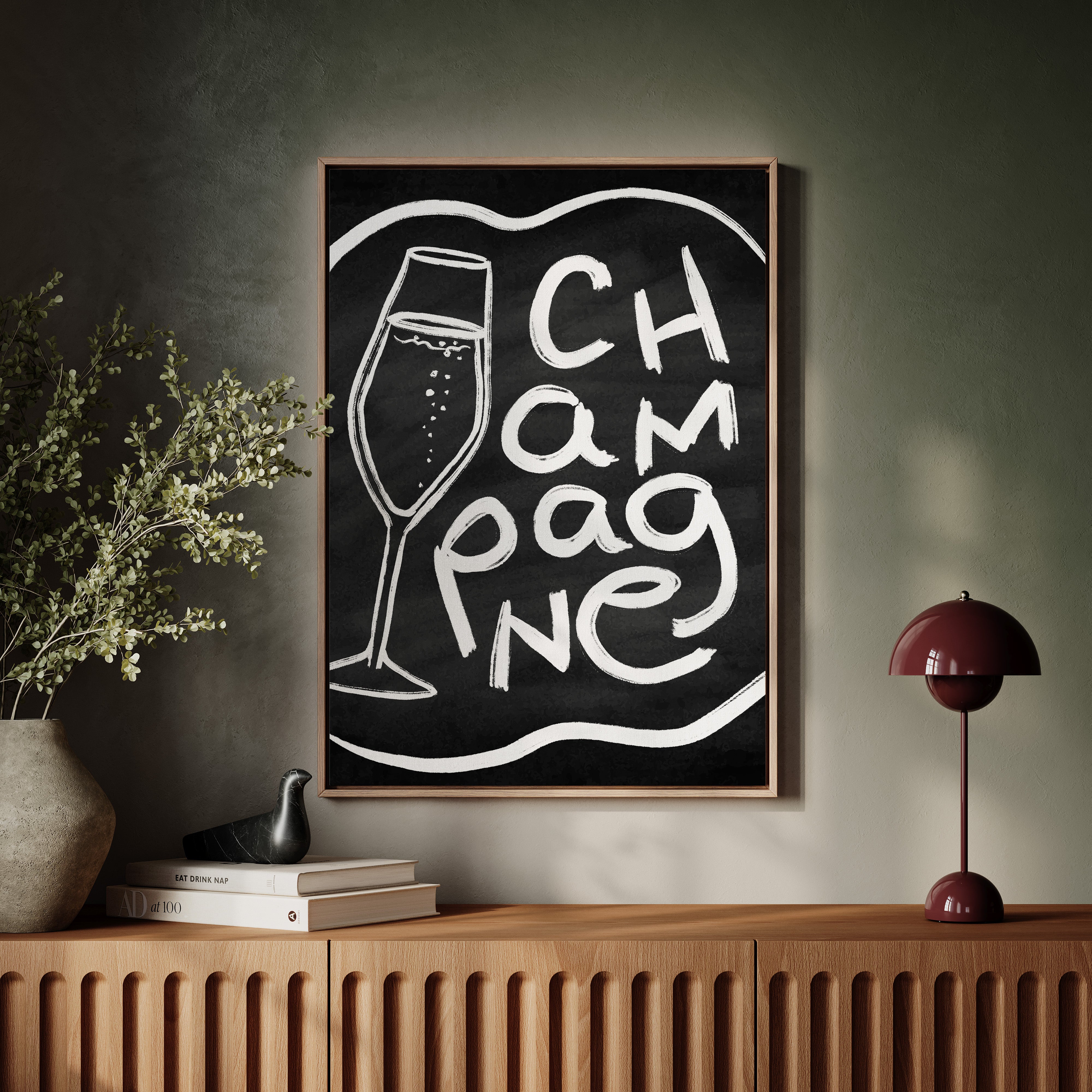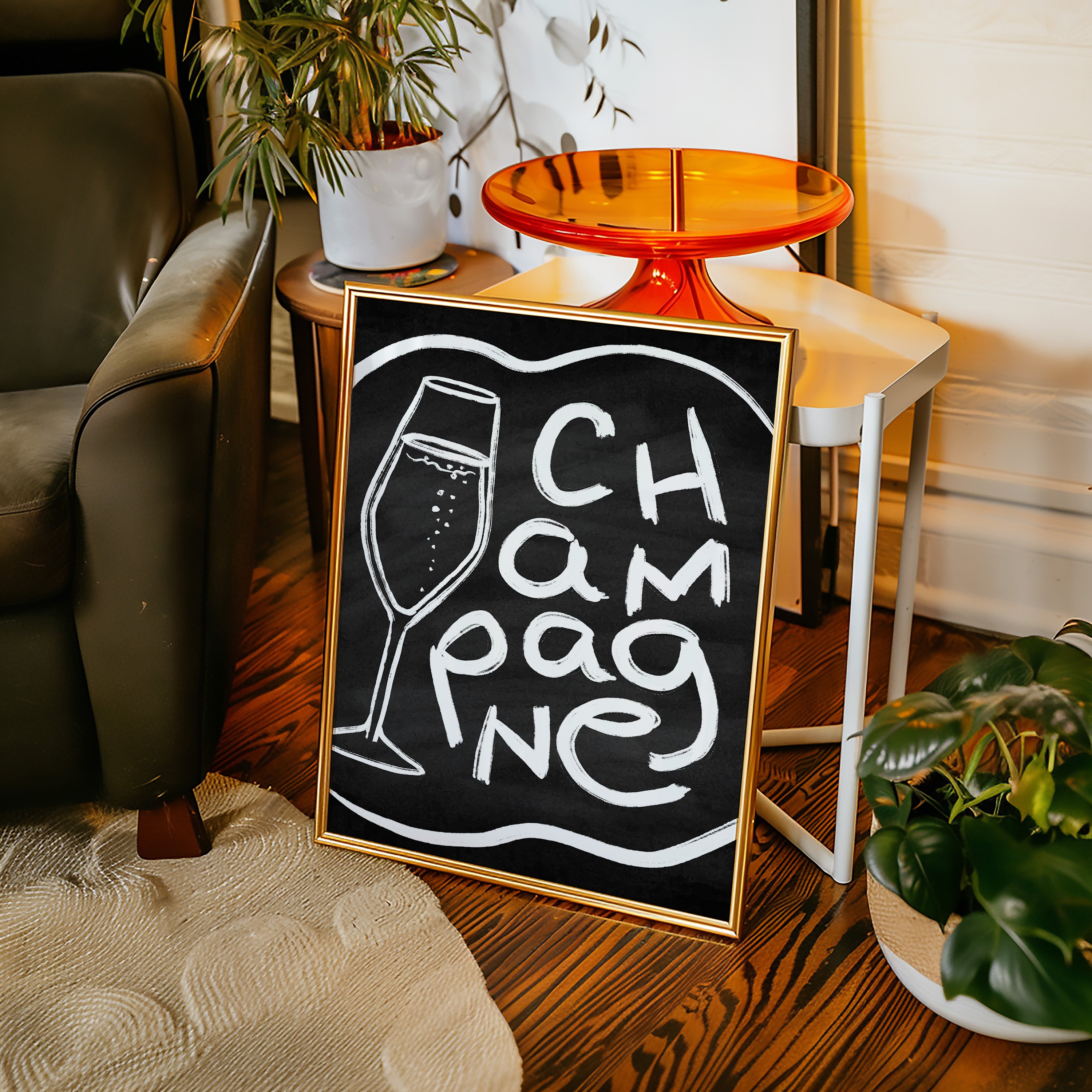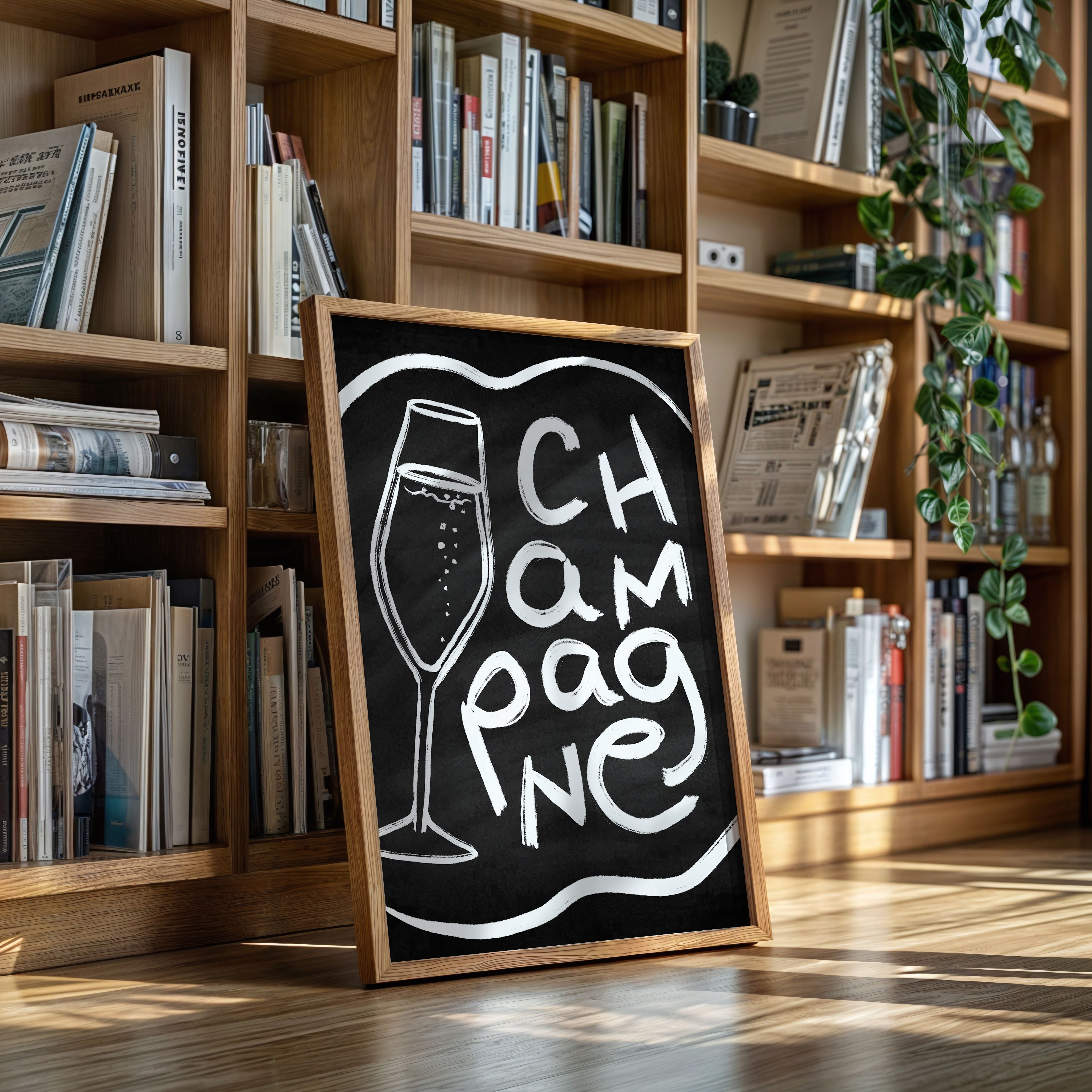 Delicate bubbles rise against stark black and white, capturing the casual elegance of a spontaneous celebration. This contemporary chalkboard-style piece brings modern sophistication to beverage-themed art. Bold strokes and playful lettering dance across the canvas, creating a statement that's both refined and approachable. The minimalist design speaks to life's perfect moments - when friends gather, glasses clink, and memories are made. Perfect for adding personality to a dining room, home bar, or kitchen space, this piece invites both conversation and contemplation. The interplay of light and shadow adds depth to its timeless appeal.