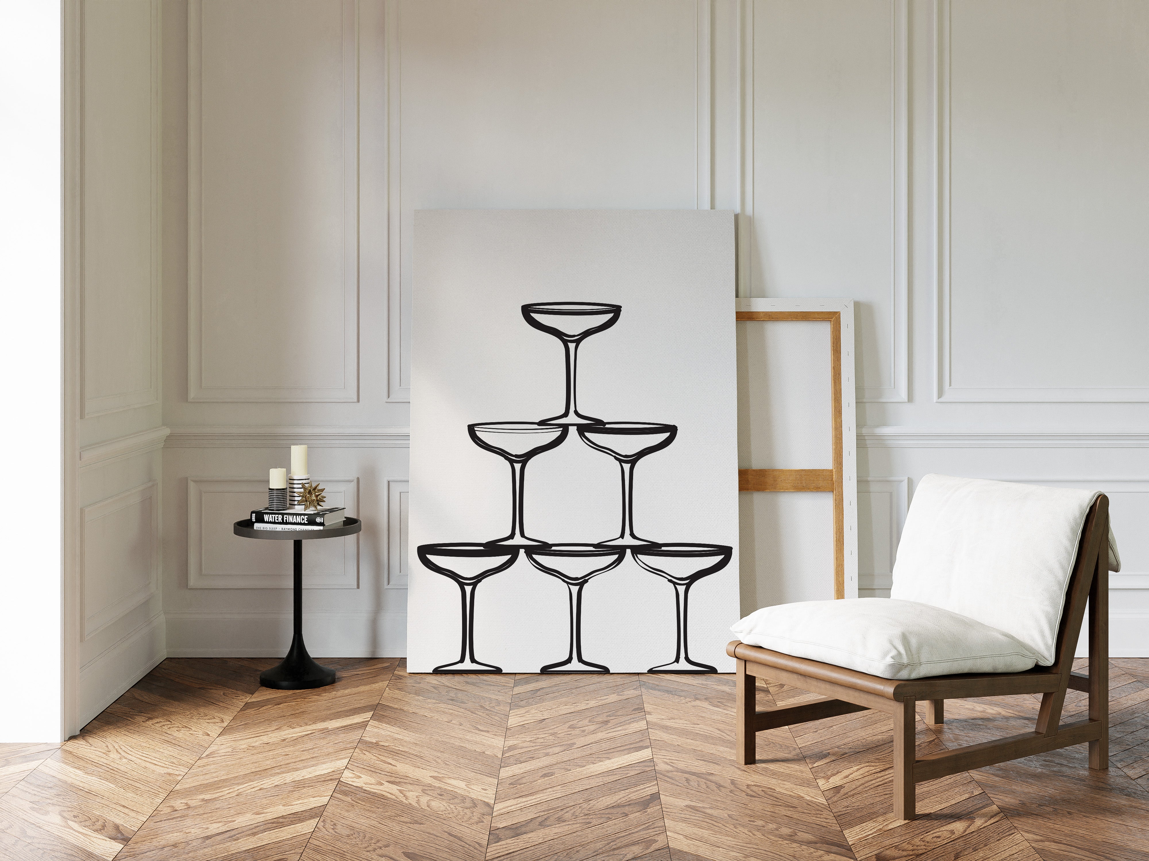 Crystal stems rise in elegant formation, their empty bowls waiting to catch liquid starlight. This piece from our Contemporary collection captures the sophisticated minimalism of modern entertaining. Bold black lines trace the geometry of celebration, creating a striking architectural statement through negative space. The composition builds upward with mathematical precision, yet maintains an organic flow that suggests the ephemeral nature of festive moments. Perfect for dining rooms, home bars, or any space where you want to infuse a touch of sophisticated whimsy. The clean monochromatic design adapts effortlessly to any color scheme while maintaining its statement presence.