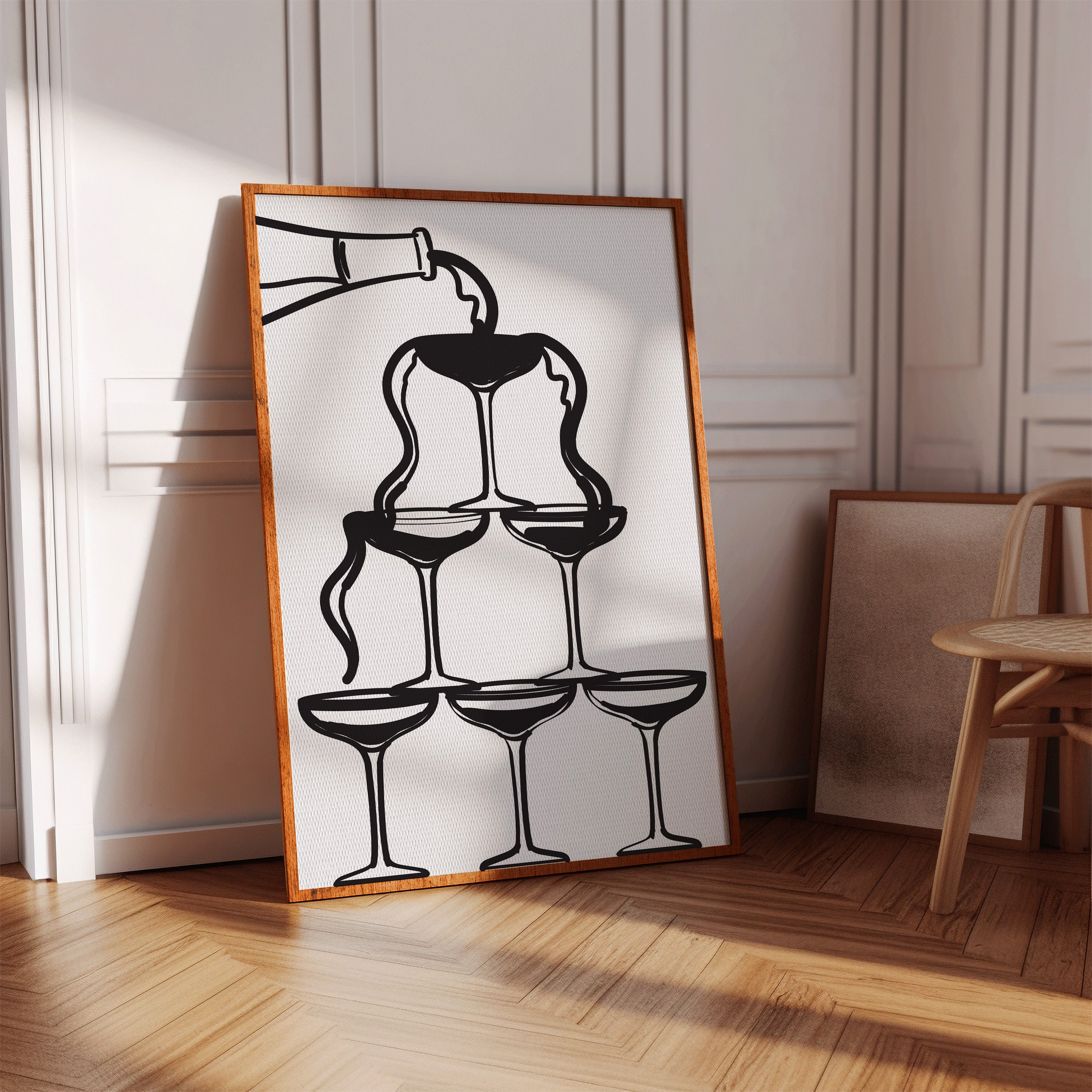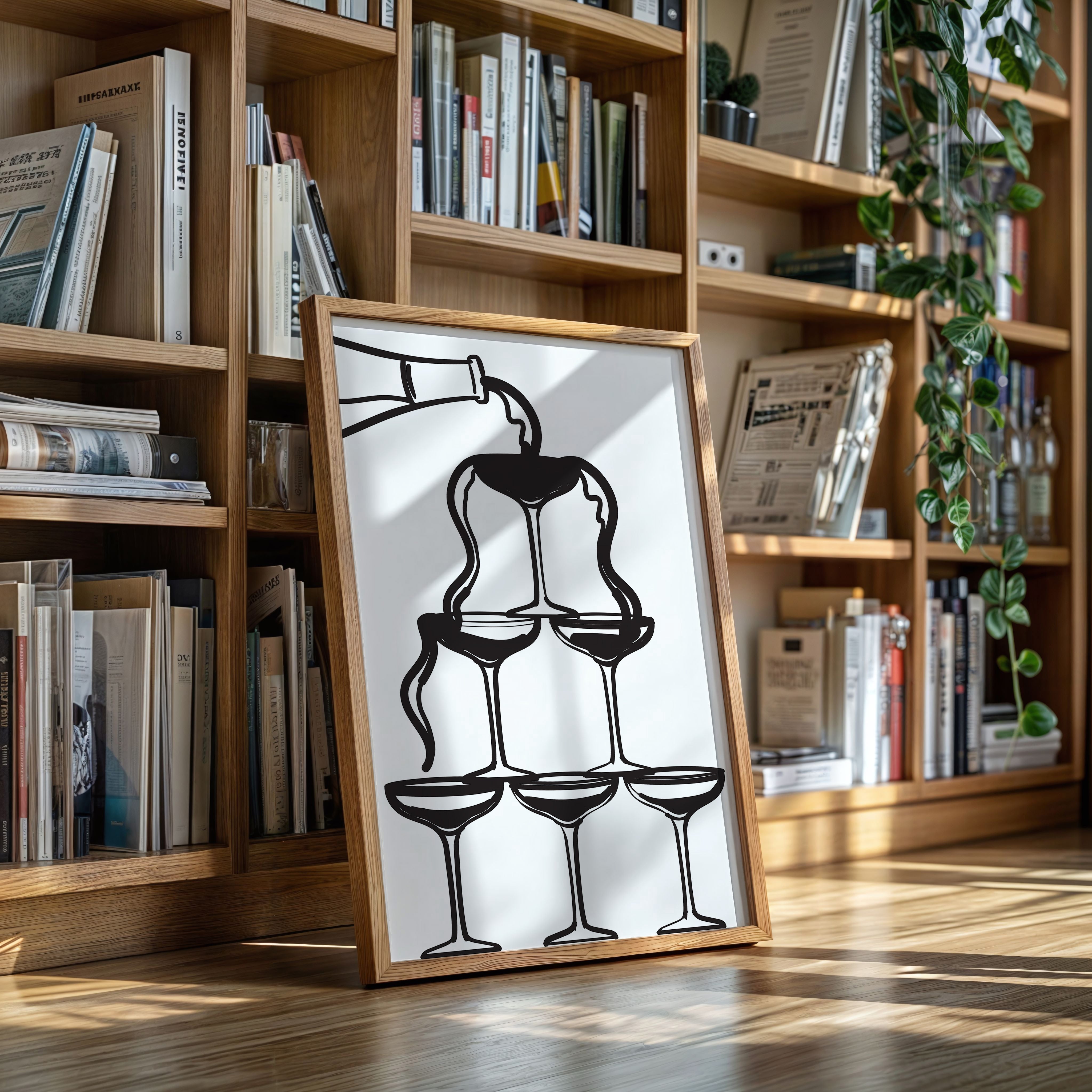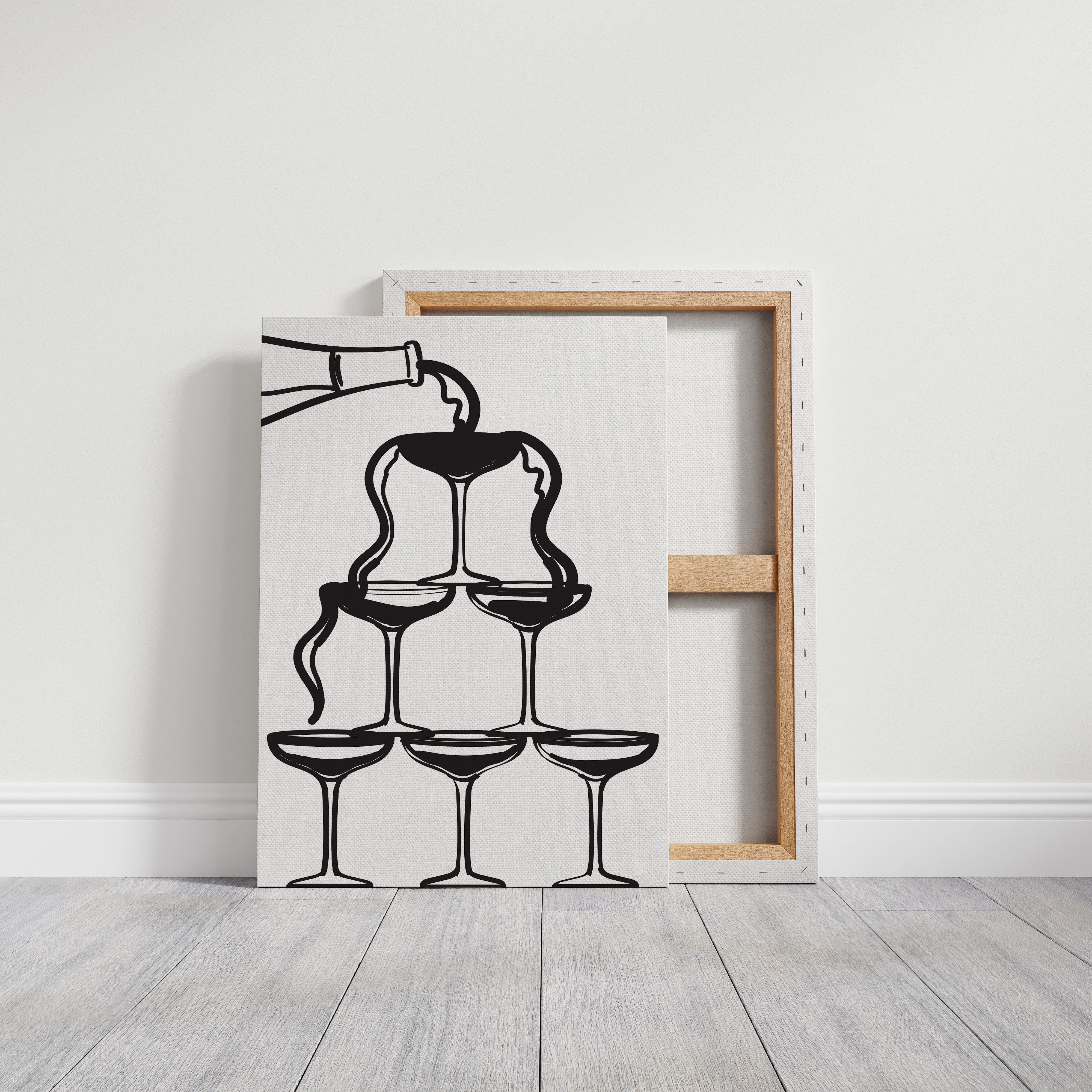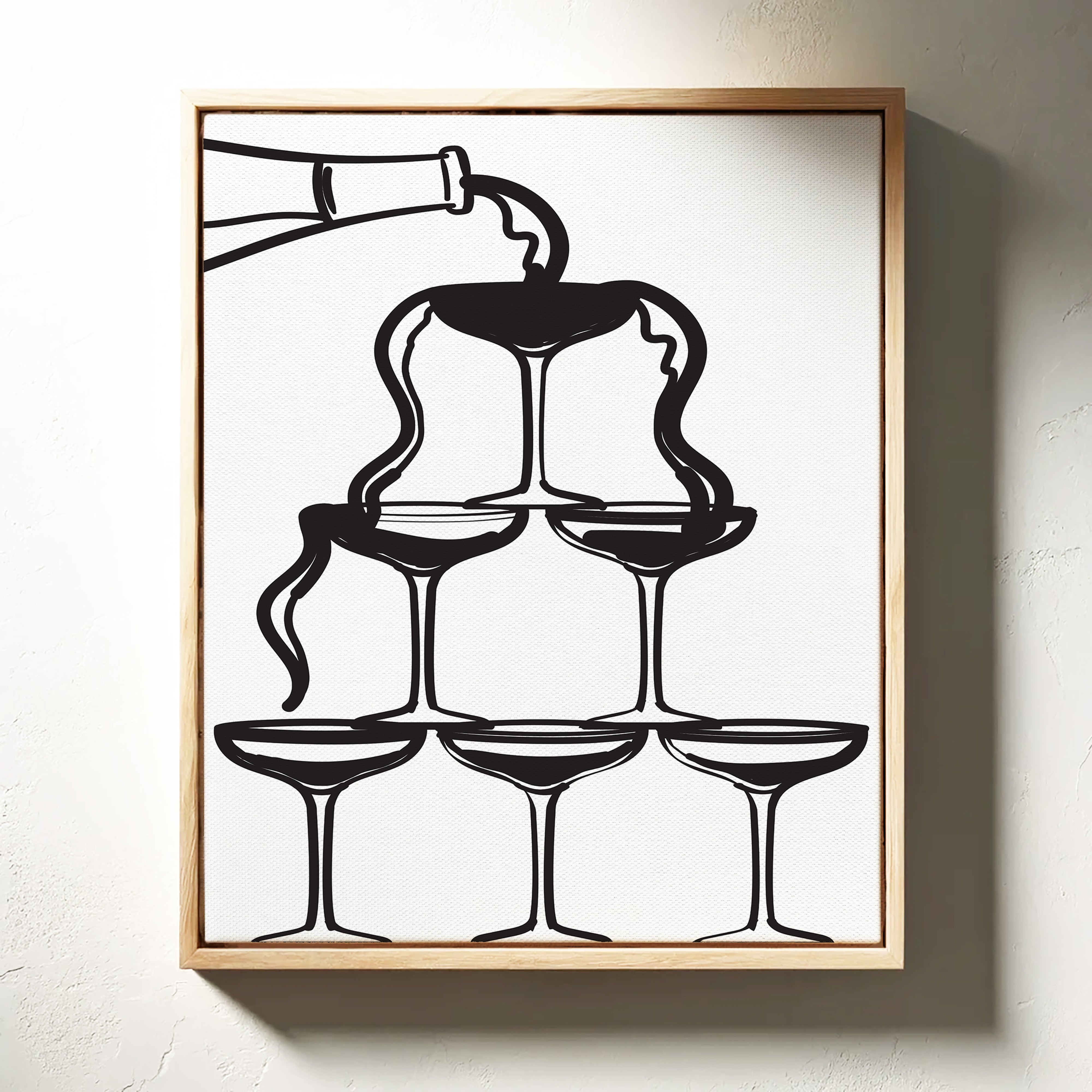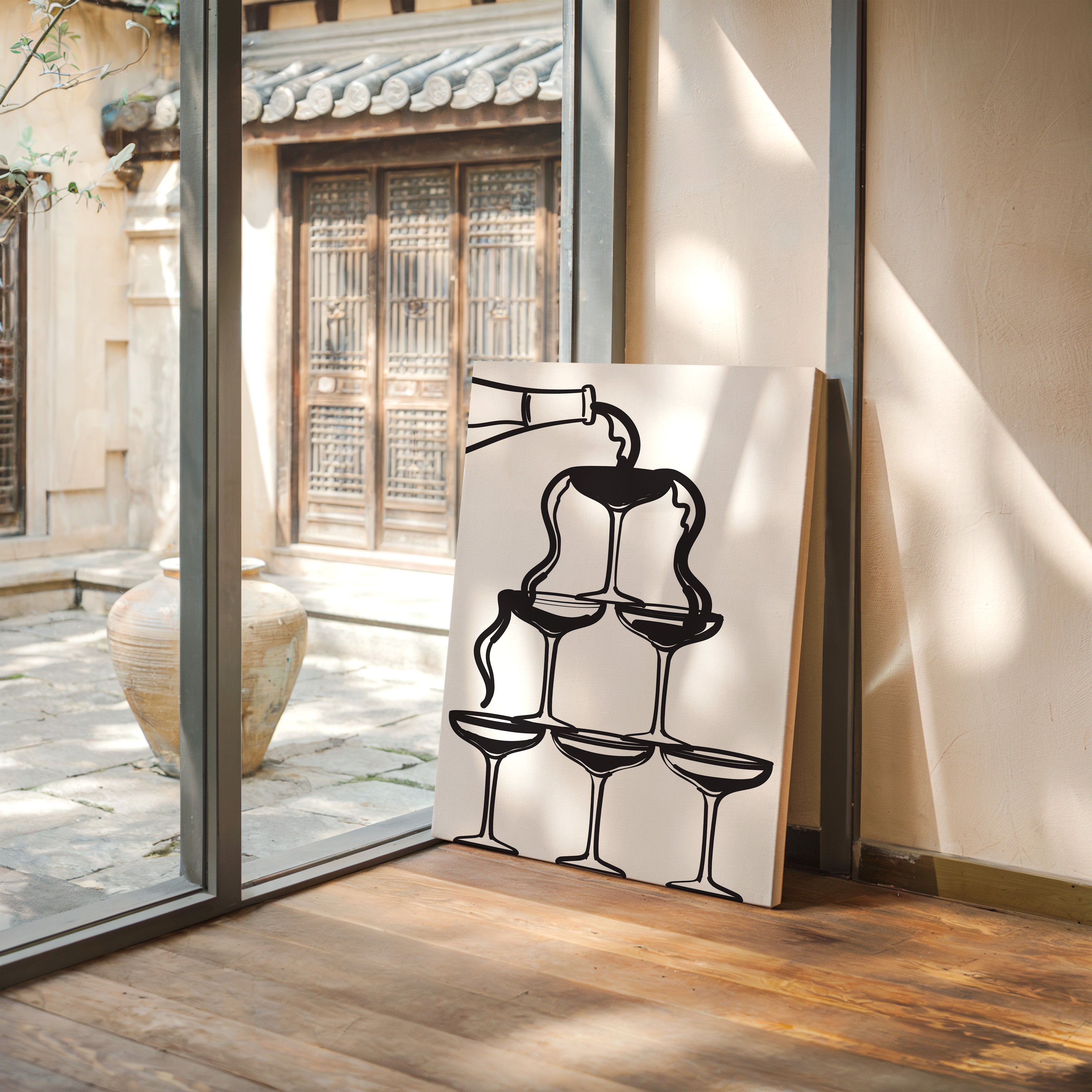 Crystal stems rise like elegant architecture, catching light and possibility in their graceful forms. This bold black and white piece from our Contemporary collection captures the sophisticated essence of celebration. The dramatic composition flows from top to bottom, creating a mesmerizing cascade effect as liquid luxury pours from one delicate glass to the next. The stark contrast and clean lines make this piece perfect for modern dining rooms, home bars, or restaurant spaces where it adds both style and storytelling. Each viewing reveals new details in the interplay of positive and negative space.