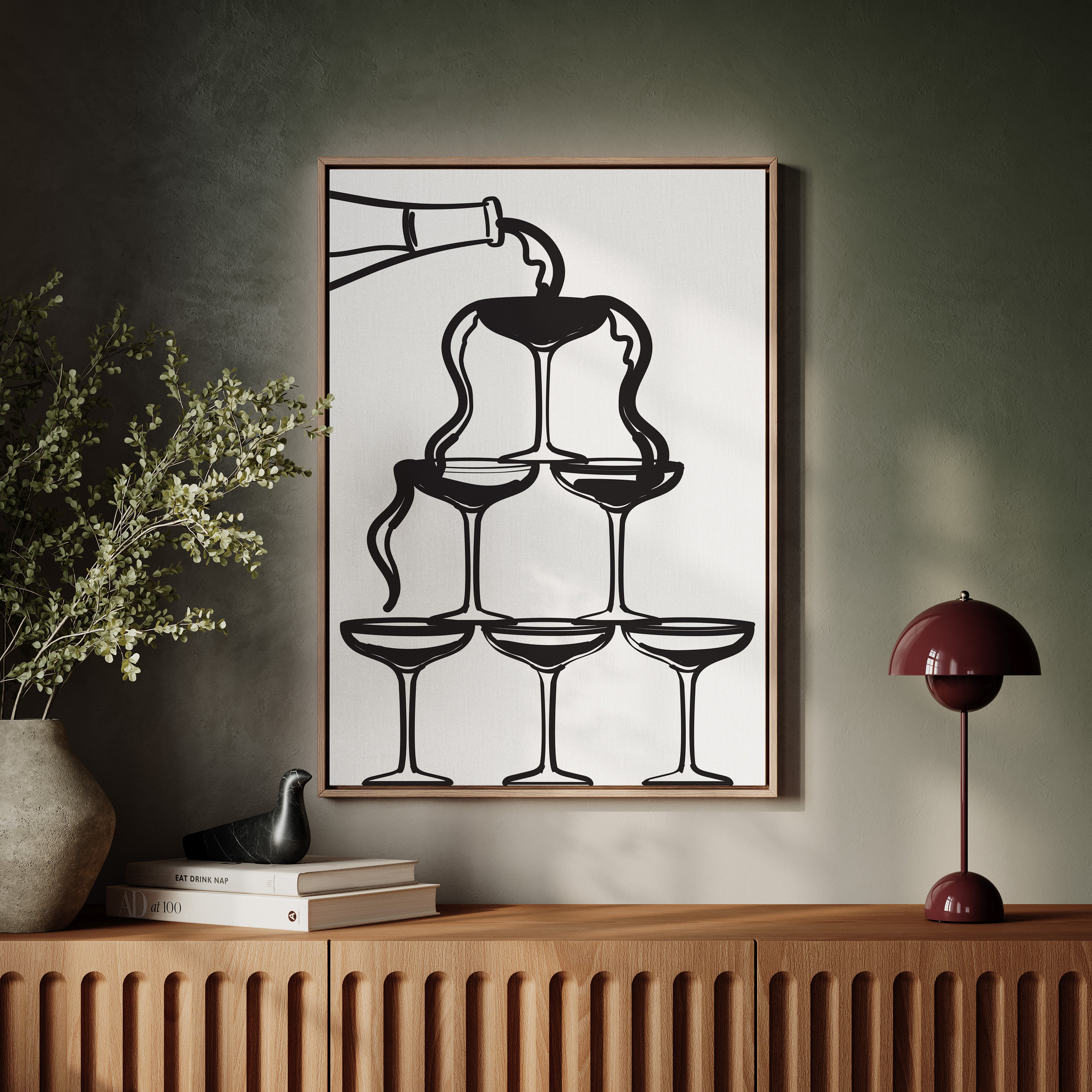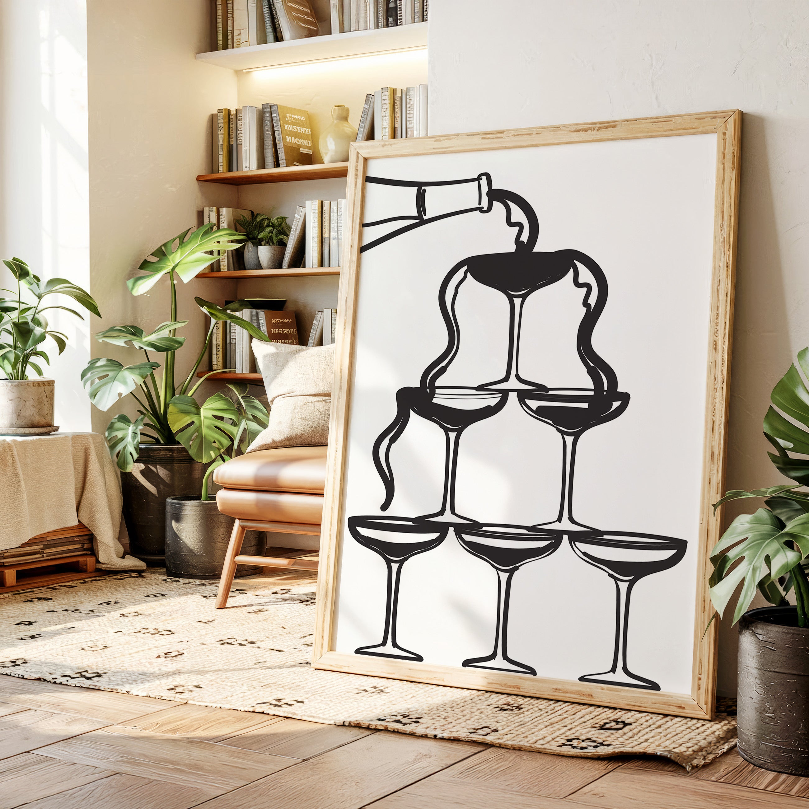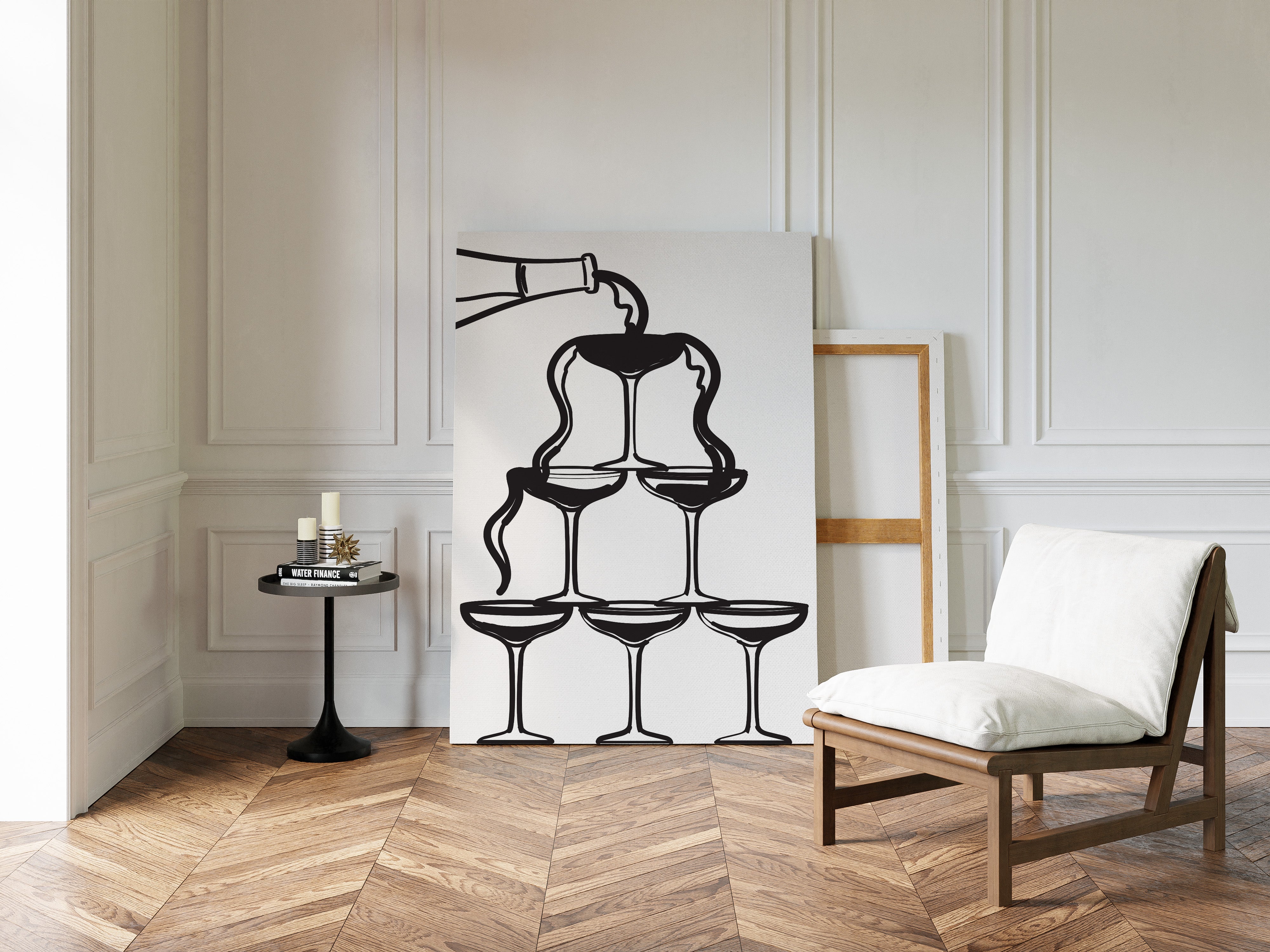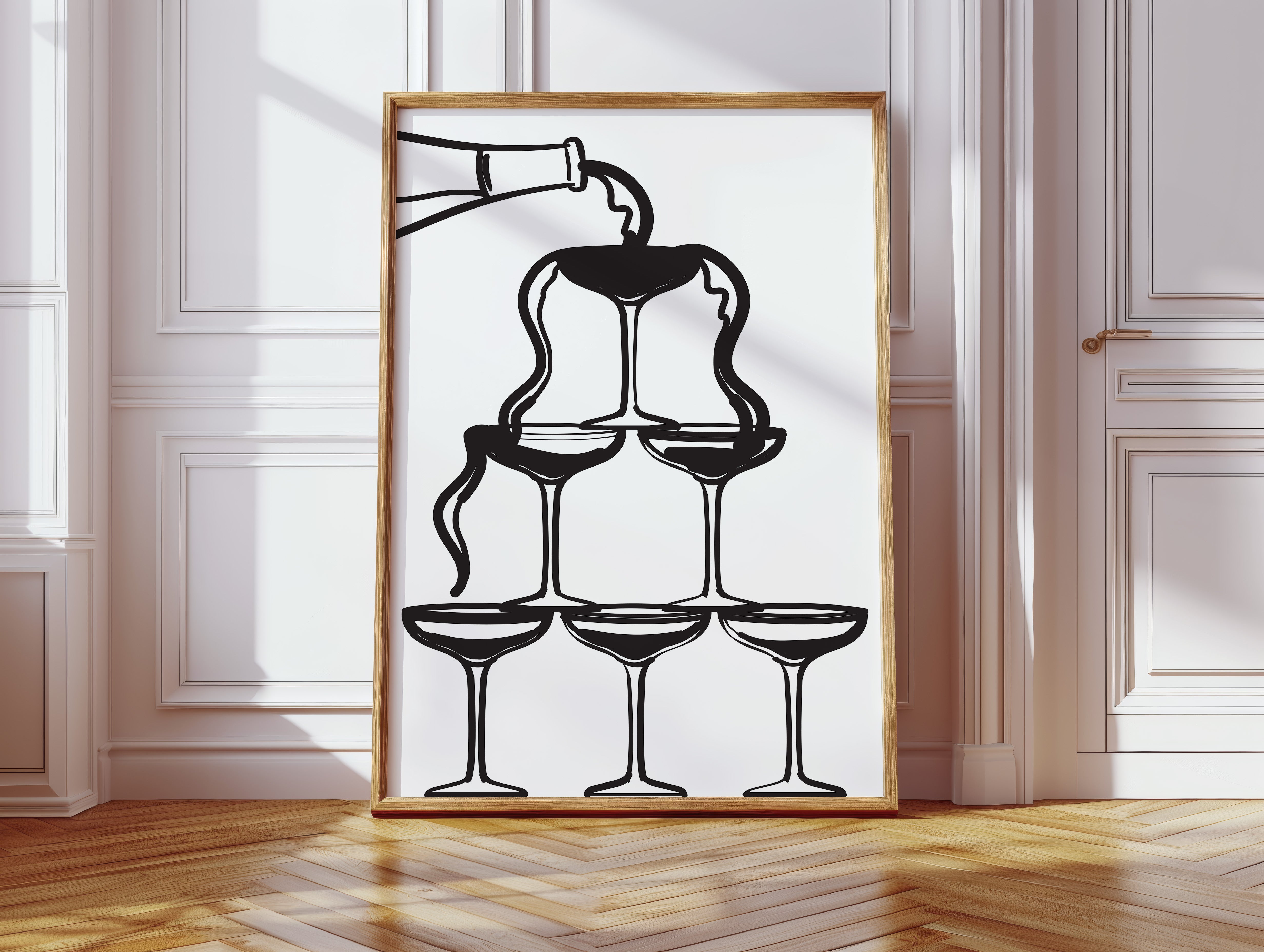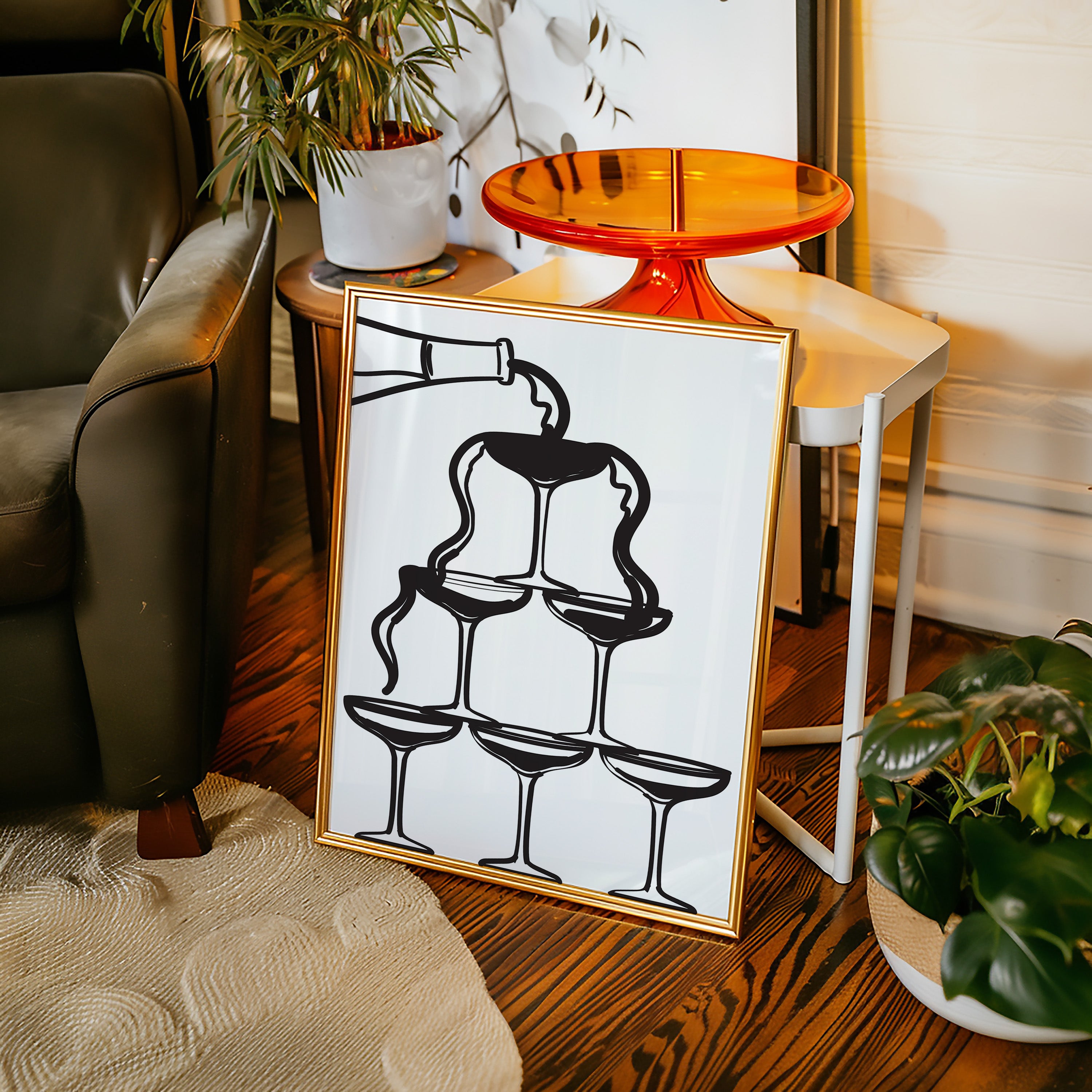 Crystal stems rise like elegant architecture, catching light and possibility in their graceful forms. This bold black and white piece from our Contemporary collection captures the sophisticated essence of celebration. The dramatic composition flows from top to bottom, creating a mesmerizing cascade effect as liquid luxury pours from one delicate glass to the next. The stark contrast and clean lines make this piece perfect for modern dining rooms, home bars, or restaurant spaces where it adds both style and storytelling. Each viewing reveals new details in the interplay of positive and negative space.