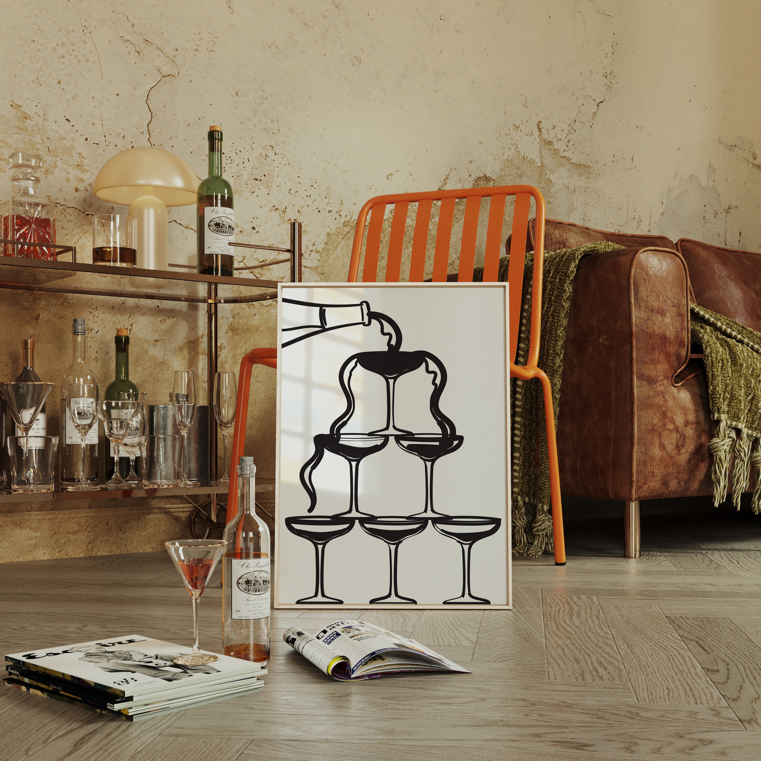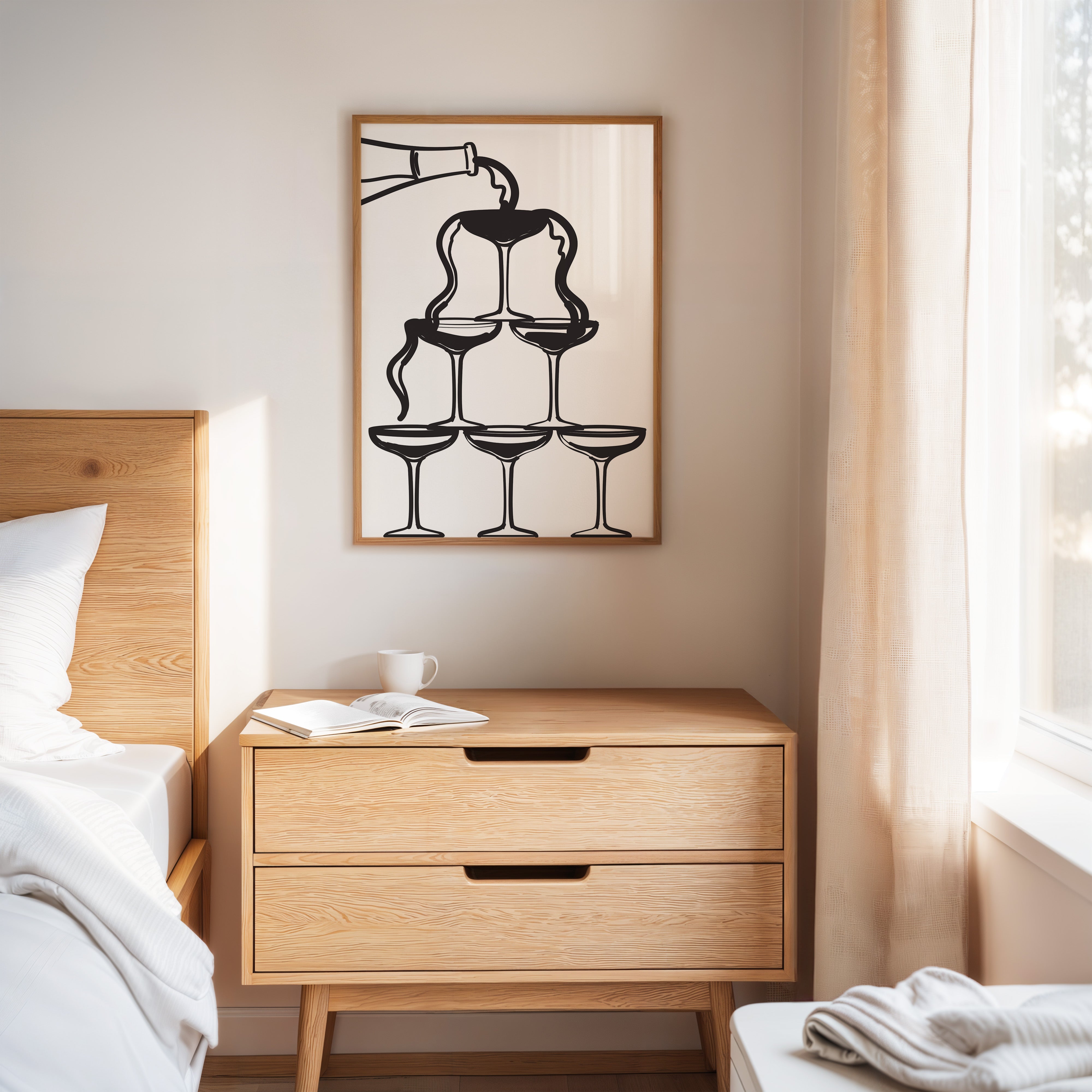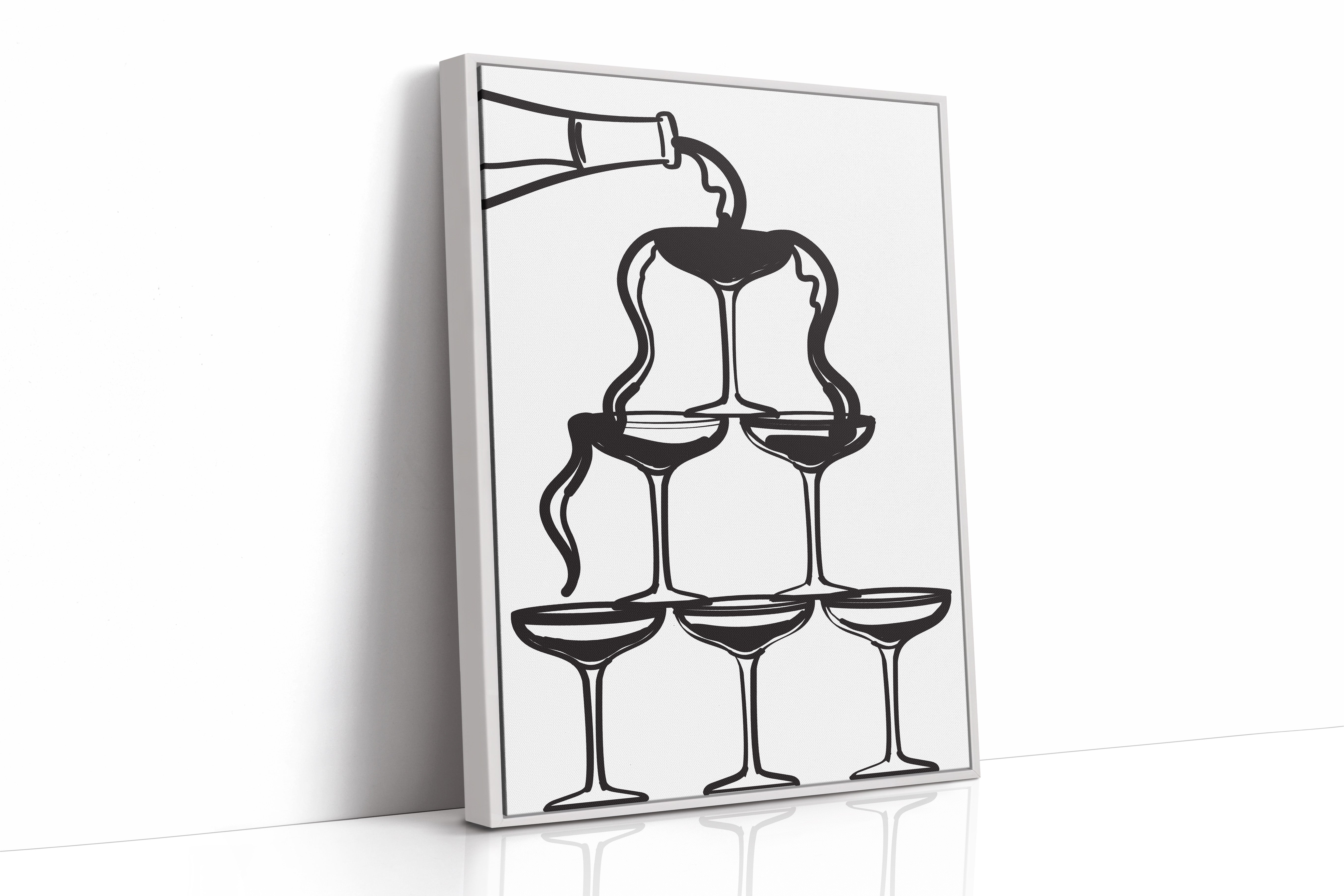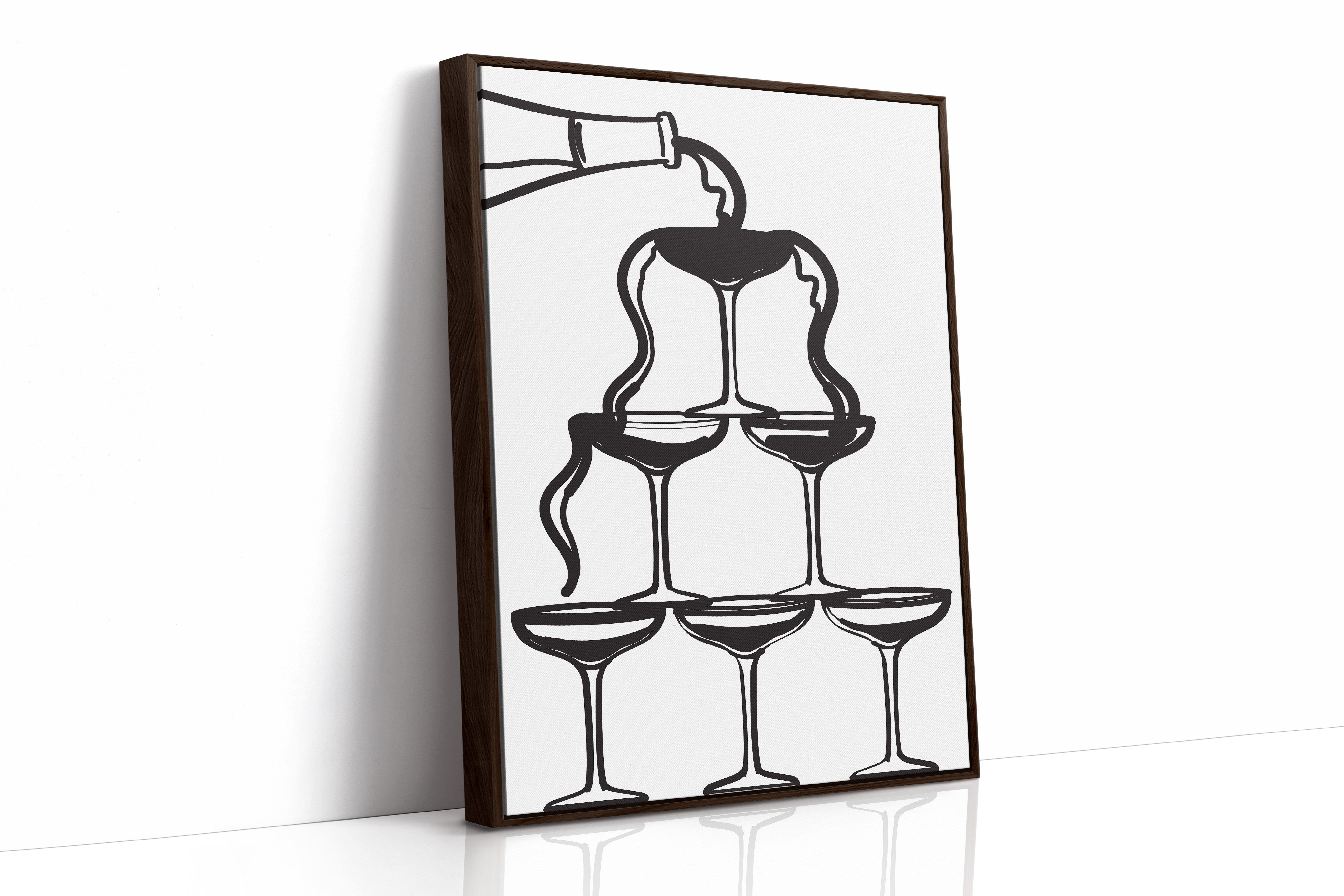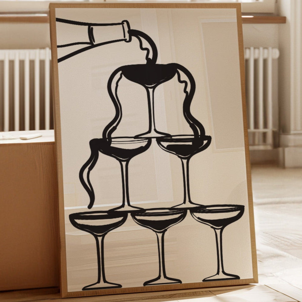 Crystal stems rise like elegant architecture, catching light and possibility in their graceful forms. This bold black and white piece from our Contemporary collection captures the sophisticated essence of celebration. The dramatic composition flows from top to bottom, creating a mesmerizing cascade effect as liquid luxury pours from one delicate glass to the next. The stark contrast and clean lines make this piece perfect for modern dining rooms, home bars, or restaurant spaces where it adds both style and storytelling. Each viewing reveals new details in the interplay of positive and negative space.