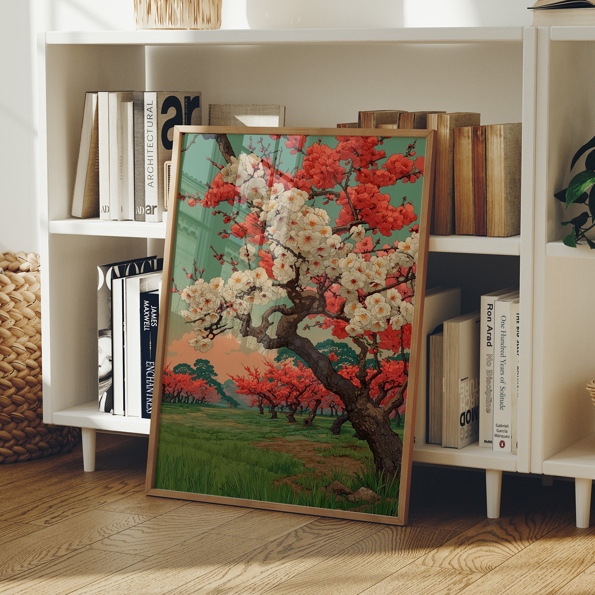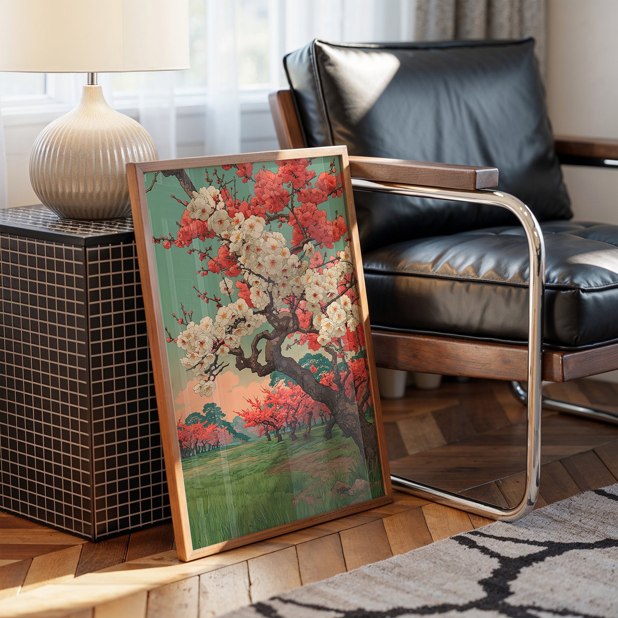 A striking Japanese-inspired landscape painting commands attention above a carefully curated home bar, creating an unexpected harmony between nature's elegance and urban sophistication. The artwork's vibrant coral and cream cherry blossoms burst against a serene jade sky, while the twisted ancient trunk tells stories of seasons past. This contemporary take on traditional Eastern art brings a perfect balance to the industrial-modern space, where sunlight streams through factory windows onto weathered wooden floors.