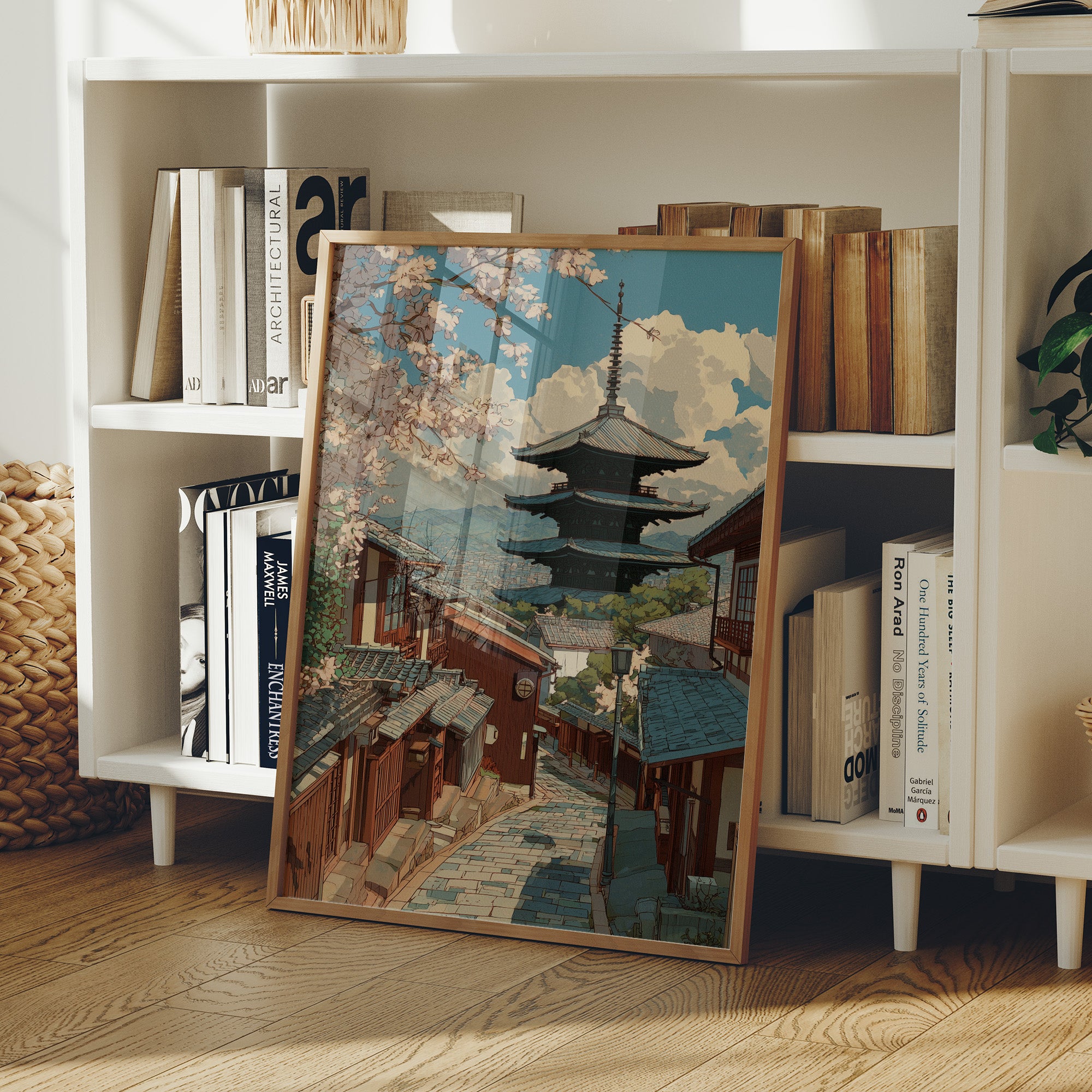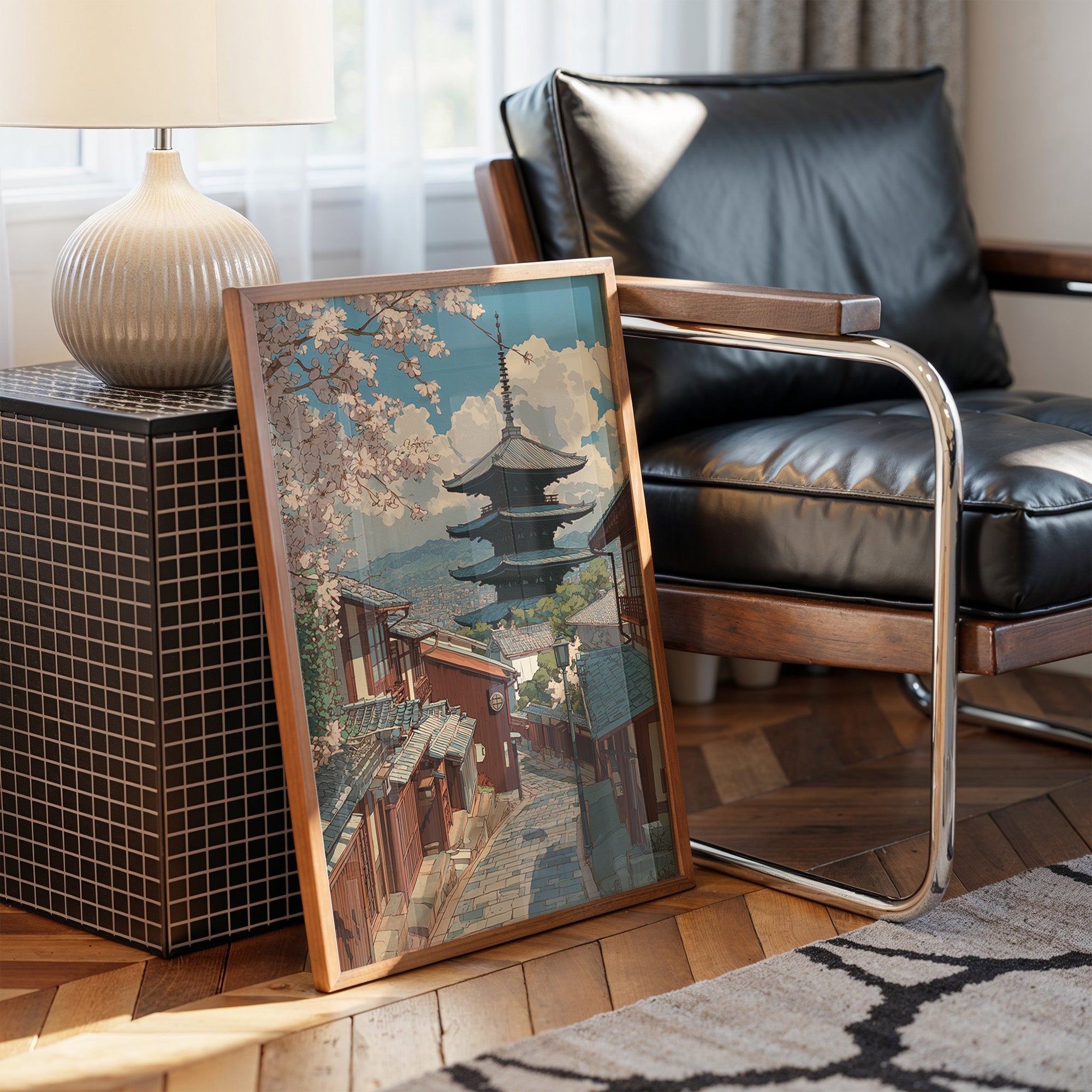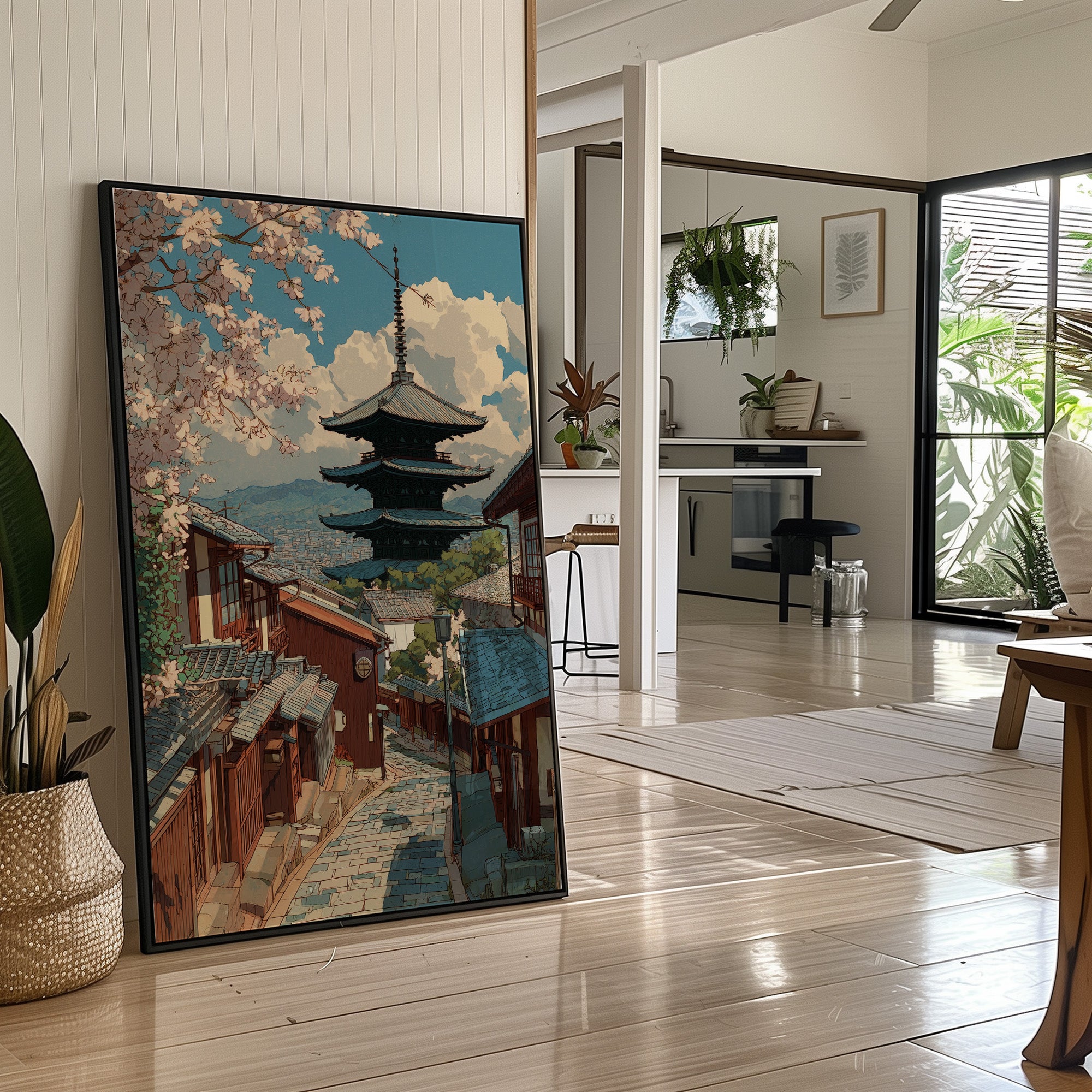 Delicate pink petals dance against a turquoise sky, framing the timeless architecture of Kyoto's historic district. The pagoda rises majestically above traditional wooden buildings, its silhouette perfectly balanced against billowing clouds and mountains in the distance. Stone pathways wind through the scene, telling stories of countless footsteps while spring's gentle touch transforms the urban landscape into a fleeting paradise. This piece brings serenity to any room, particularly suited for a minimalist dining area or meditation space where its balanced composition can create a peaceful focal point.