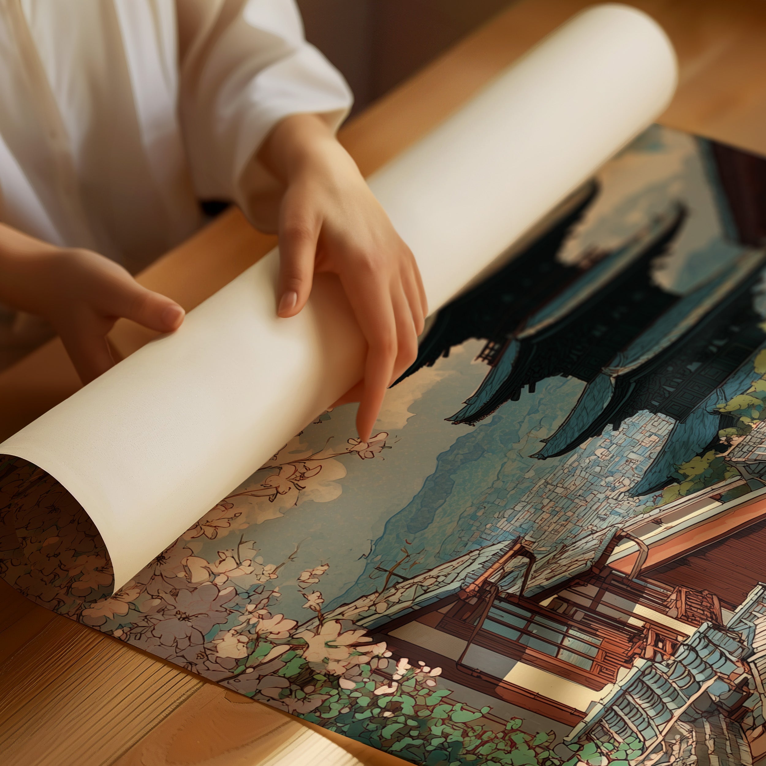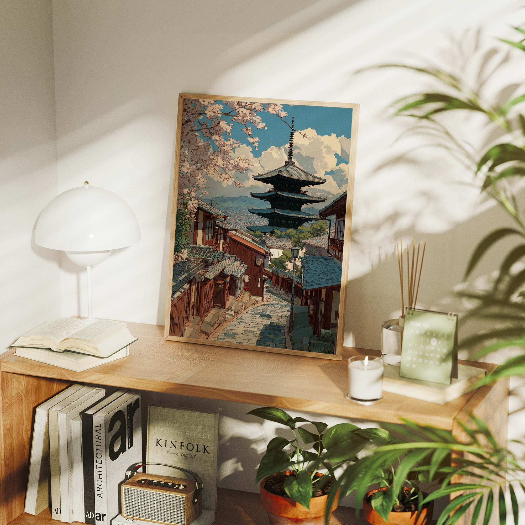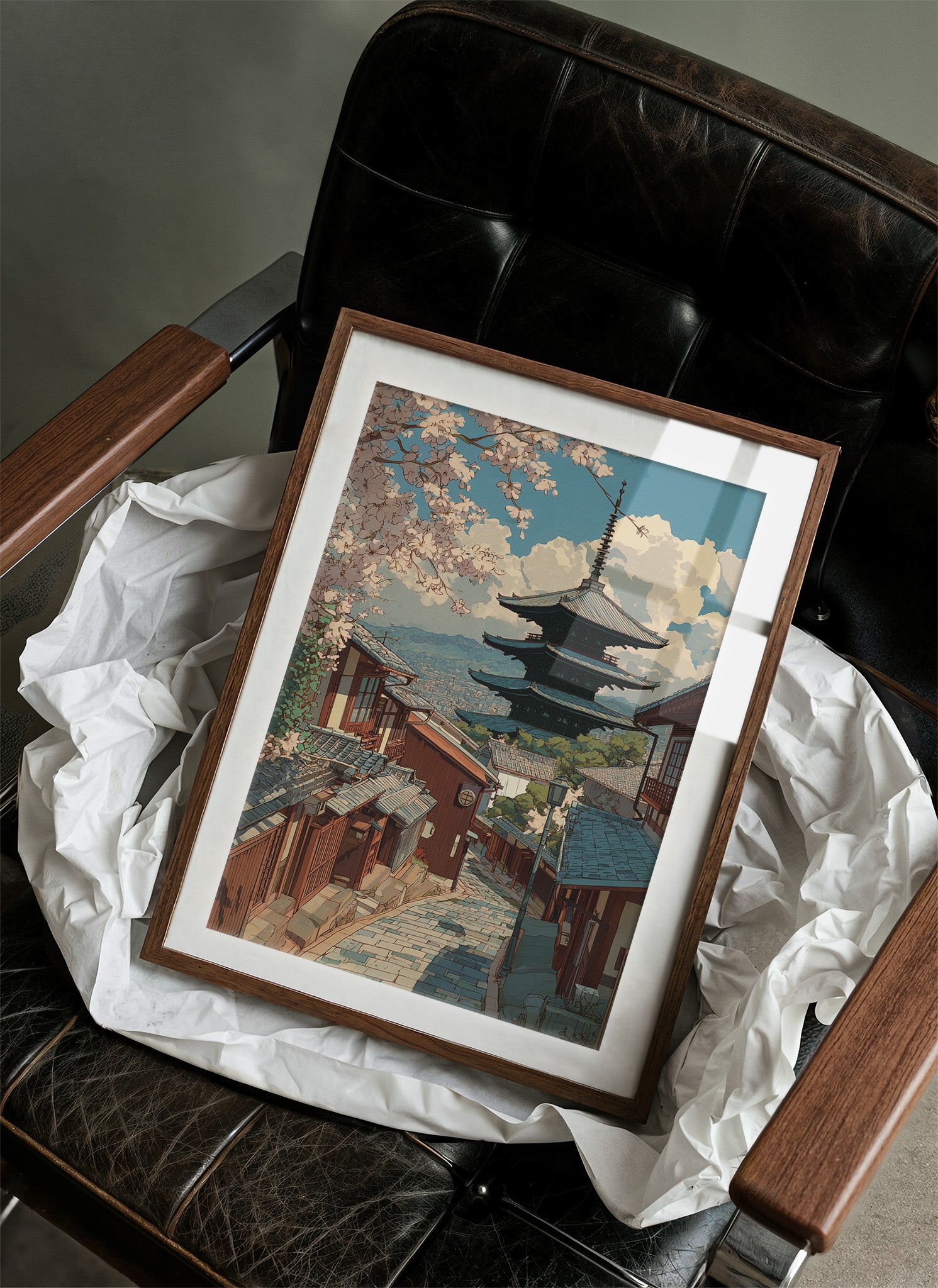 Delicate pink petals dance against a turquoise sky, framing the timeless architecture of Kyoto's historic district. The pagoda rises majestically above traditional wooden buildings, its silhouette perfectly balanced against billowing clouds and mountains in the distance. Stone pathways wind through the scene, telling stories of countless footsteps while spring's gentle touch transforms the urban landscape into a fleeting paradise. This piece brings serenity to any room, particularly suited for a minimalist dining area or meditation space where its balanced composition can create a peaceful focal point.