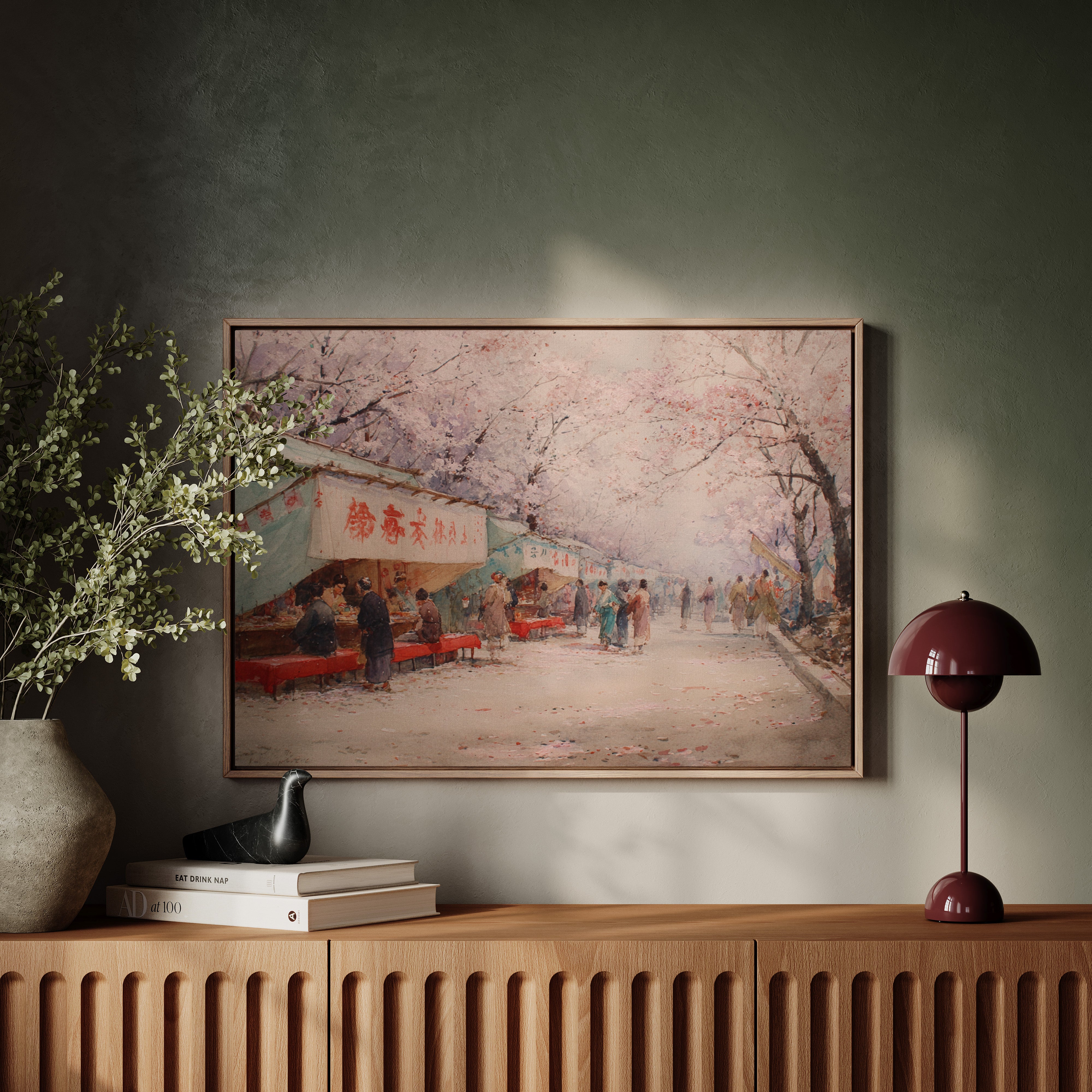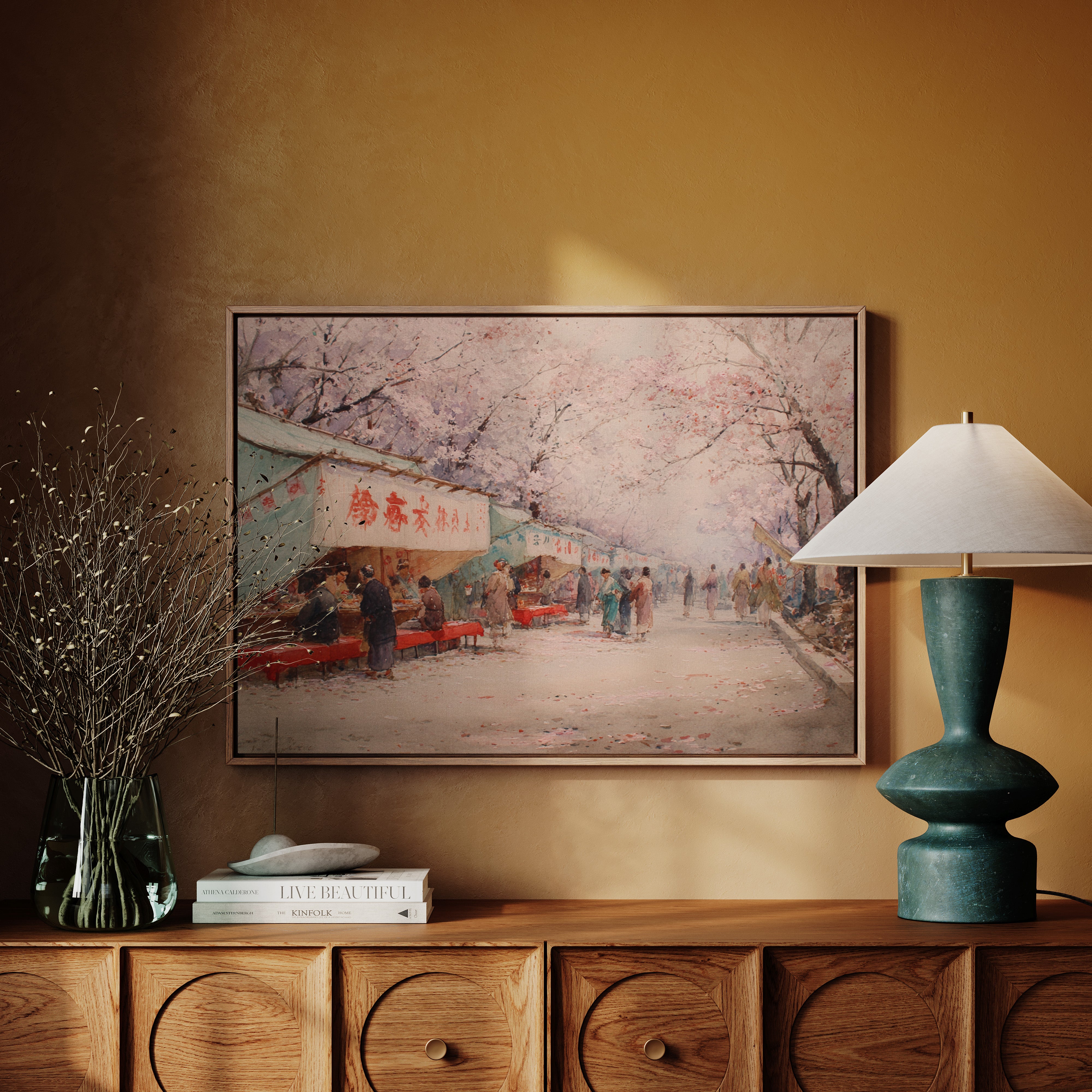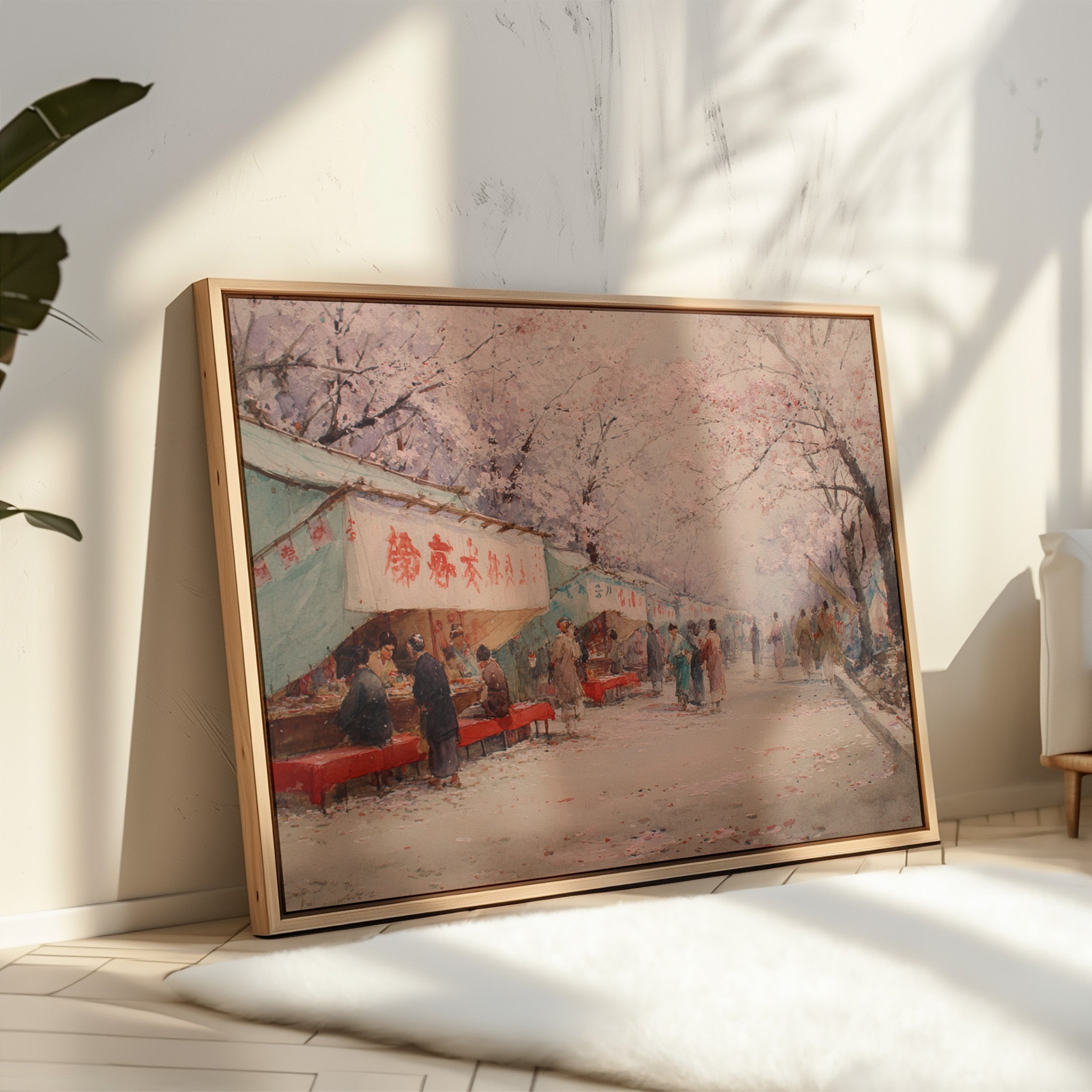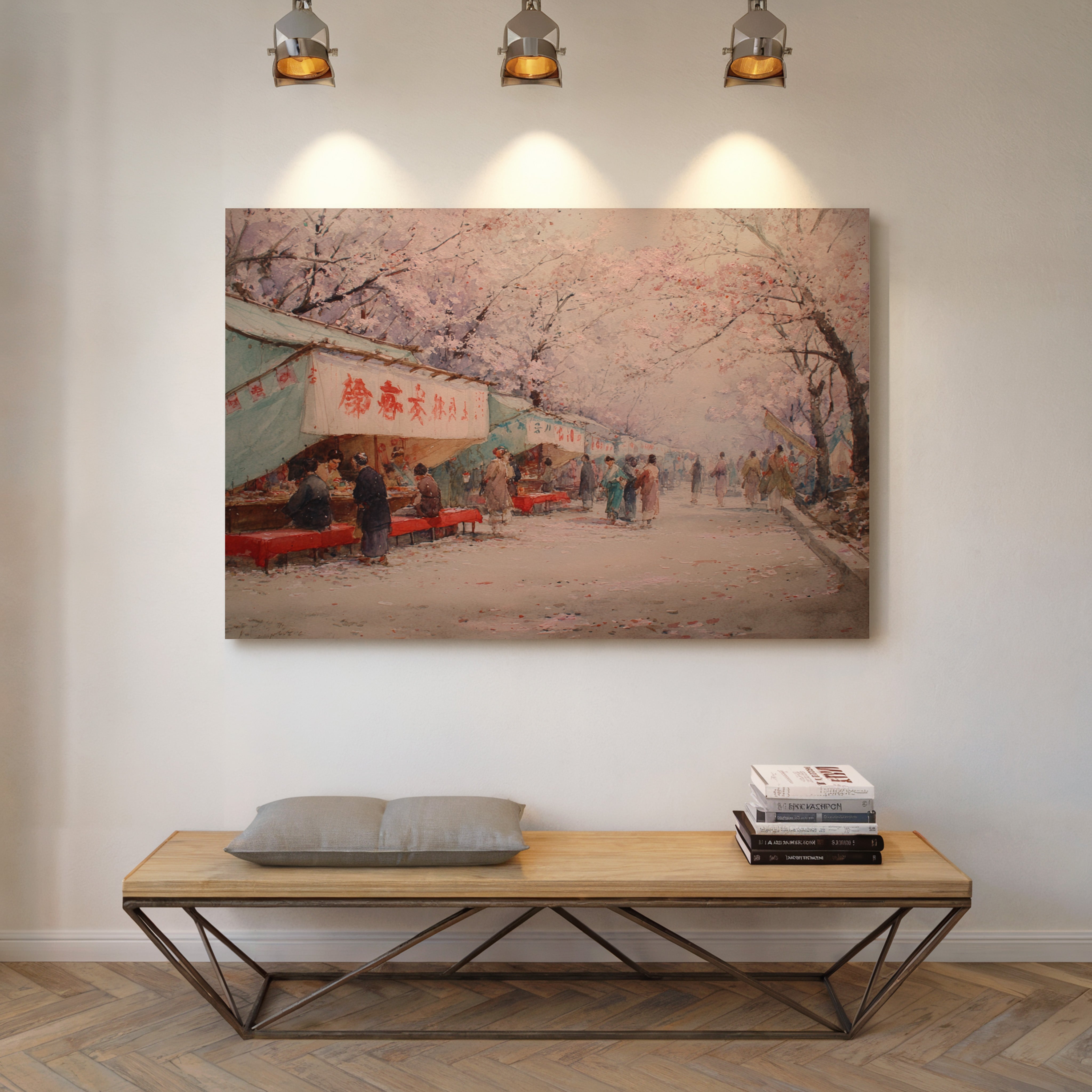 Soft pink petals drift like snow over a bustling Japanese street market, where canvas awnings create a gentle rhythm along the path. Watercolor hues blend the scene into a dreamy narrative, capturing vendors and shoppers in traditional dress beneath the canopy of spring. The delicate balance of turquoise market stalls against coral-tinted signage speaks to the careful orchestration of daily life, while fallen blossoms dust the ground in nature's confetti. This scene would bring a sense of cultural richness and seasonal poetry to a dining room or reading nook, where its gentle palette can inspire moments of quiet contemplation.