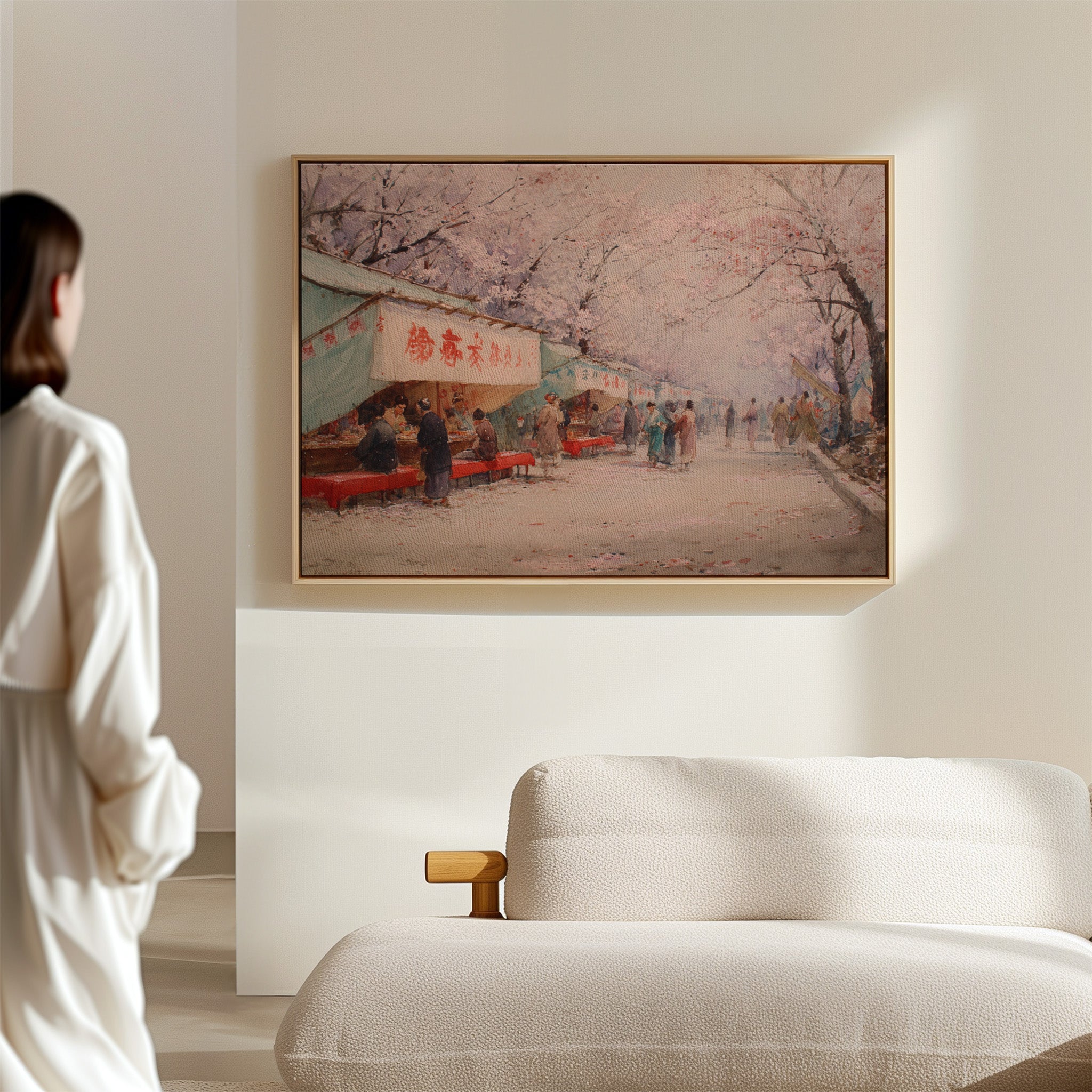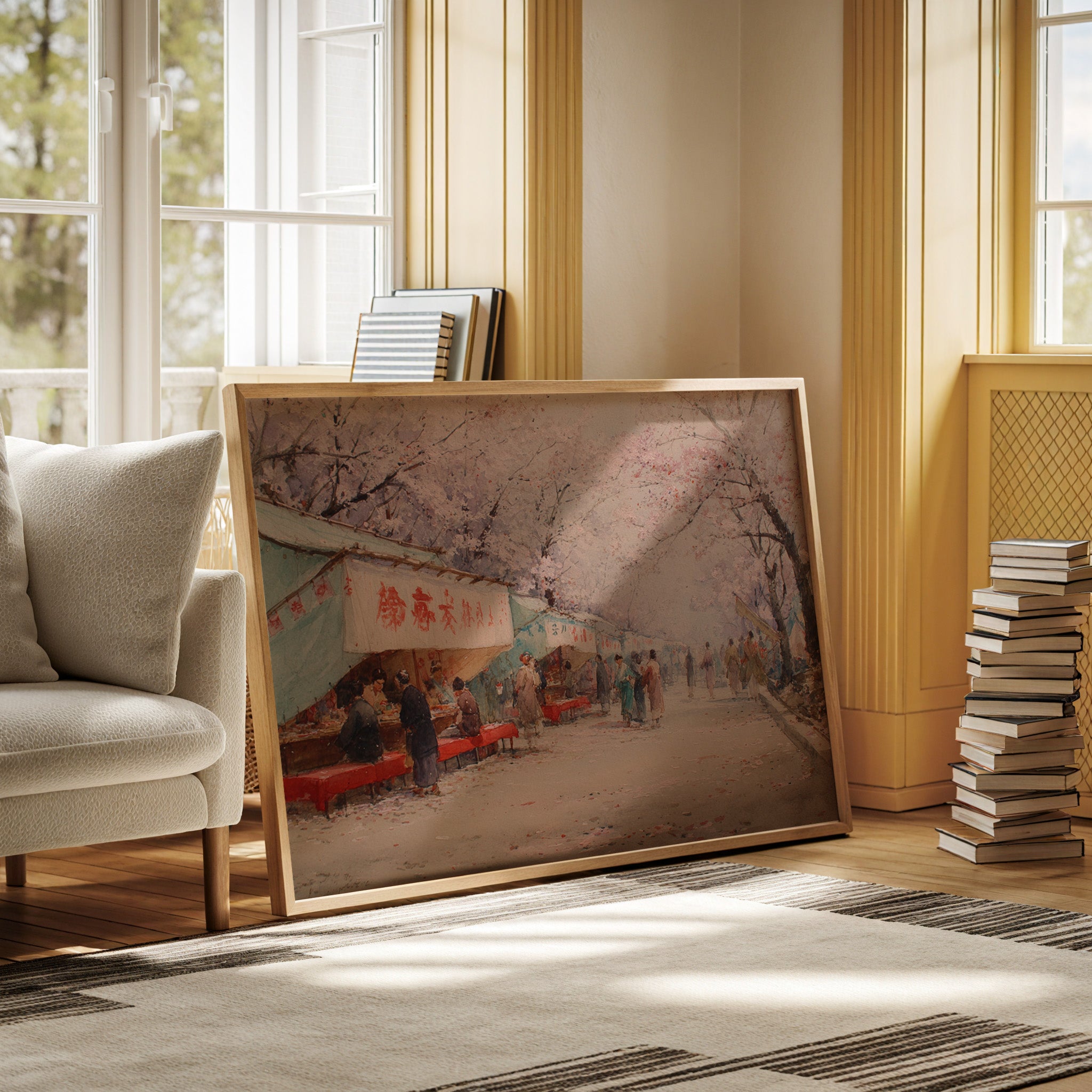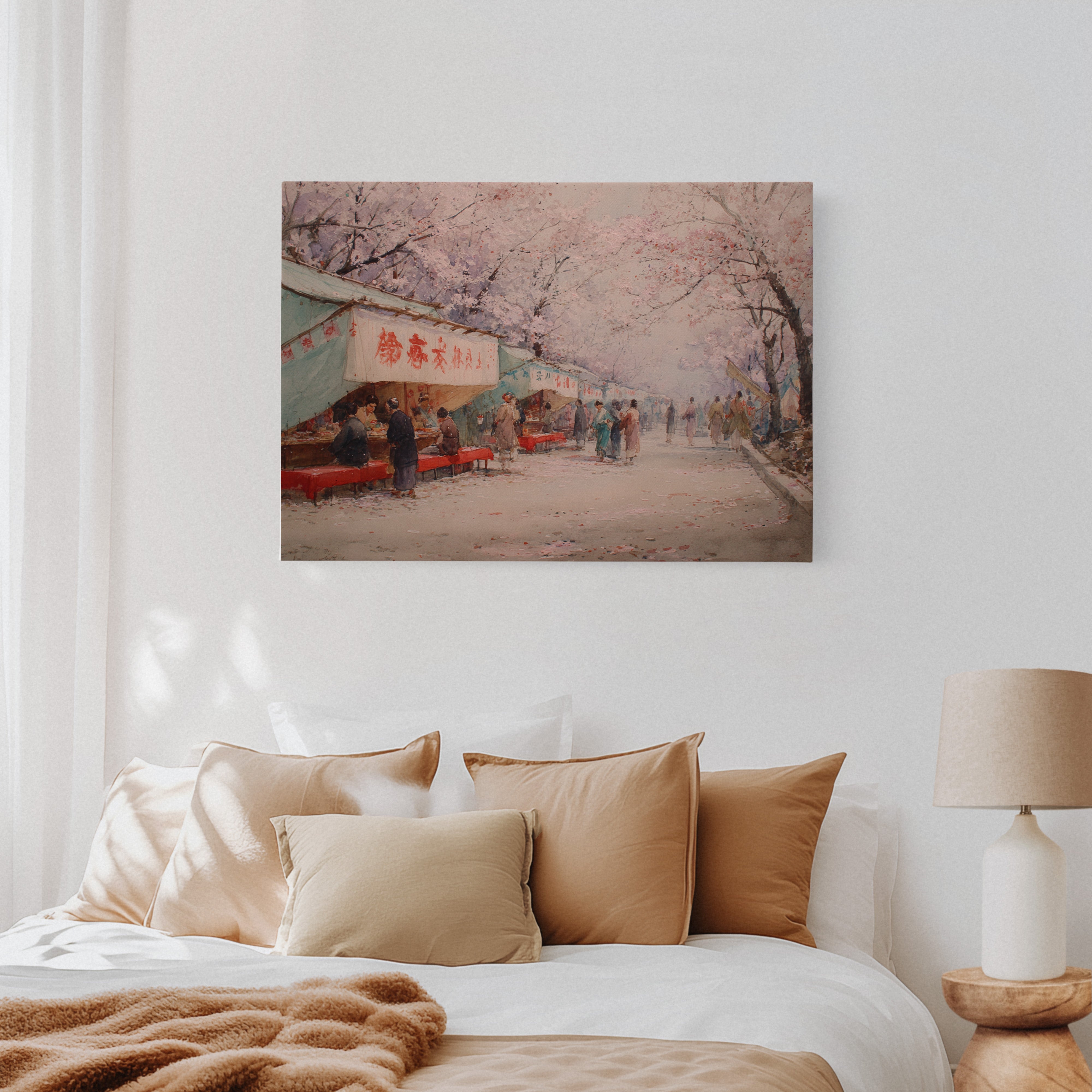 Soft pink petals drift like snow over a bustling Japanese street market, where canvas awnings create a gentle rhythm along the path. Watercolor hues blend the scene into a dreamy narrative, capturing vendors and shoppers in traditional dress beneath the canopy of spring. The delicate balance of turquoise market stalls against coral-tinted signage speaks to the careful orchestration of daily life, while fallen blossoms dust the ground in nature's confetti. This scene would bring a sense of cultural richness and seasonal poetry to a dining room or reading nook, where its gentle palette can inspire moments of quiet contemplation.