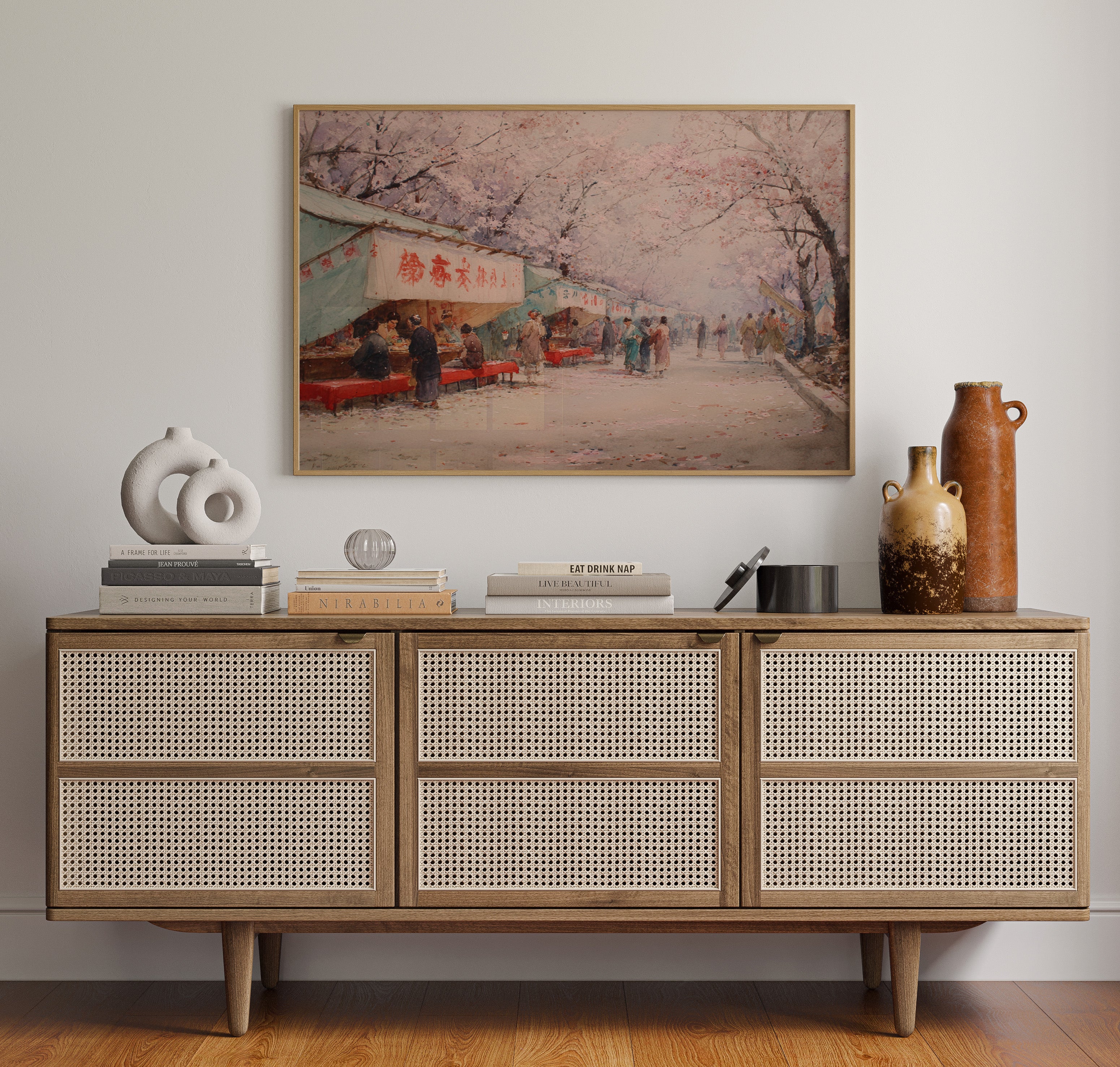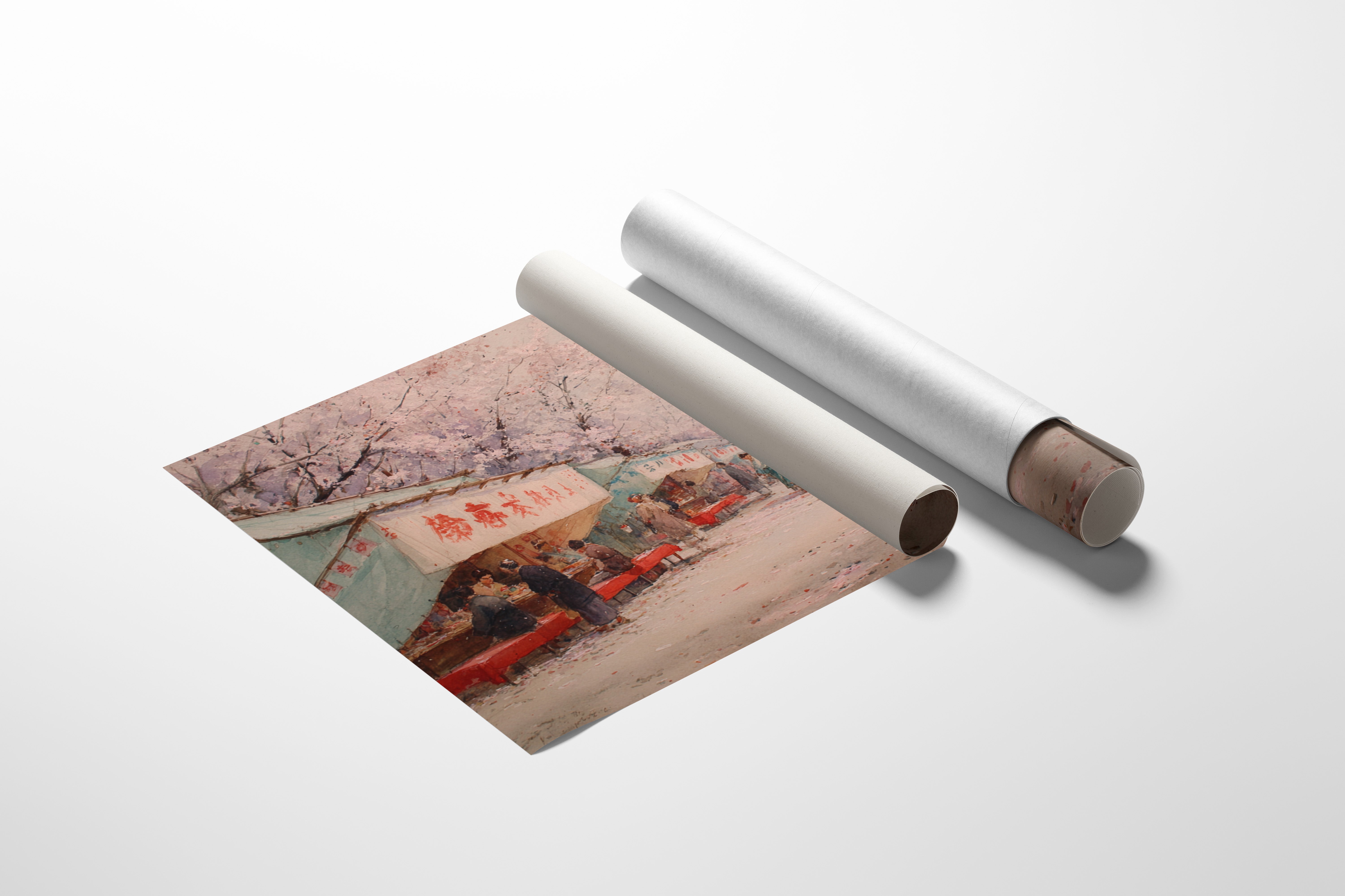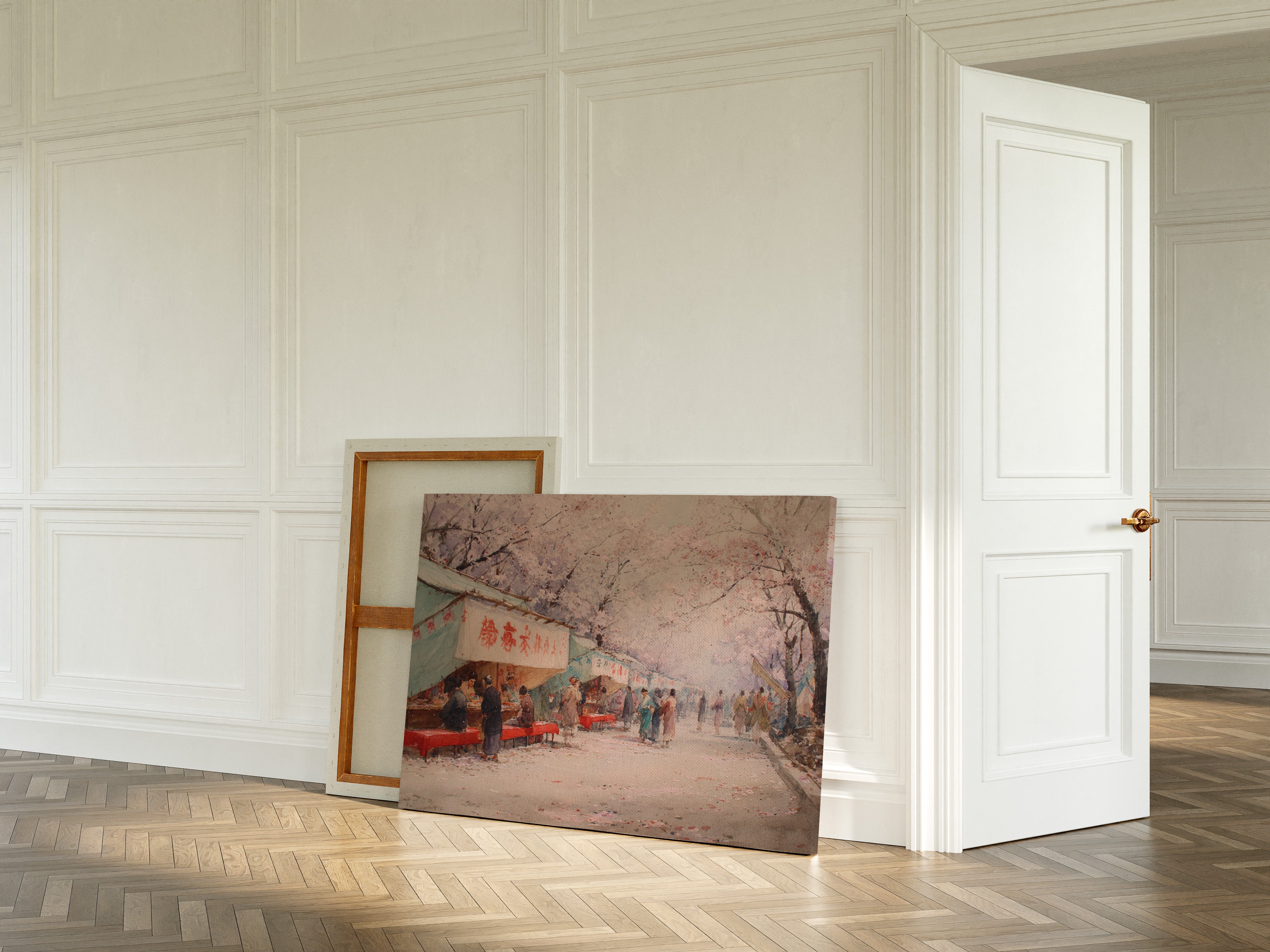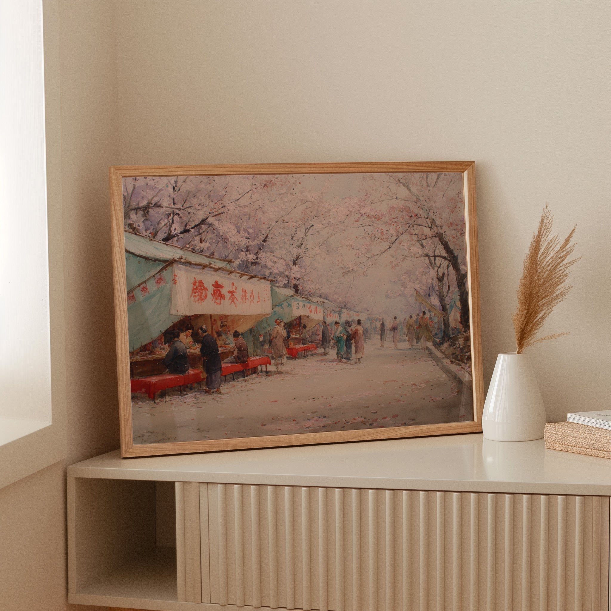 Soft pink petals drift like snow over a bustling Japanese street market, where canvas awnings create a gentle rhythm along the path. Watercolor hues blend the scene into a dreamy narrative, capturing vendors and shoppers in traditional dress beneath the canopy of spring. The delicate balance of turquoise market stalls against coral-tinted signage speaks to the careful orchestration of daily life, while fallen blossoms dust the ground in nature's confetti. This scene would bring a sense of cultural richness and seasonal poetry to a dining room or reading nook, where its gentle palette can inspire moments of quiet contemplation.