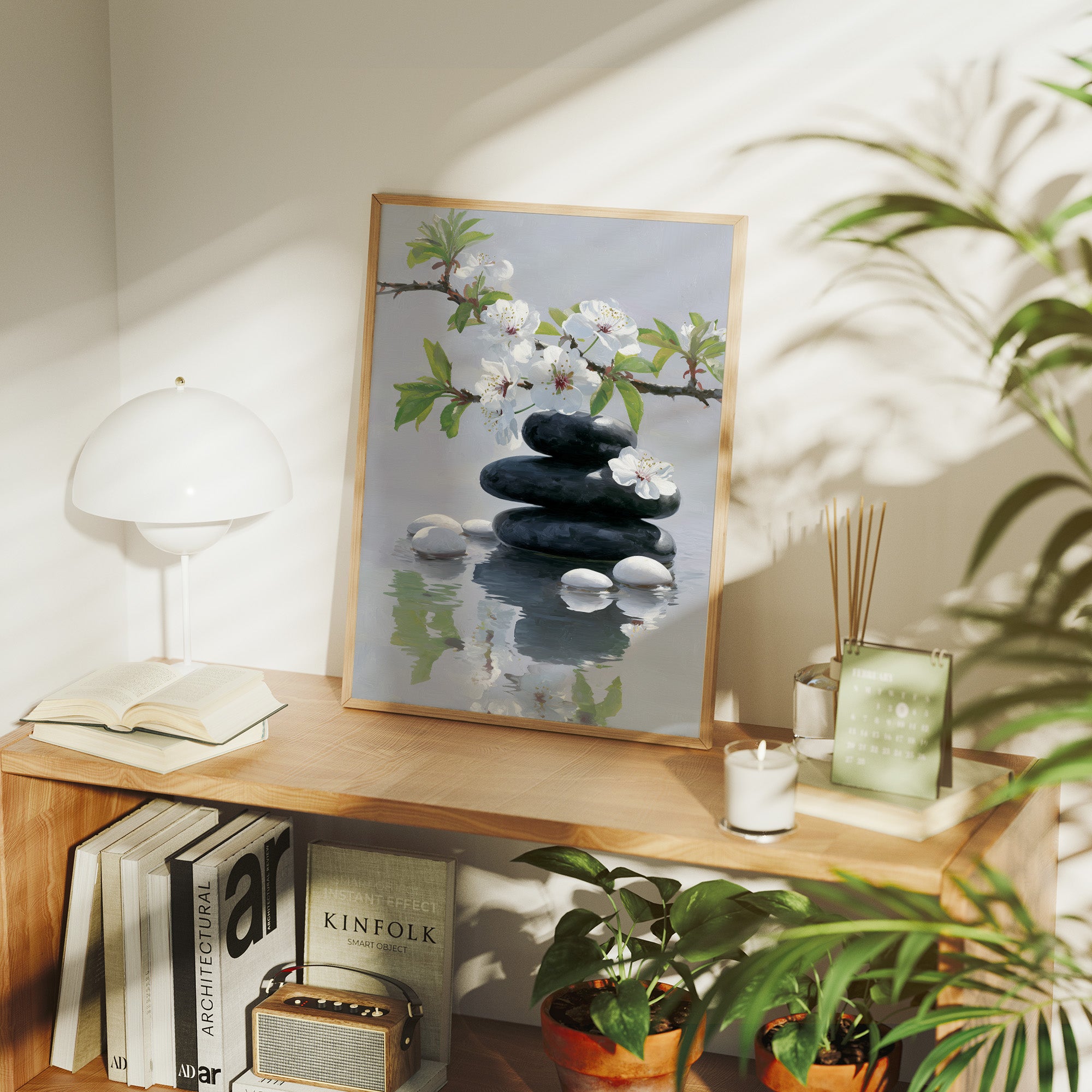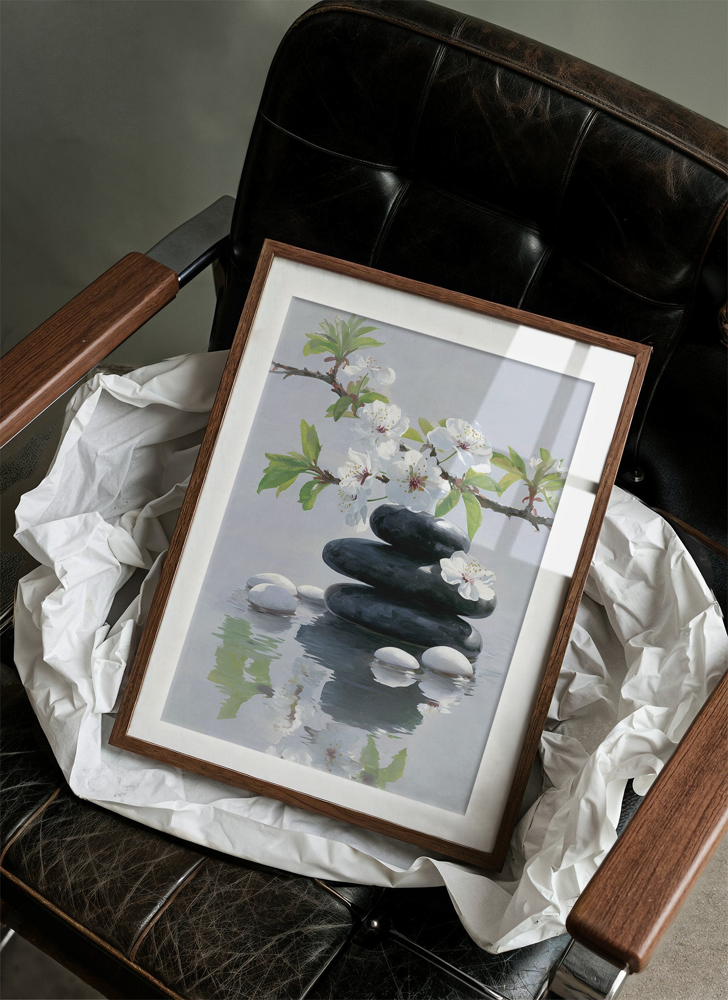 Delicate white petals hover like butterflies over tranquil waters, creating a moment of perfect serenity. Dark stones rise from the reflective surface in peaceful harmony, while tender green leaves add subtle vitality to the ethereal scene. The composition speaks to the meeting of strength and grace, where hard elements of stone merge with the ephemeral beauty of spring blooms. This piece would bring a sense of calm sophistication to a modern meditation room or create a peaceful focal point in a minimalist bedroom suite.