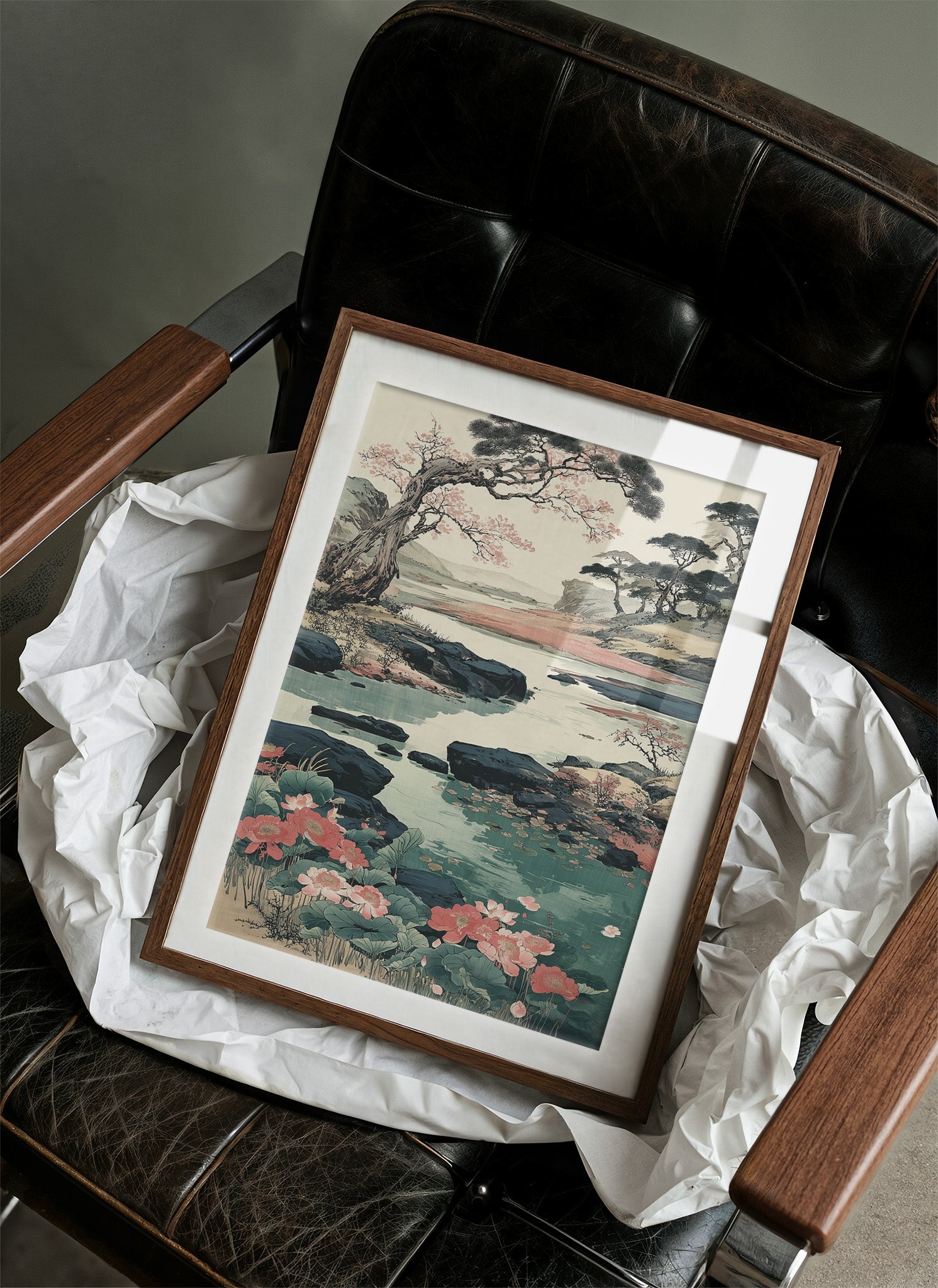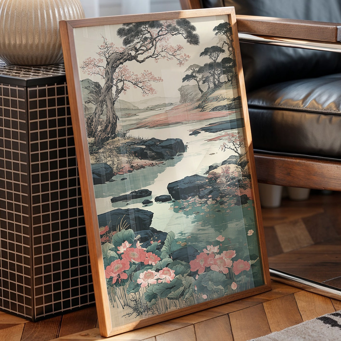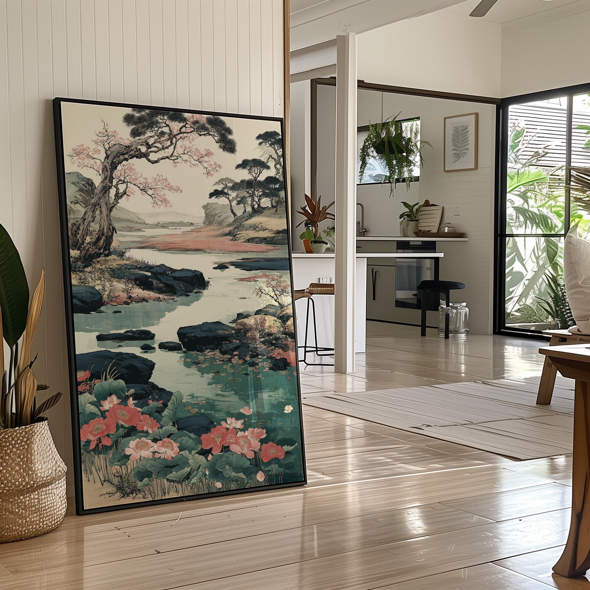 Soft coral blooms scatter across a serene Japanese landscape, where ancient pines bend gracefully over crystalline waters. The scene captures a perfect moment of harmony between flowing water, weathered rocks, and delicate cherry blossoms, painted in traditional sumi-e style with modern color sensibilities. Turquoise waters wind through dark rocky shores, while distant mountains fade into misty horizons, creating a peaceful narrative of nature's eternal cycle. This piece brings tranquility to any modern living space, particularly suited for a reading nook or meditation room where its calming energy can be fully appreciated.