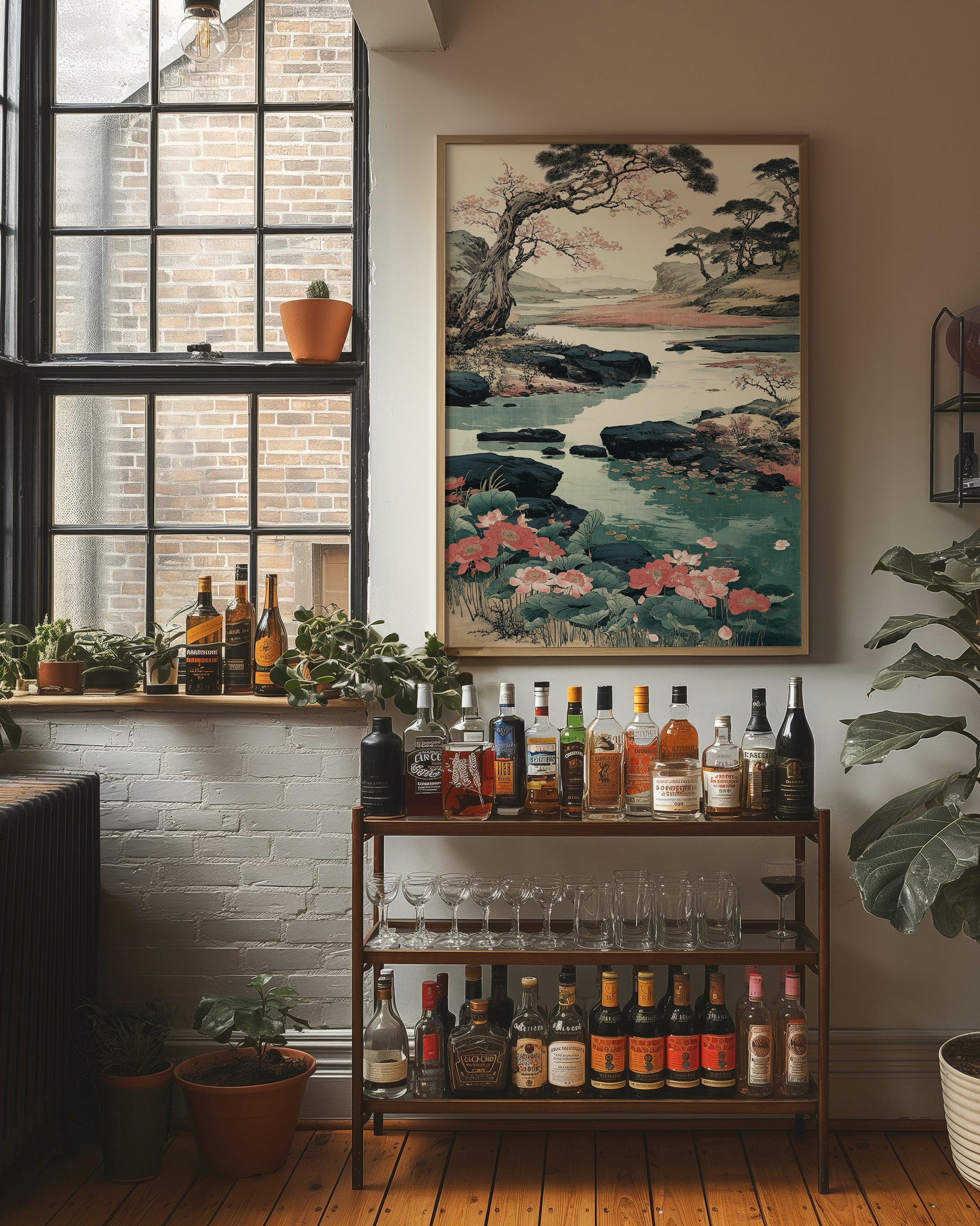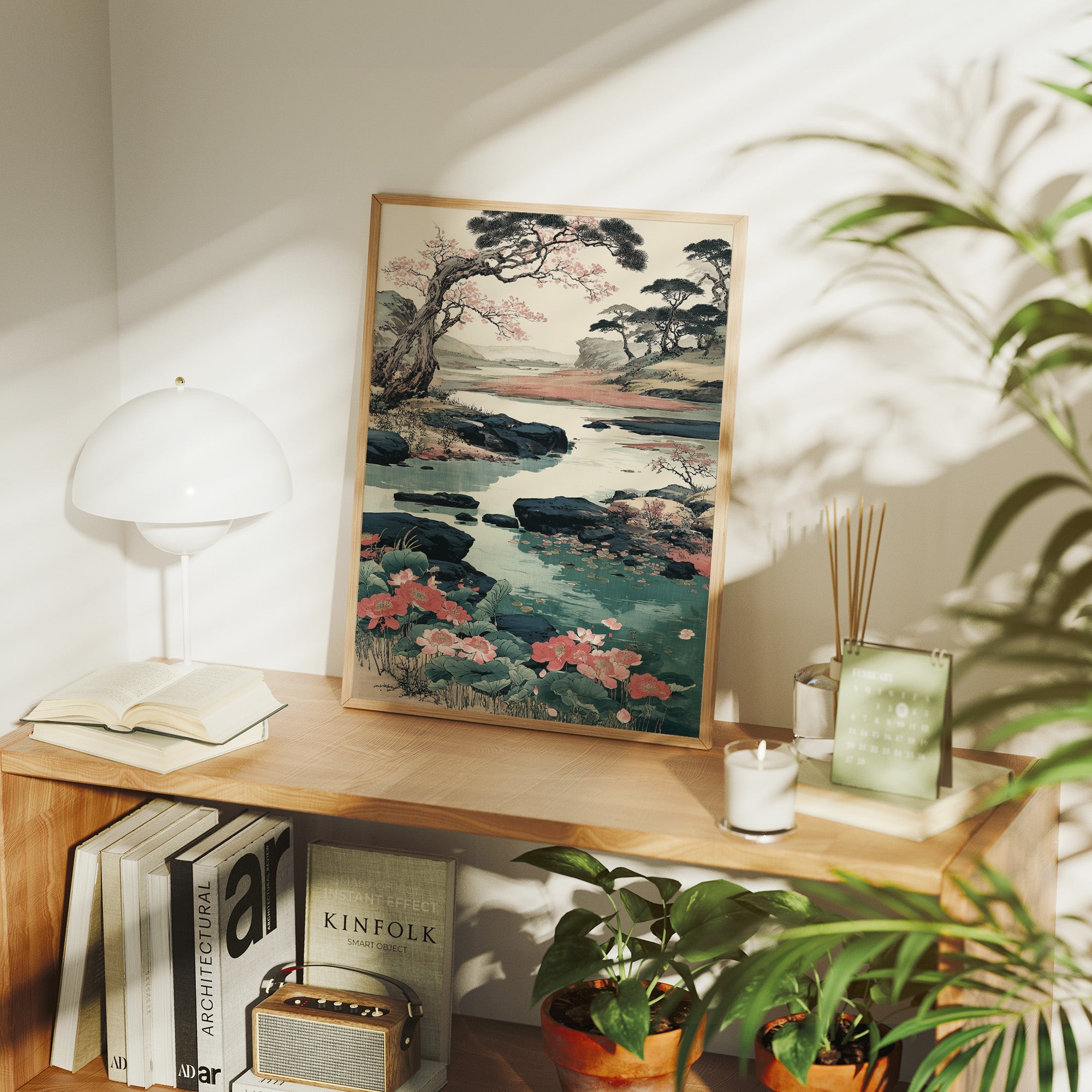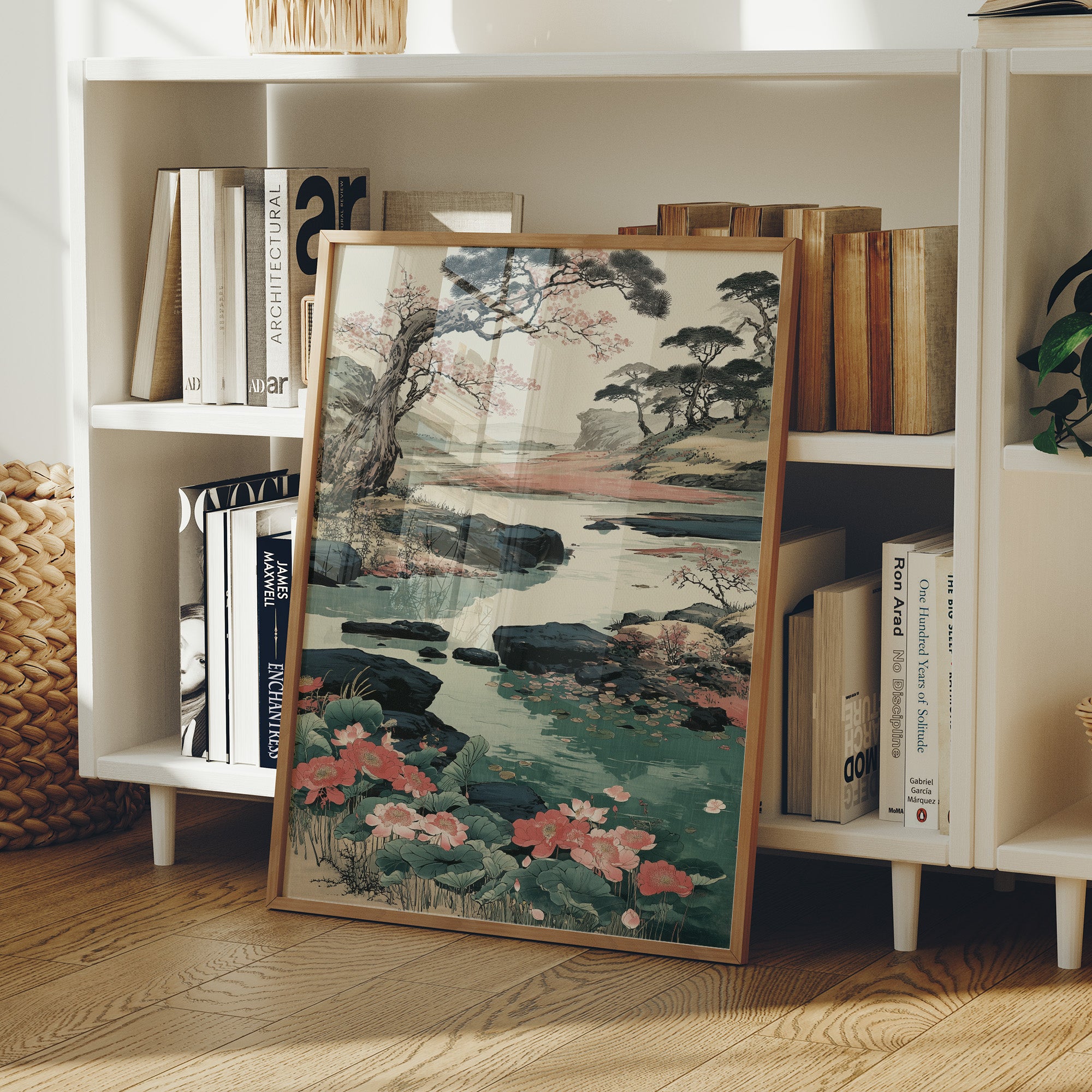 Soft coral blooms scatter across a serene Japanese landscape, where ancient pines bend gracefully over crystalline waters. The scene captures a perfect moment of harmony between flowing water, weathered rocks, and delicate cherry blossoms, painted in traditional sumi-e style with modern color sensibilities. Turquoise waters wind through dark rocky shores, while distant mountains fade into misty horizons, creating a peaceful narrative of nature's eternal cycle. This piece brings tranquility to any modern living space, particularly suited for a reading nook or meditation room where its calming energy can be fully appreciated.