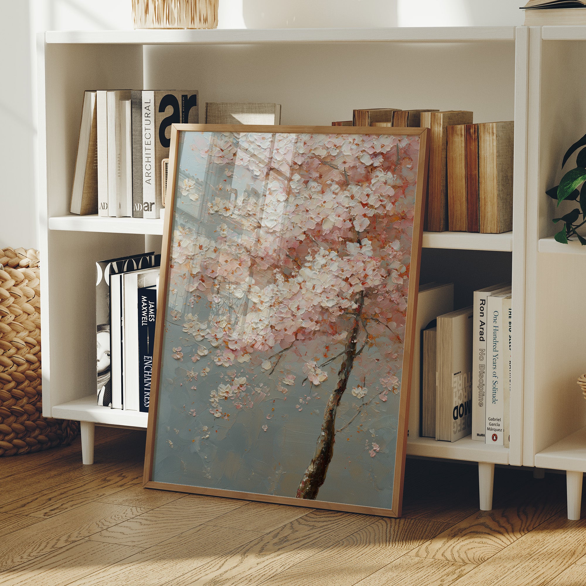 Delicate pink petals cascade across a misty blue-grey backdrop, capturing the ethereal beauty of spring's first awakening. The textured brushstrokes create a dimensional quality, with pale blossoms seeming to float and drift through space like memories of warmer days. The wooden frame adds warmth to the piece, complementing the soft palette while grounding the dreamy composition in earthy elegance. This piece brings serenity to a modern living space, perfect for creating a contemplative corner where contemporary meets nature-inspired design.