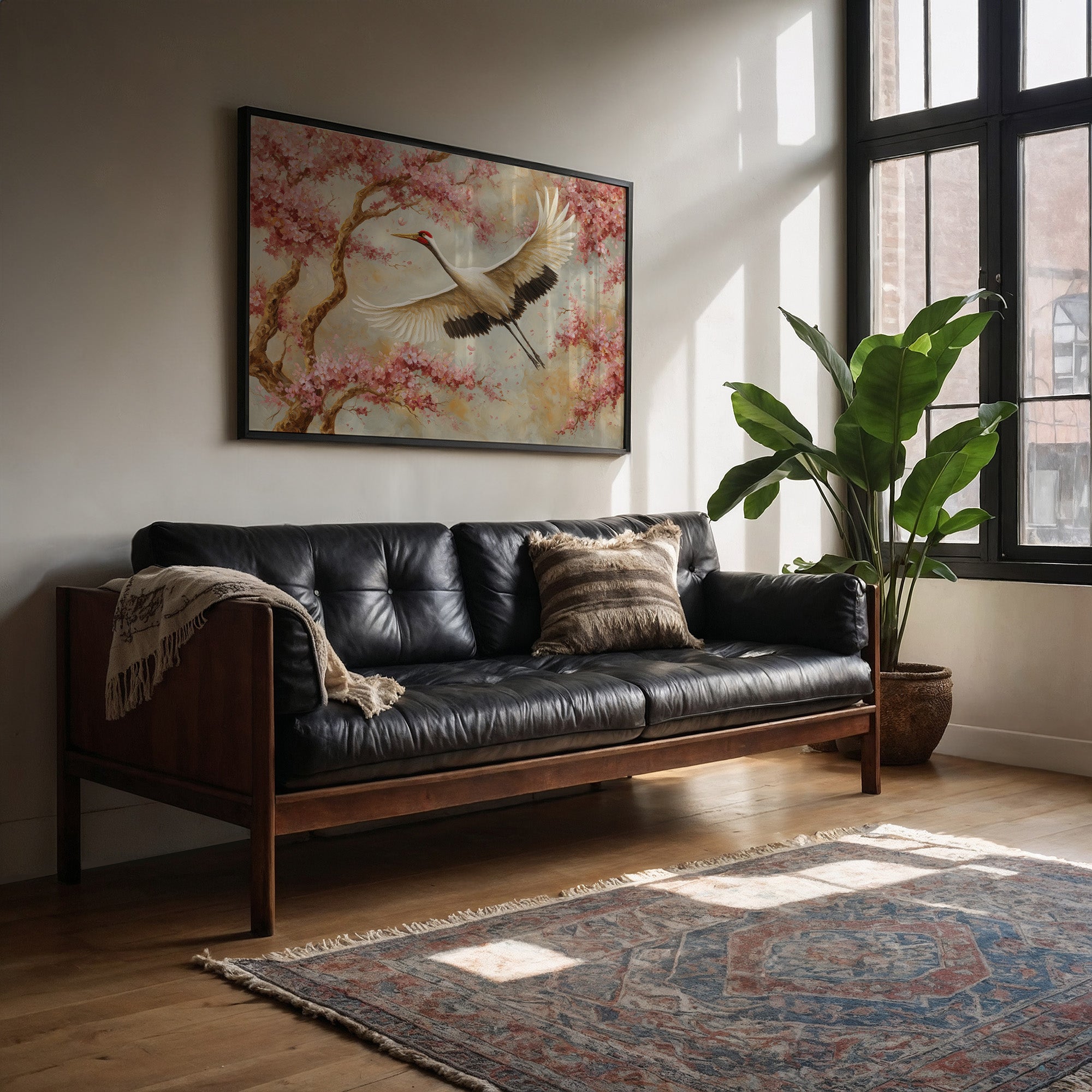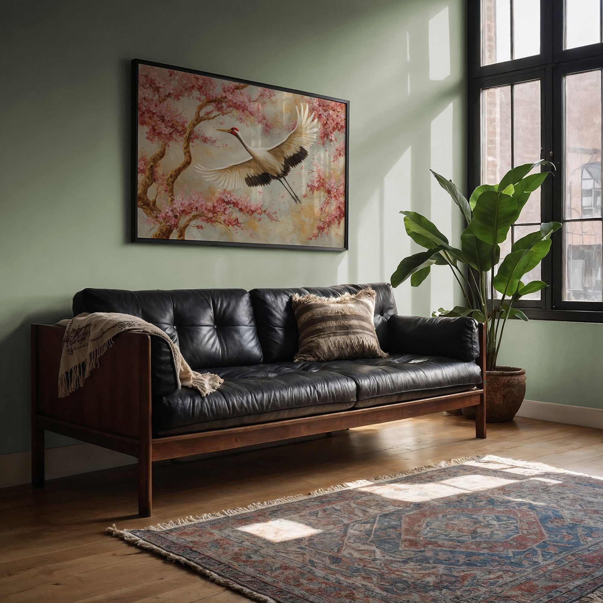 Golden afternoon light streams across a peaceful scene, casting delicate shadows of indoor plants while illuminating a striking artwork. The painting captures a majestic crane in mid-flight, its wings spread wide against a backdrop of blooming cherry blossoms, creating a harmonious dance between strength and delicacy. Rich coral pink petals swirl through a misty golden atmosphere, while the crane's precise brushstrokes convey both movement and serenity. This piece brings tranquil Asian-inspired elegance to a reading nook, meditation space, or any room seeking a balance of nature's dynamic beauty and peaceful contemplation.