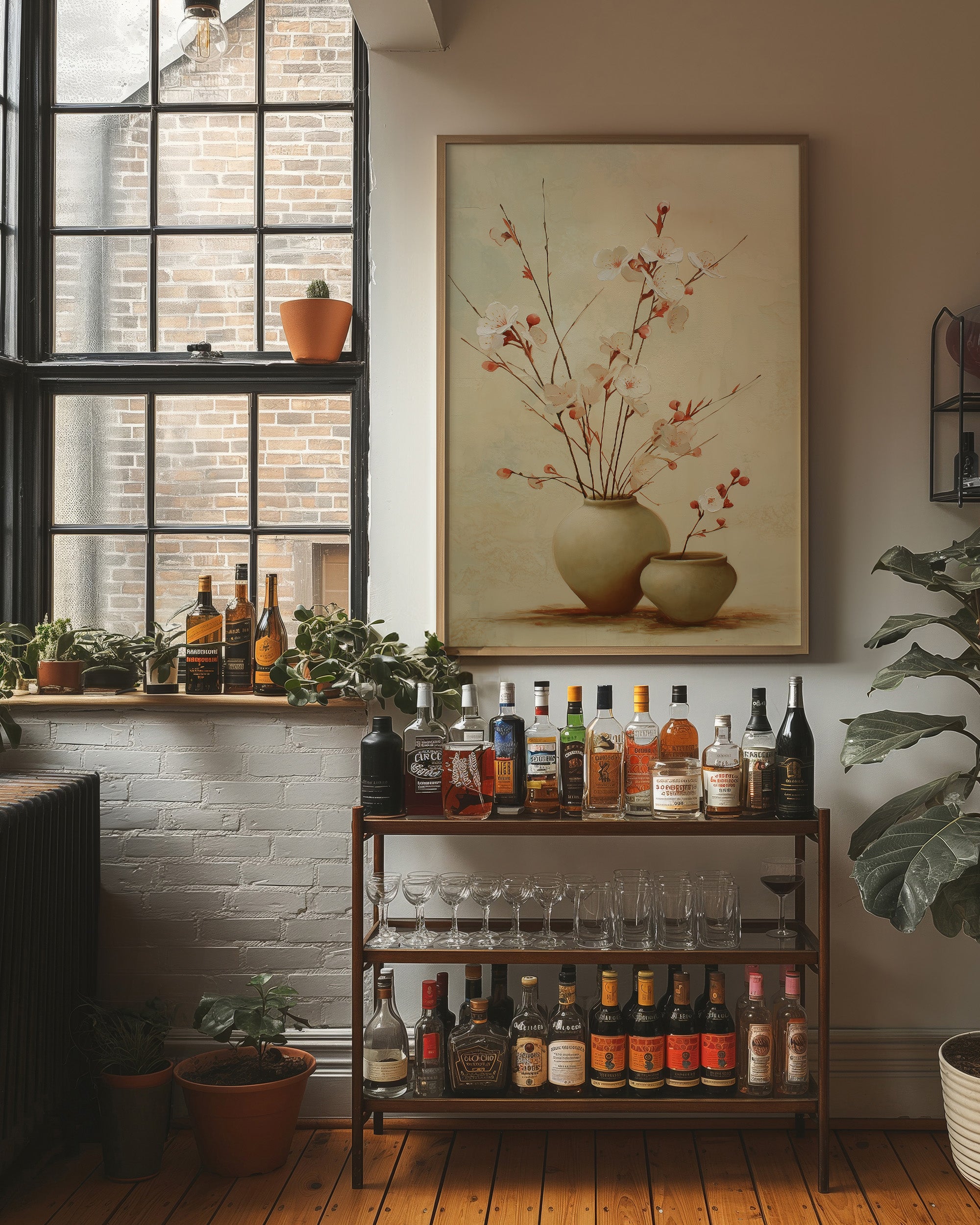 Delicate pink cherry blossoms reach skyward from rustic clay vessels, their stems creating an elegant dance against soft, filtered light. The earthy ceramics ground the ethereal blooms in a study of contrast - rough meets refined, permanent meets fleeting. Window light casts gentle shadows across the scene, creating a serene moment that captures the essence of contemplative stillness. This piece would bring quiet sophistication to a reading nook, bedroom, or any space where you seek to create a sense of peaceful reflection.