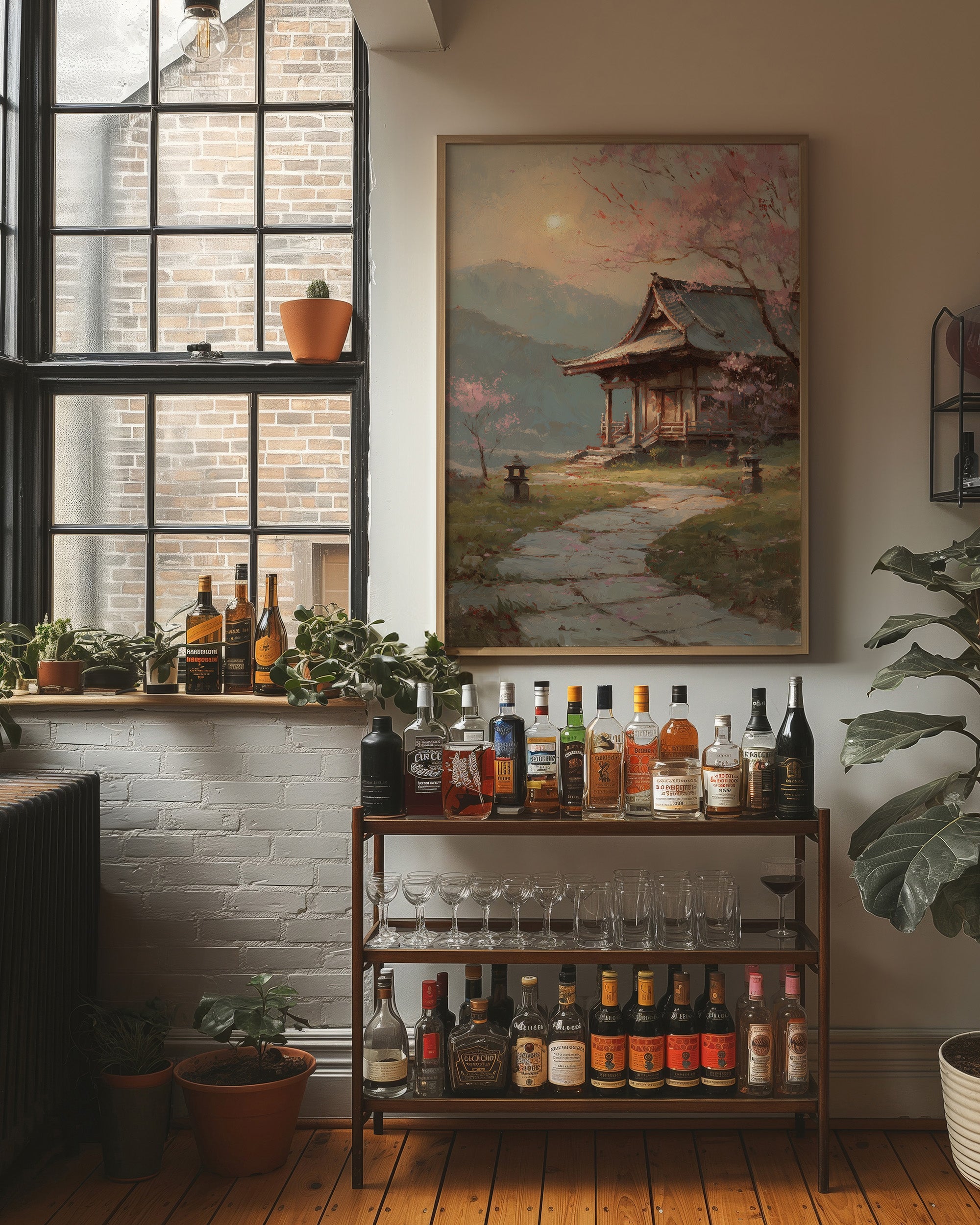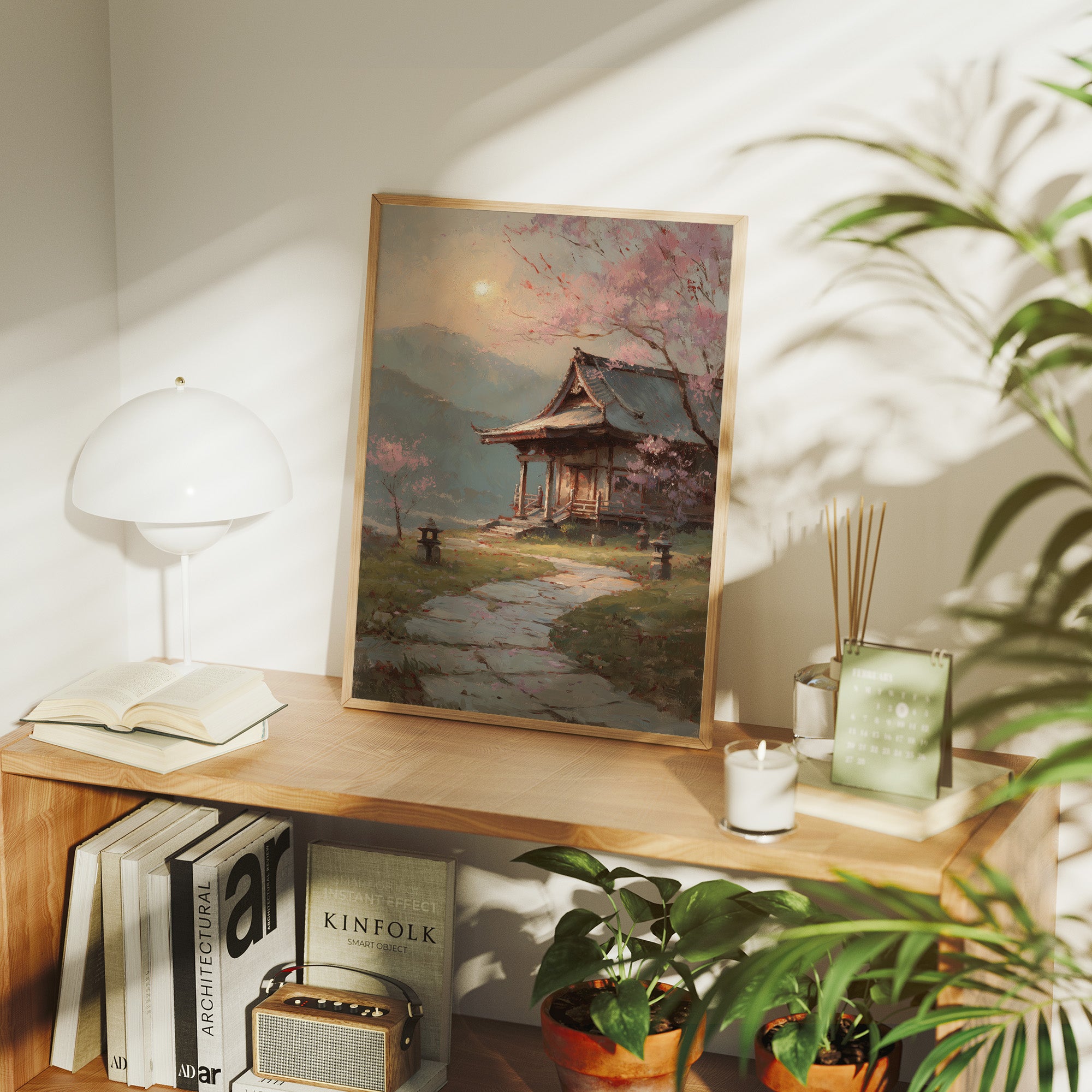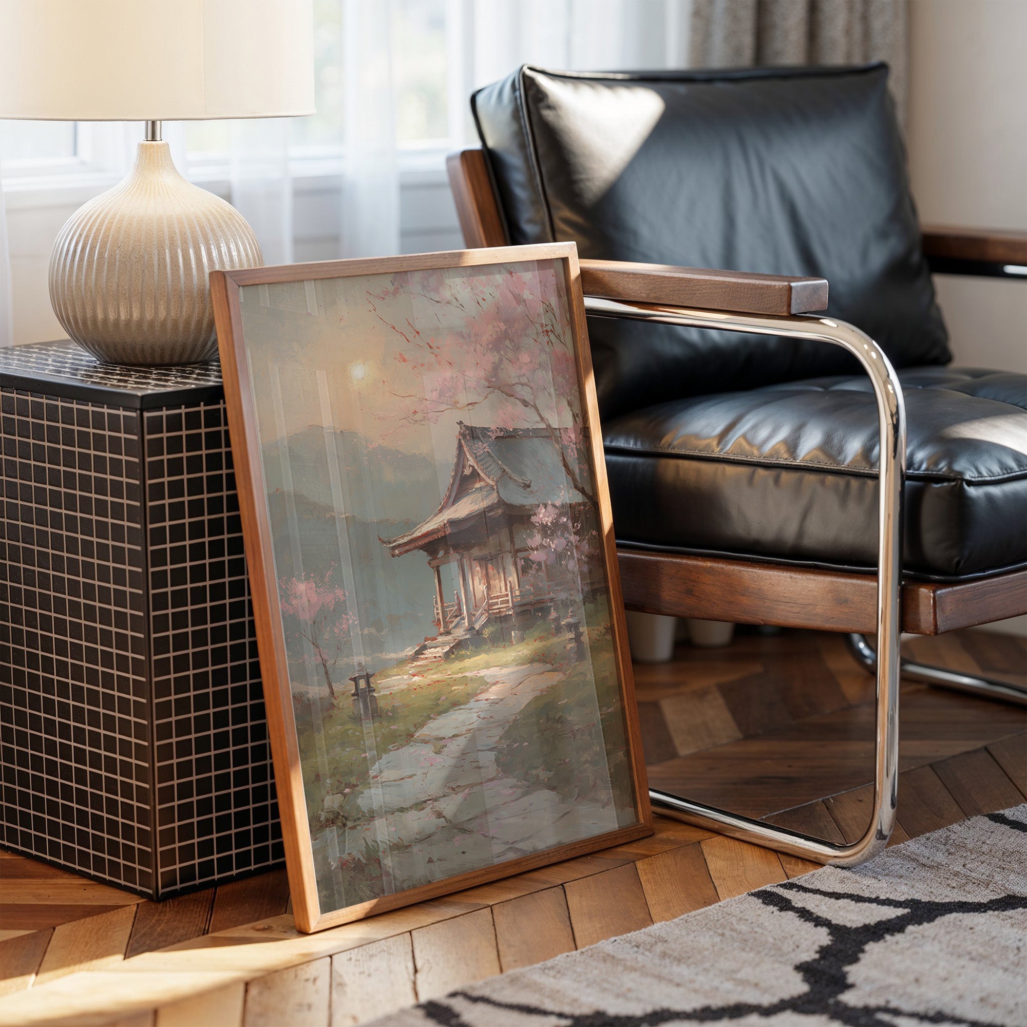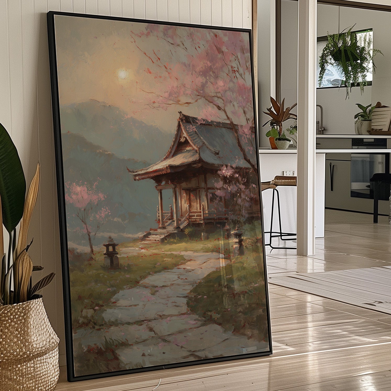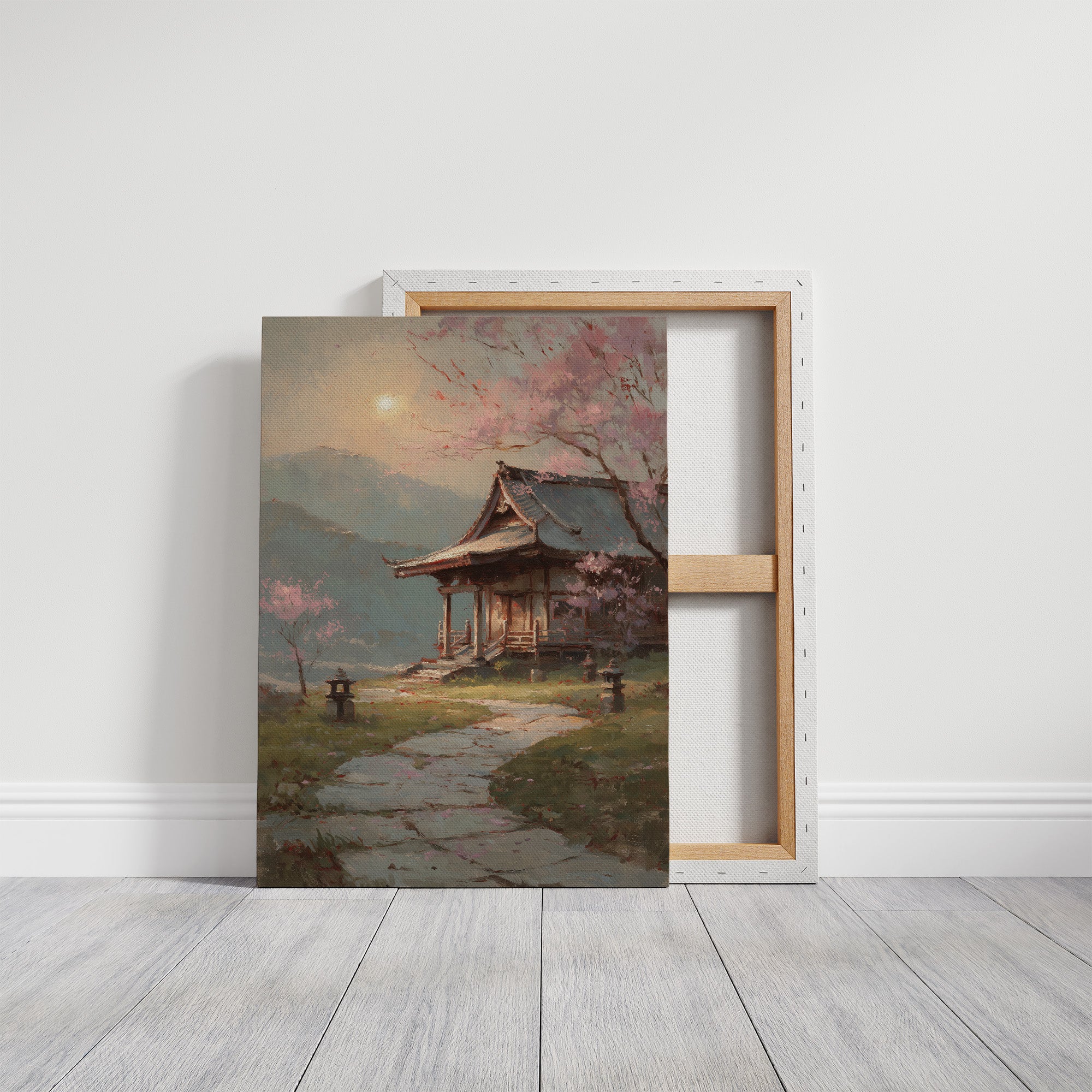 Delicate pink petals dance against misty skies, creating a dreamy veil over a traditional Japanese temple garden. Stone lanterns stand sentinel along the winding path, their quiet presence grounding the ethereal scene in ancient tradition. The weathered wooden architecture of the temple pavilion emerges through the spring haze, its graceful lines echoing the natural curves of the cherry branches above. This tranquil scene would bring serene elegance to a reading nook, meditation space, or any room where you seek to create a sense of peaceful contemplation.