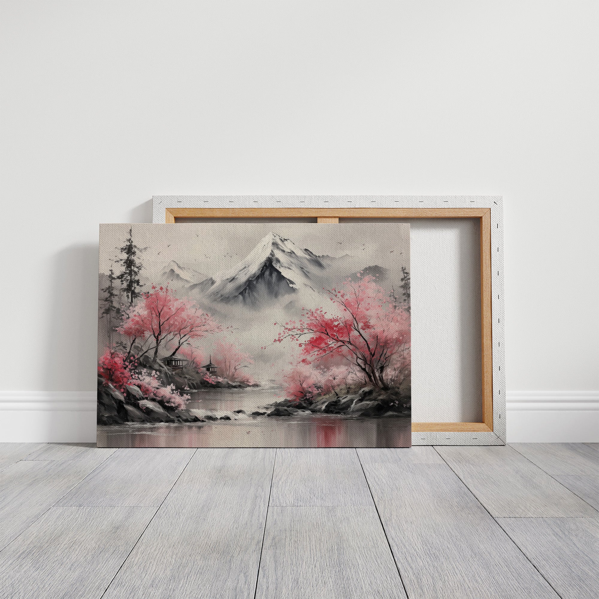 Delicate pink cherry blossoms create a dreamy veil across a misty mountain landscape, their reflection dancing on still waters below. The dramatic contrast between the soft pink petals and stark mountain peaks tells a story of nature's divine balance, while a solitary temple stands as a silent witness to this eternal dance of seasons. This contemporary Asian-inspired piece brings serene sophistication to modern living spaces, perfect for creating a contemplative atmosphere in a minimalist living room or meditation space.