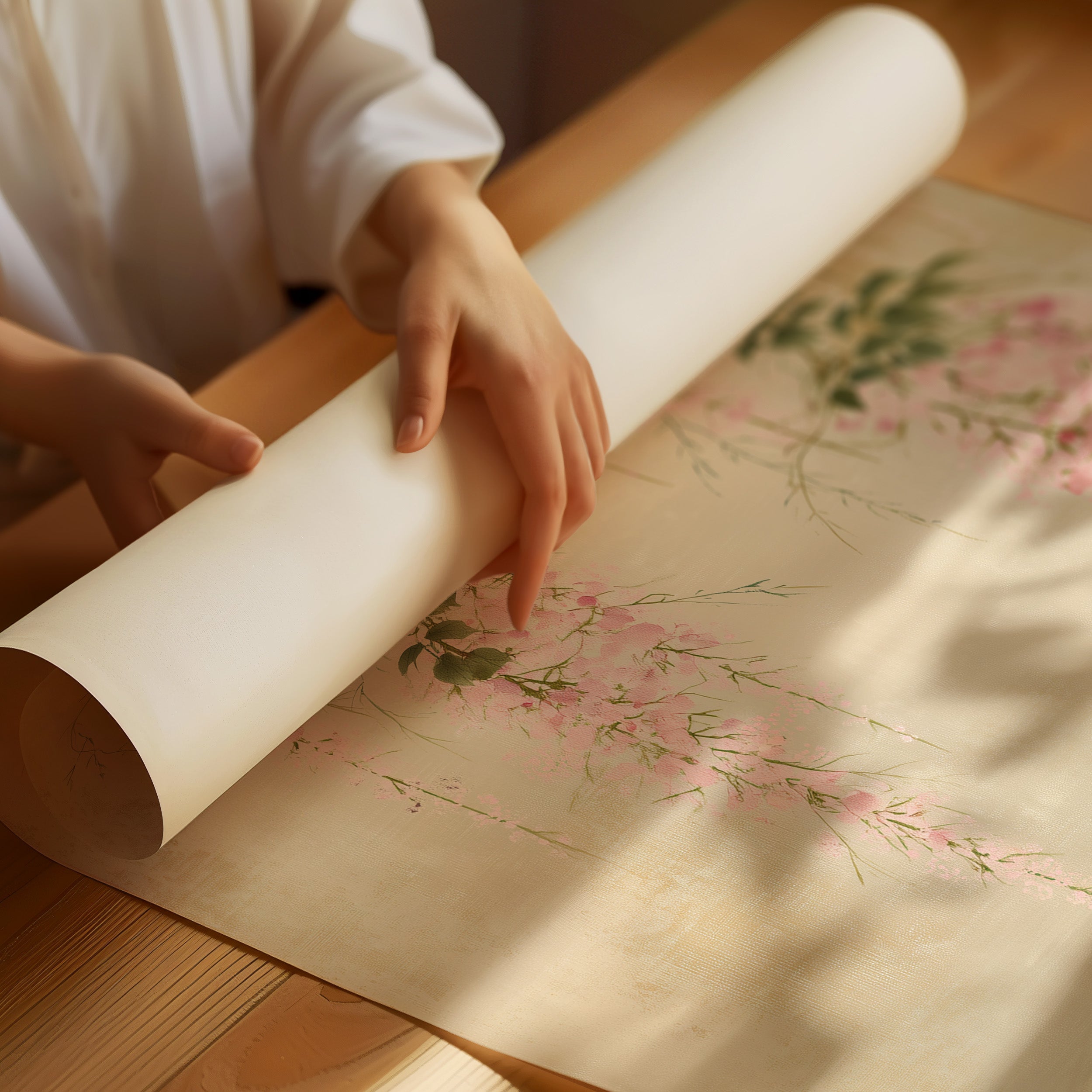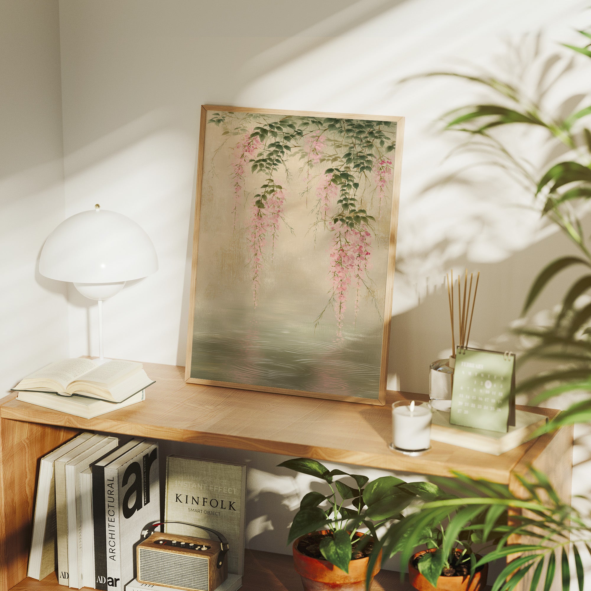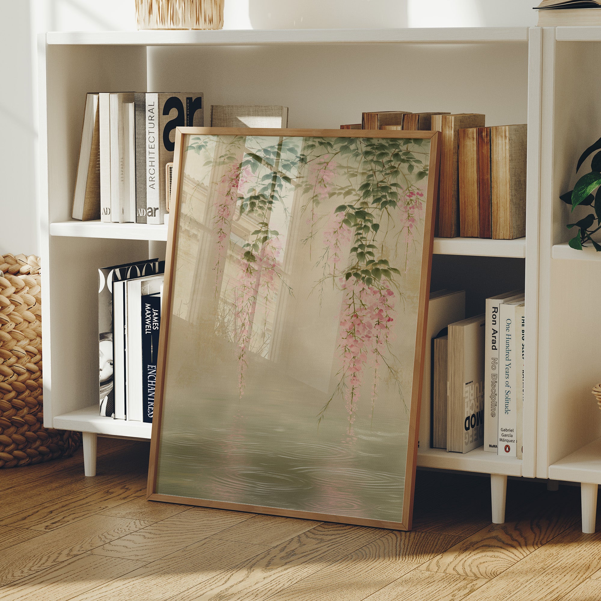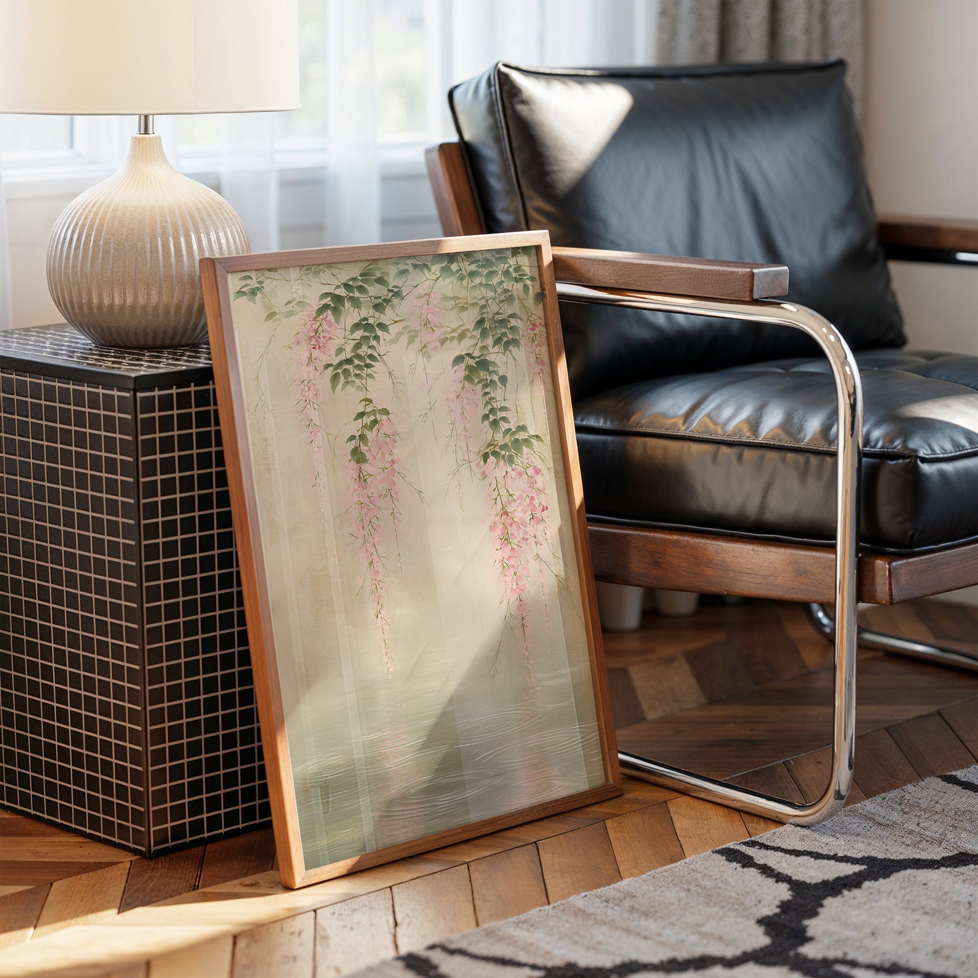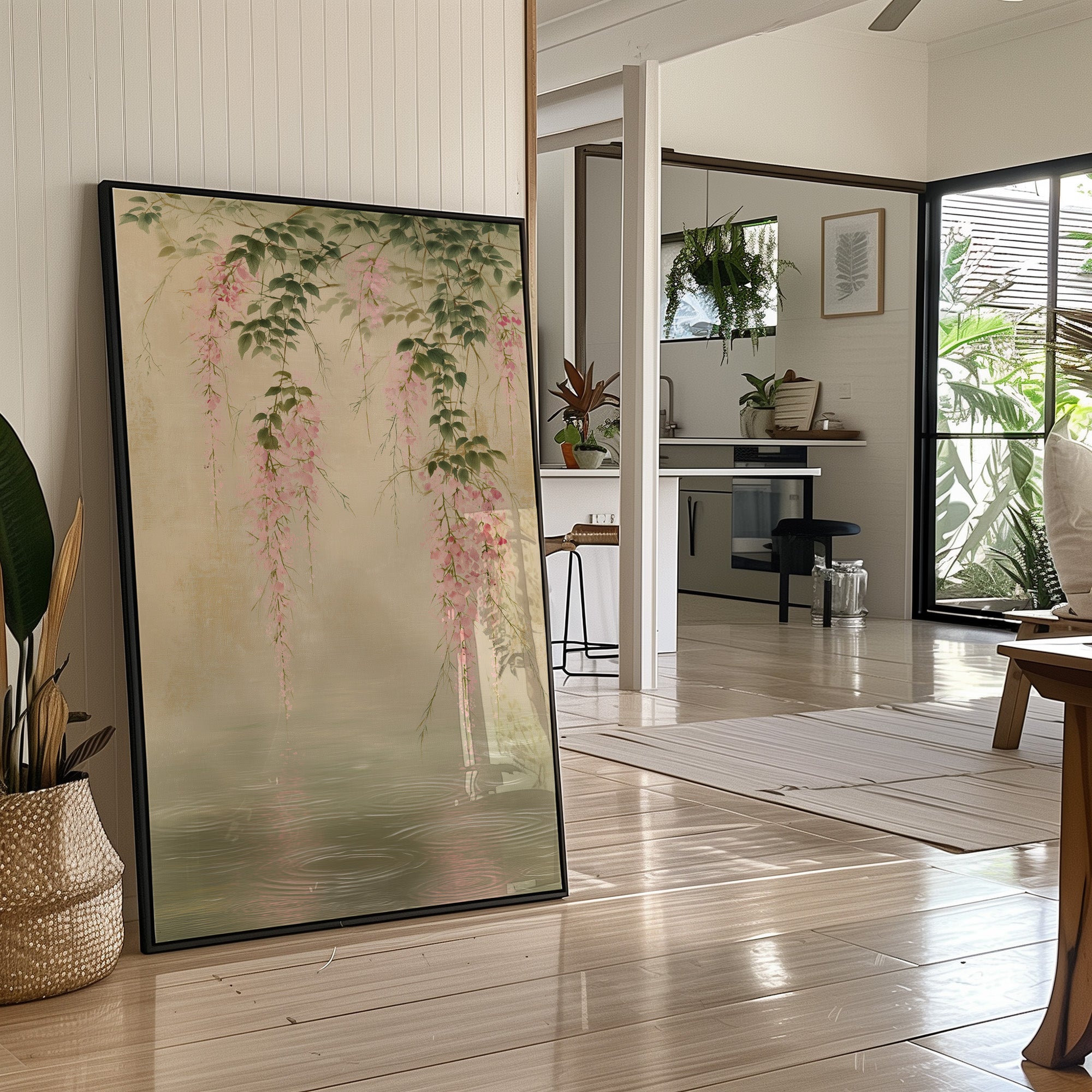 Delicate pink blooms cascade like nature's curtains, their reflection dancing on misty waters below. The composition captures the ethereal beauty of weeping cherry branches, their green leaves and rosy blossoms creating a gentle veil against a soft, neutral background. The traditional Asian-inspired artwork brings a sense of tranquility and grace, evoking the peaceful transition of seasons. This piece would bring serenity to a meditation room or create a calming focal point in a minimal bedroom space, where its subtle palette can inspire moments of quiet contemplation.