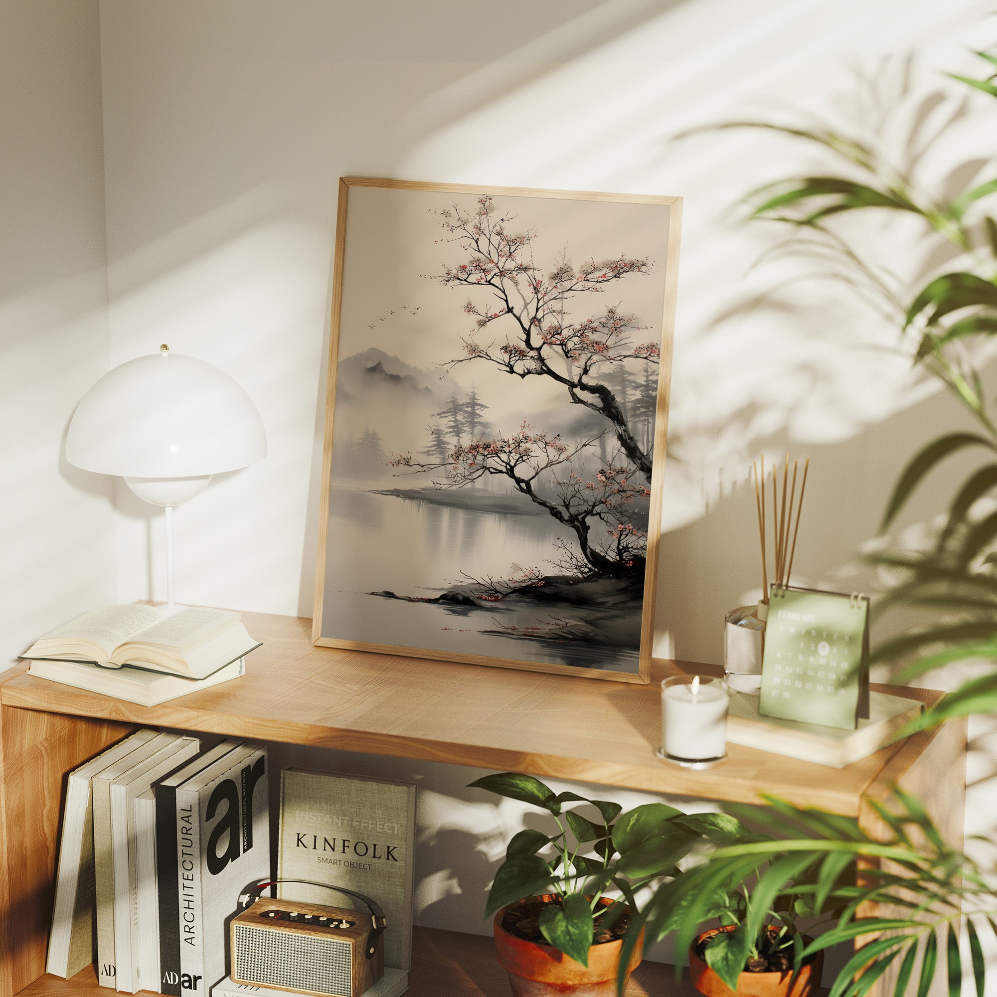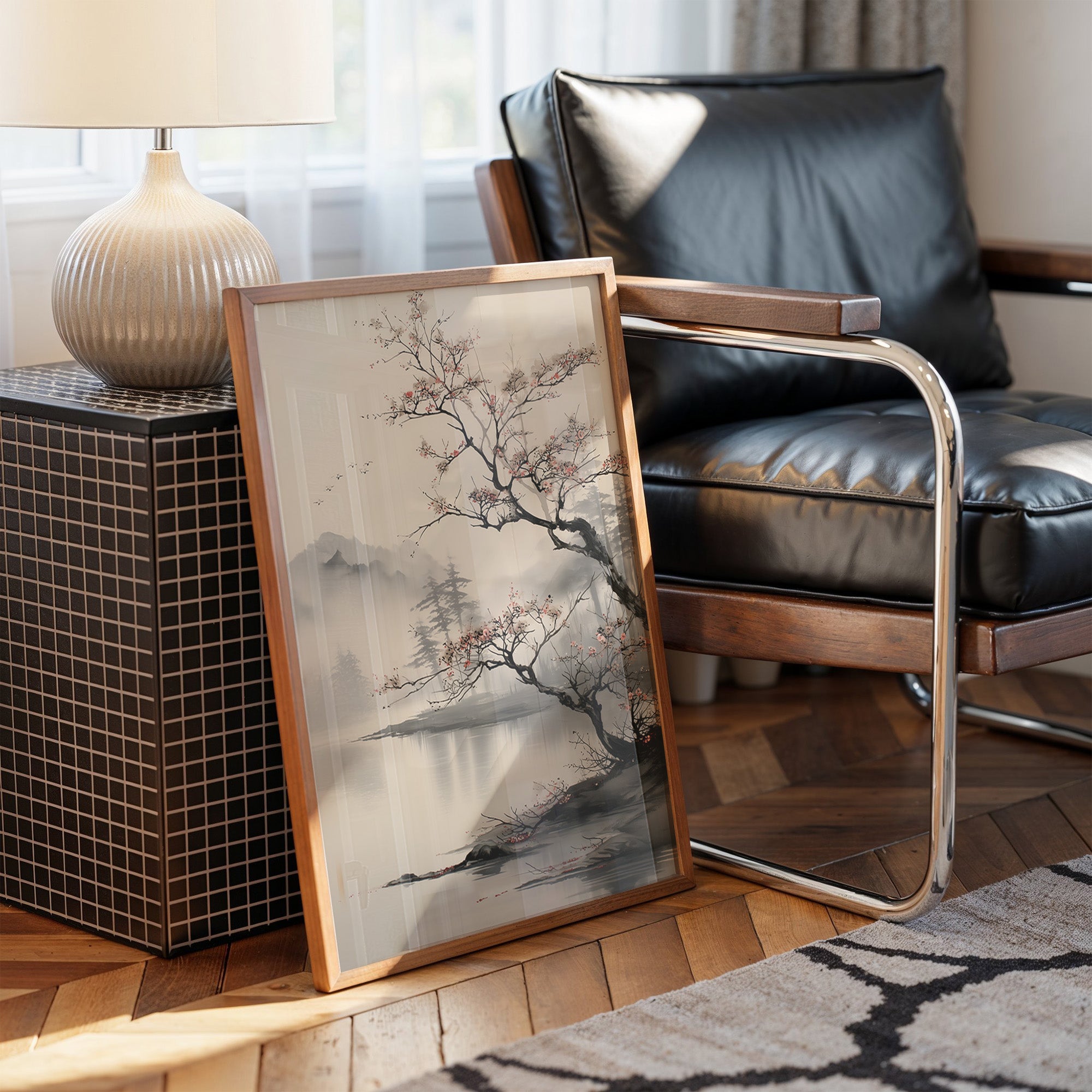 A serene Japanese landscape painting commands attention above a curated collection of spirits, creating an unexpected harmony between Eastern tranquility and modern mixology. The artwork's delicate cherry blossoms and misty mountains float ethereally above the lake, rendered in subtle grays and soft pink touches that tell a story of dawn's earliest moments. The composition's peaceful nature provides a sophisticated counterpoint to the urban bar setting, complete with industrial windows and exposed brick. This piece would elevate any contemporary home bar, dining room, or living space where sophisticated entertaining meets artistic expression.