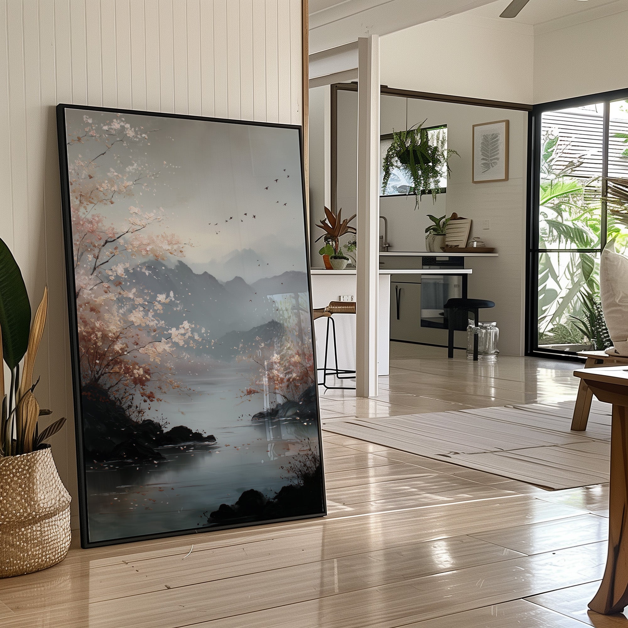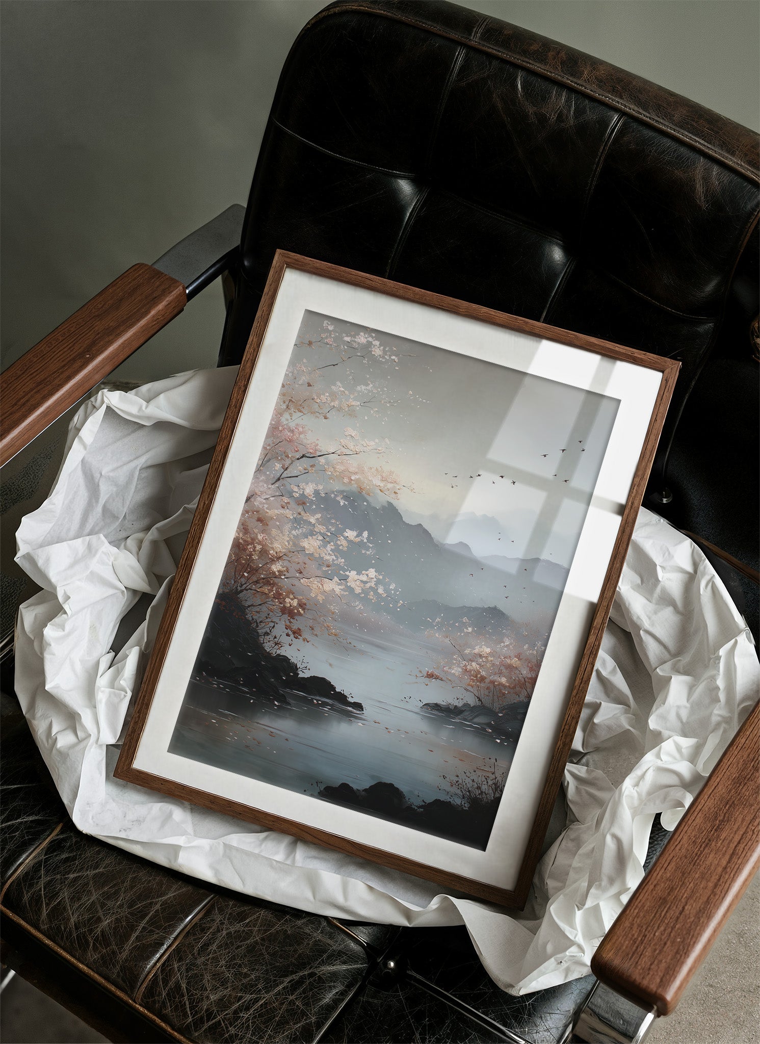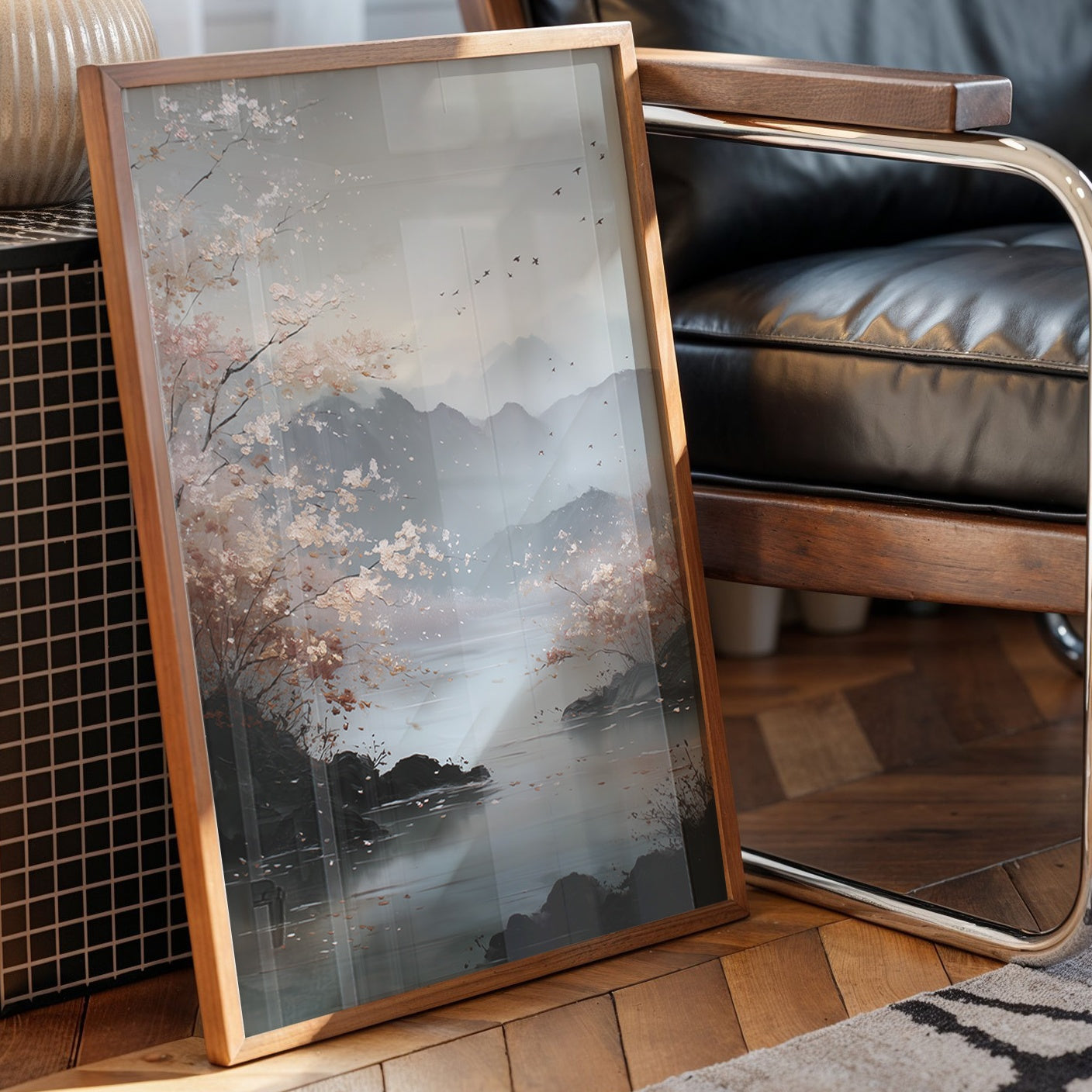 Delicate pink petals dance against a misty mountain backdrop, creating a scene of tranquil contemplation. The soft greys and blush tones merge seamlessly as birds soar through clouds that embrace distant peaks, while a serene lake reflects the gentle poetry of nature's awakening. This contemporary interpretation of a traditional landscape captures the ephemeral beauty of spring in the mountains. This piece would create a meditative focal point in a reading nook or bring serene energy to a minimalist bedroom sanctuary.