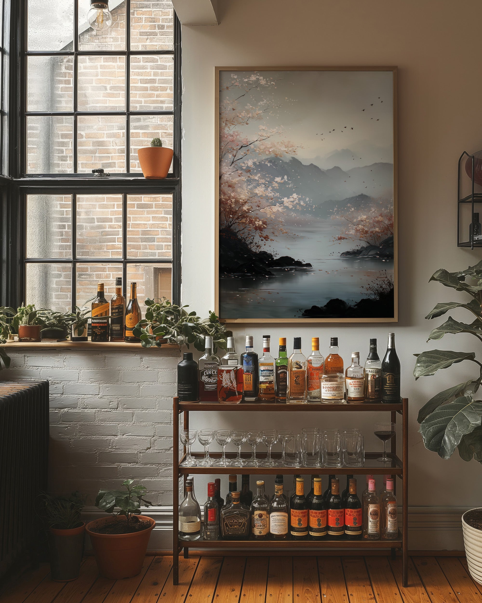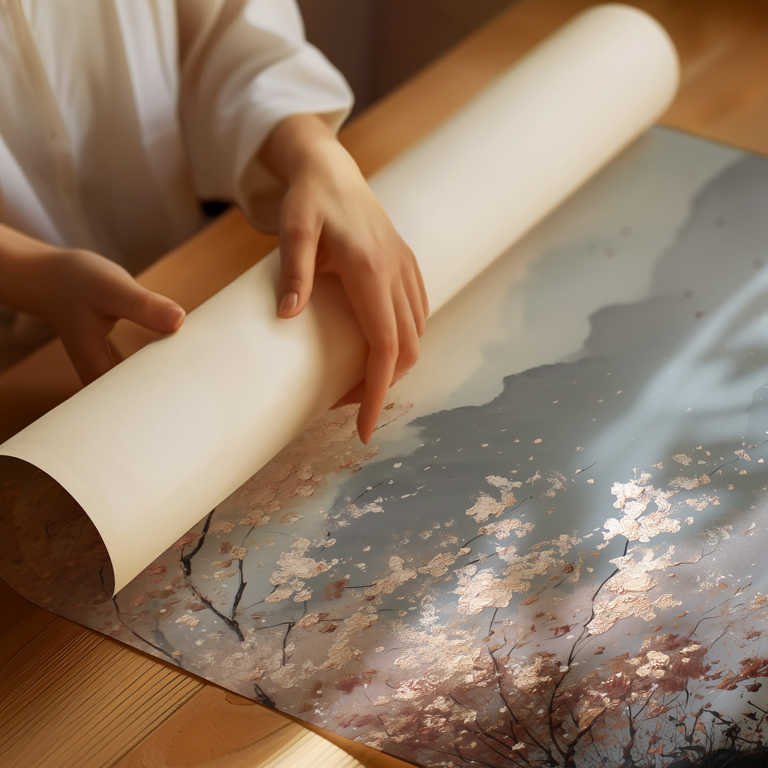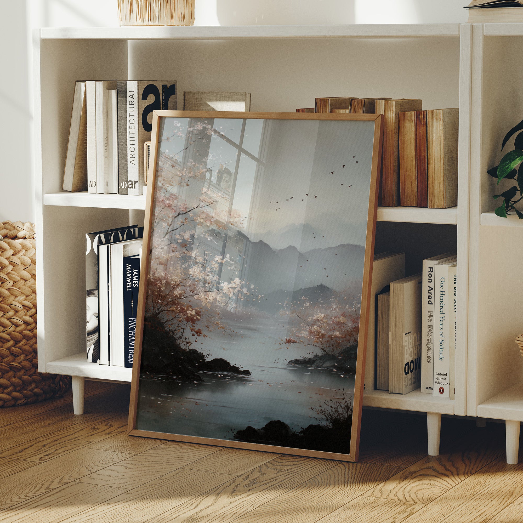 Delicate pink petals dance against a misty mountain backdrop, creating a scene of tranquil contemplation. The soft greys and blush tones merge seamlessly as birds soar through clouds that embrace distant peaks, while a serene lake reflects the gentle poetry of nature's awakening. This contemporary interpretation of a traditional landscape captures the ephemeral beauty of spring in the mountains. This piece would create a meditative focal point in a reading nook or bring serene energy to a minimalist bedroom sanctuary.