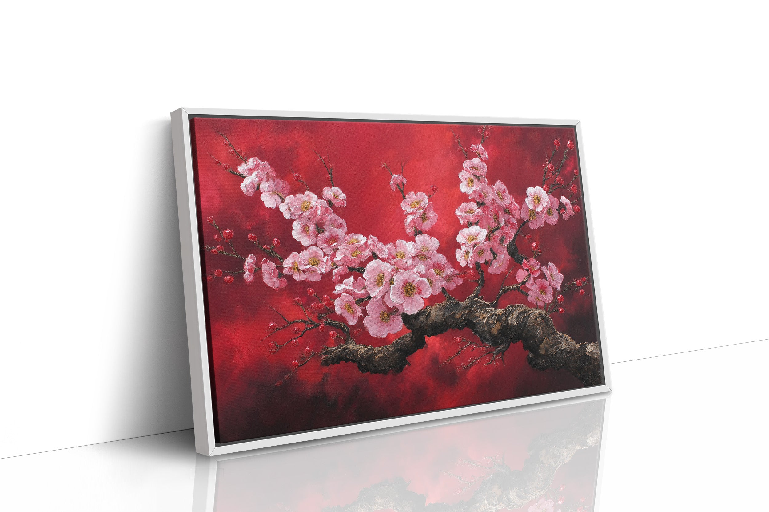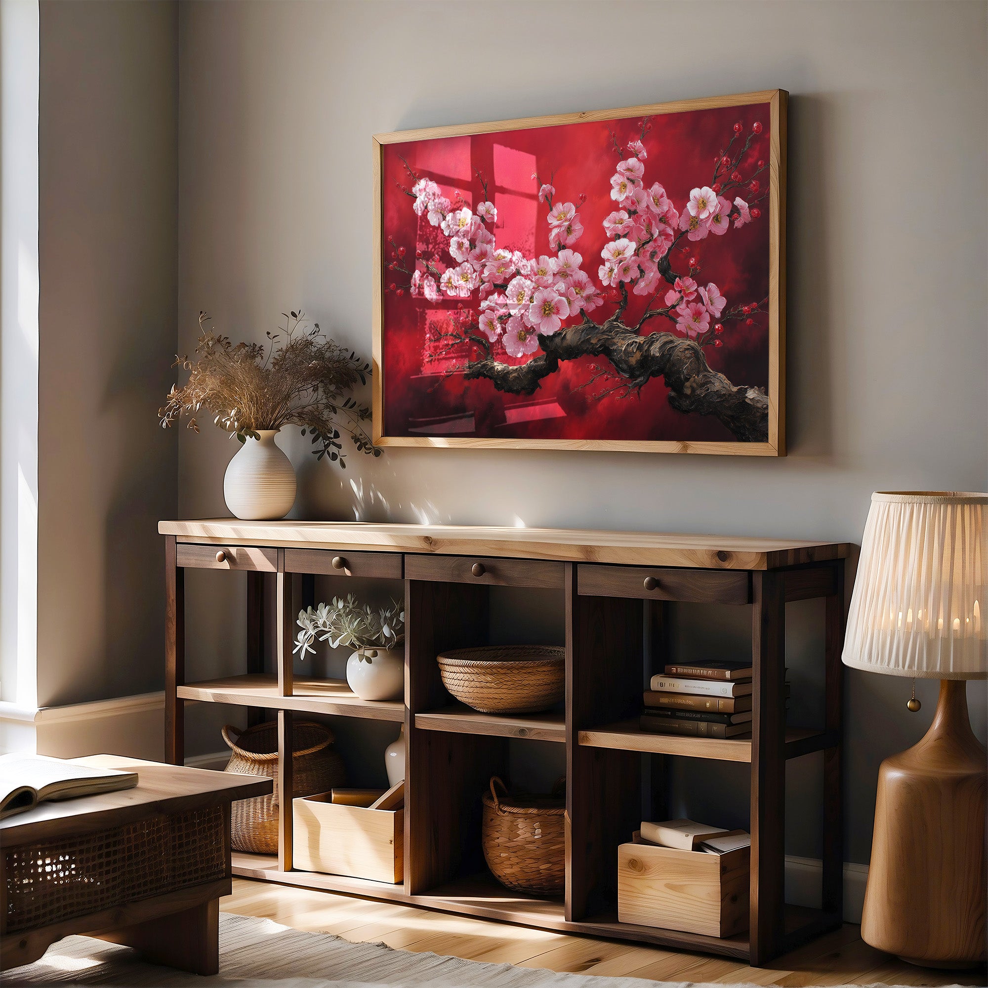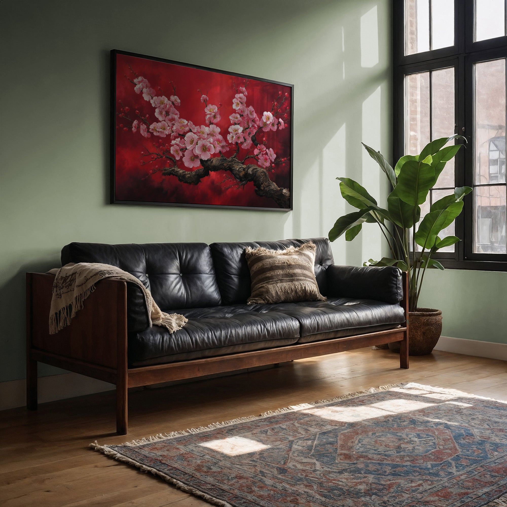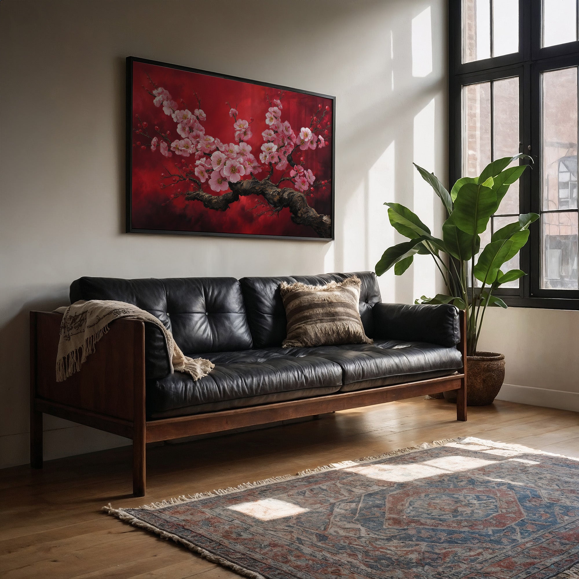 Golden afternoon light streams across a corduroy couch, casting delicate plant shadows on cream walls. A striking artwork captures the essence of spring, with pink cherry blossoms gracefully extending across a deep crimson background, their petals seemingly floating in an ethereal dance. The contrast between the warm copper tones of the furniture and the dramatic red backdrop creates a compelling narrative of nature's elegant beauty. This piece would transform a reading nook or meditation space into a tranquil sanctuary, where the interplay of light and shadow adds depth to quiet moments of contemplation.