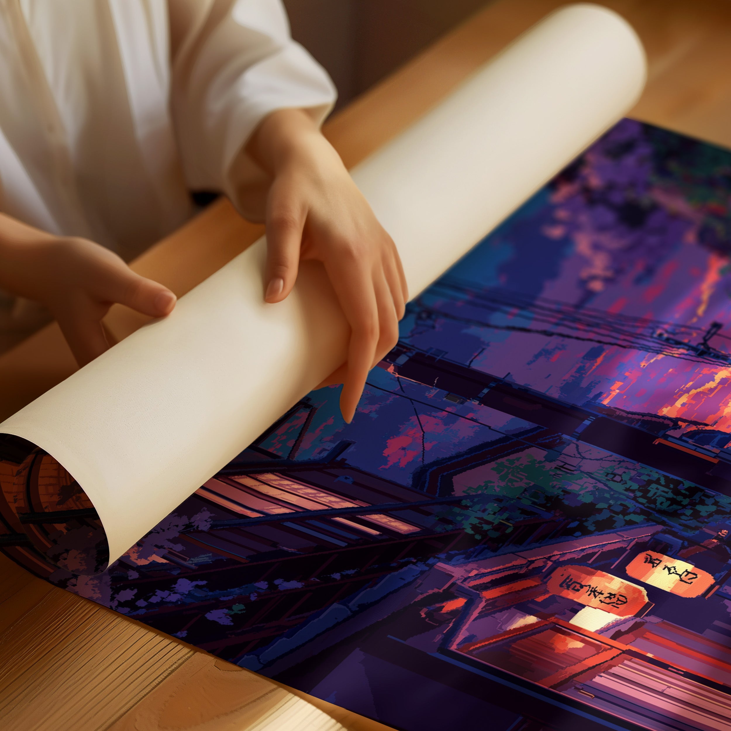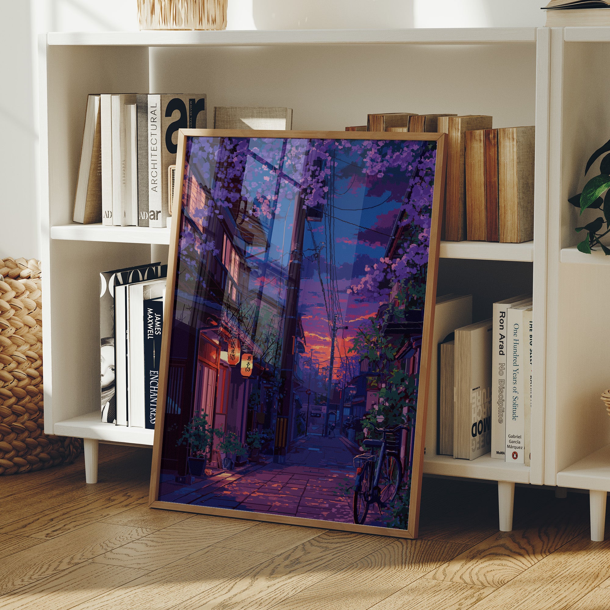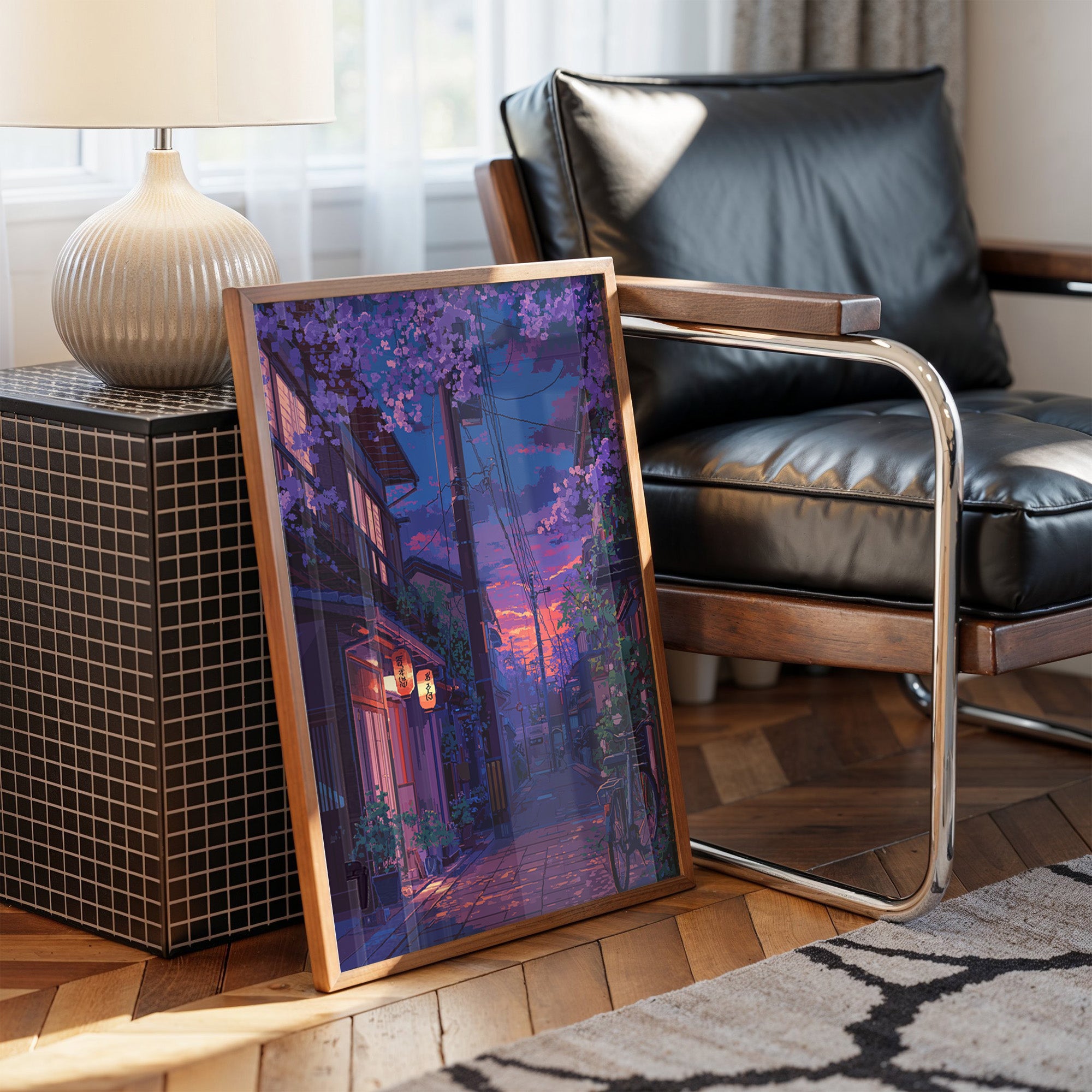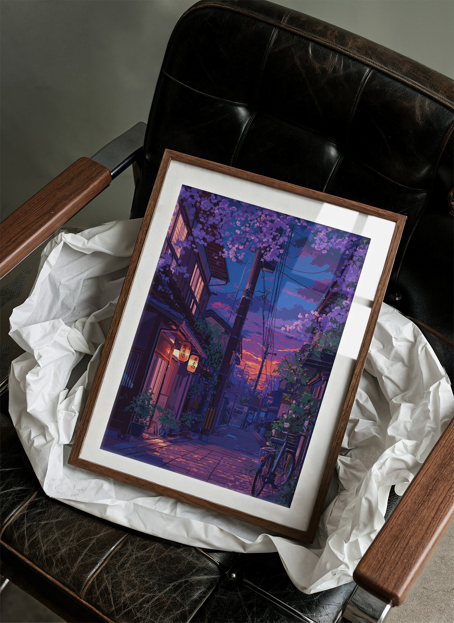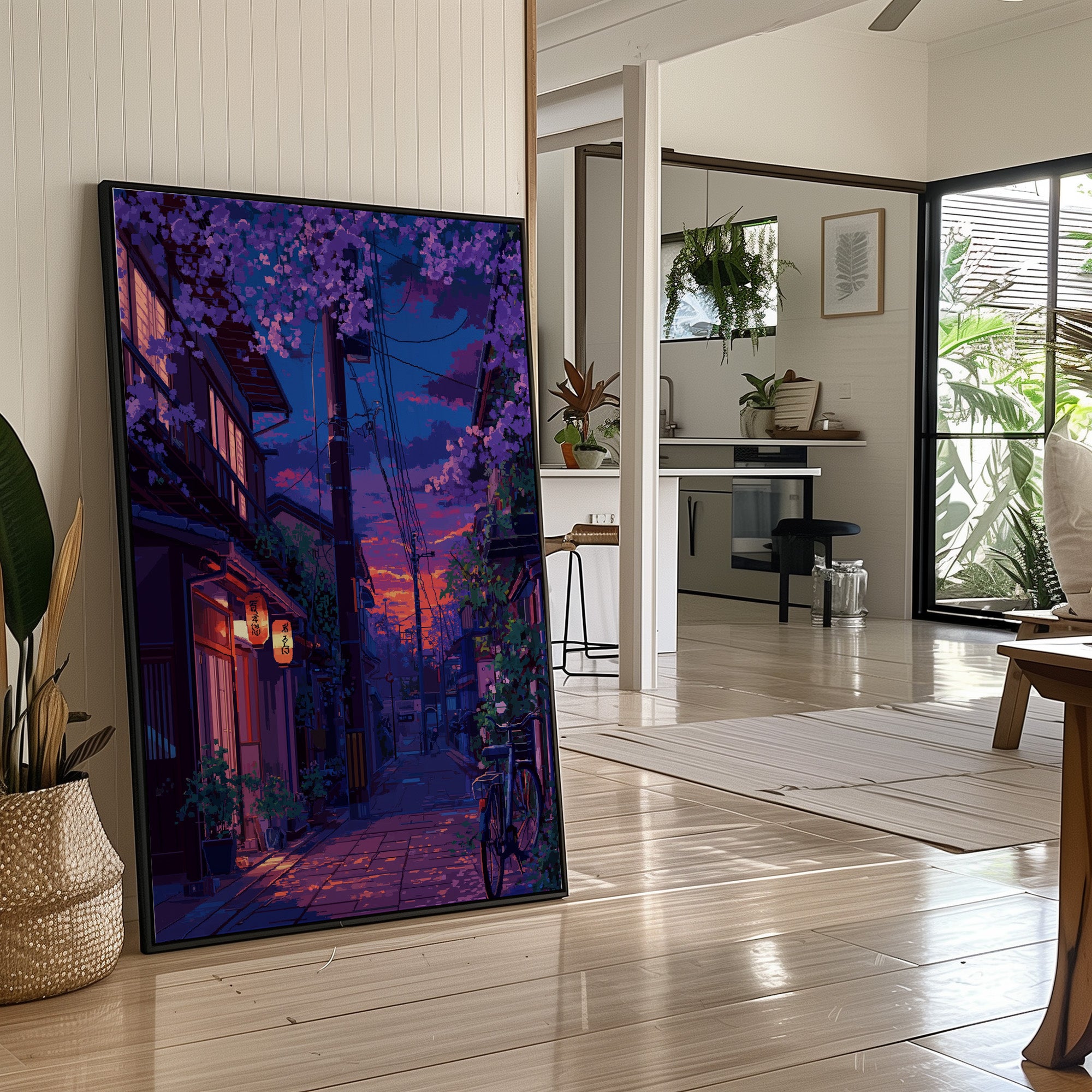 Paper lanterns cast their warm glow onto cobblestone streets as day surrenders to dusk. The scene captures a magical moment in a Japanese alley, where cascading purple cherry blossoms frame vintage architecture and modern power lines in perfect harmony. Deep purples and burning oranges paint the sky, while a solitary bicycle rests against weathered walls, telling stories of quiet evening returns home. This piece brings tranquil energy to modern living spaces, perfect for a reading nook or meditation corner where one seeks moments of peaceful contemplation.