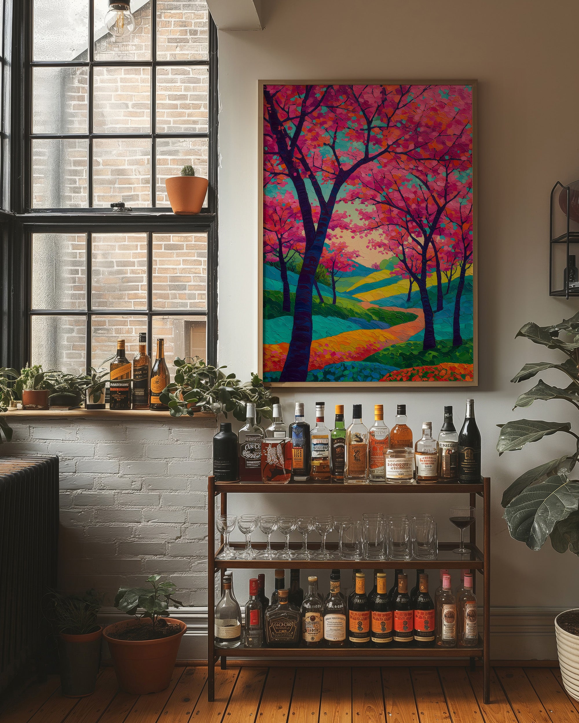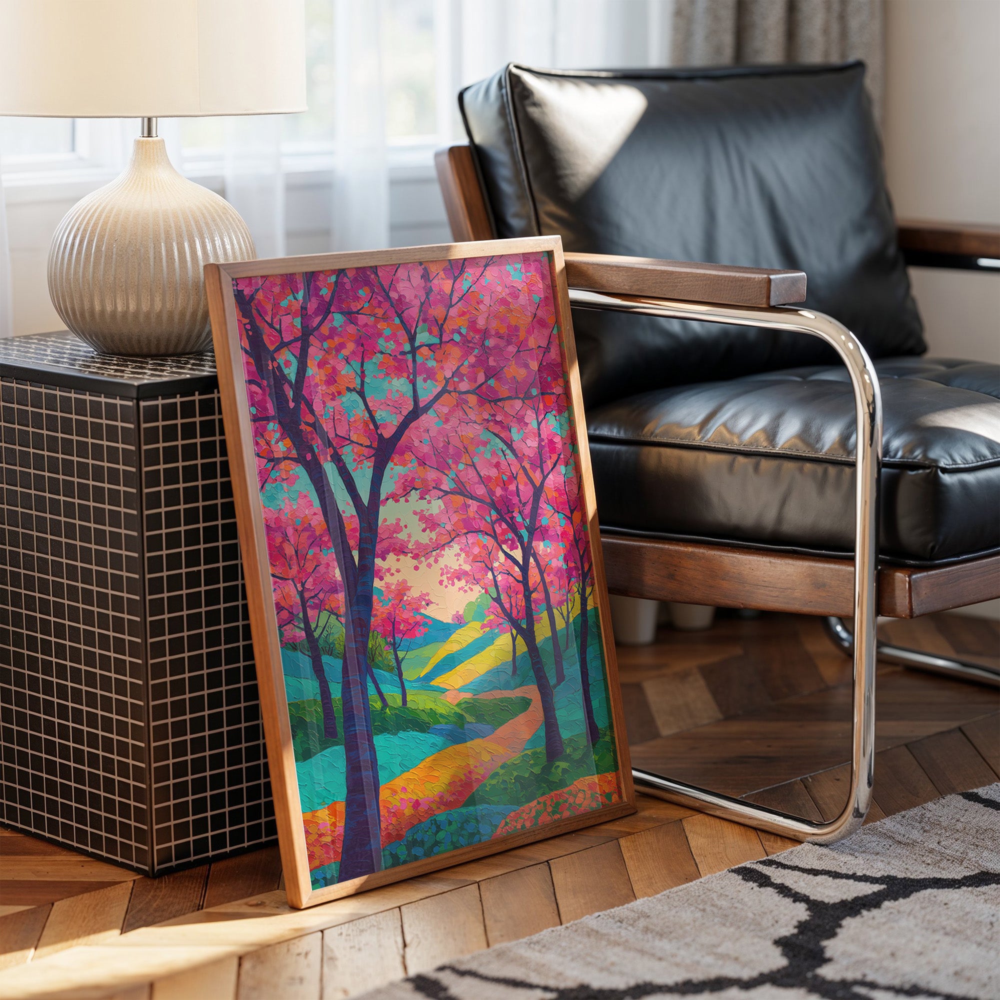 Vibrant magenta petals dance against turquoise skies, creating a dreamy canopy over a meandering trail. Deep purple tree trunks frame rolling hills that stretch toward a golden horizon, while splashes of teal and orange weave through the landscape like ribbons of light. This contemporary interpretation of a spring forest scene captures the magical moment when nature bursts into full bloom. Perfect for bringing a pop of color and whimsy to a modern living room or adding artistic flair to a bright, airy home office.