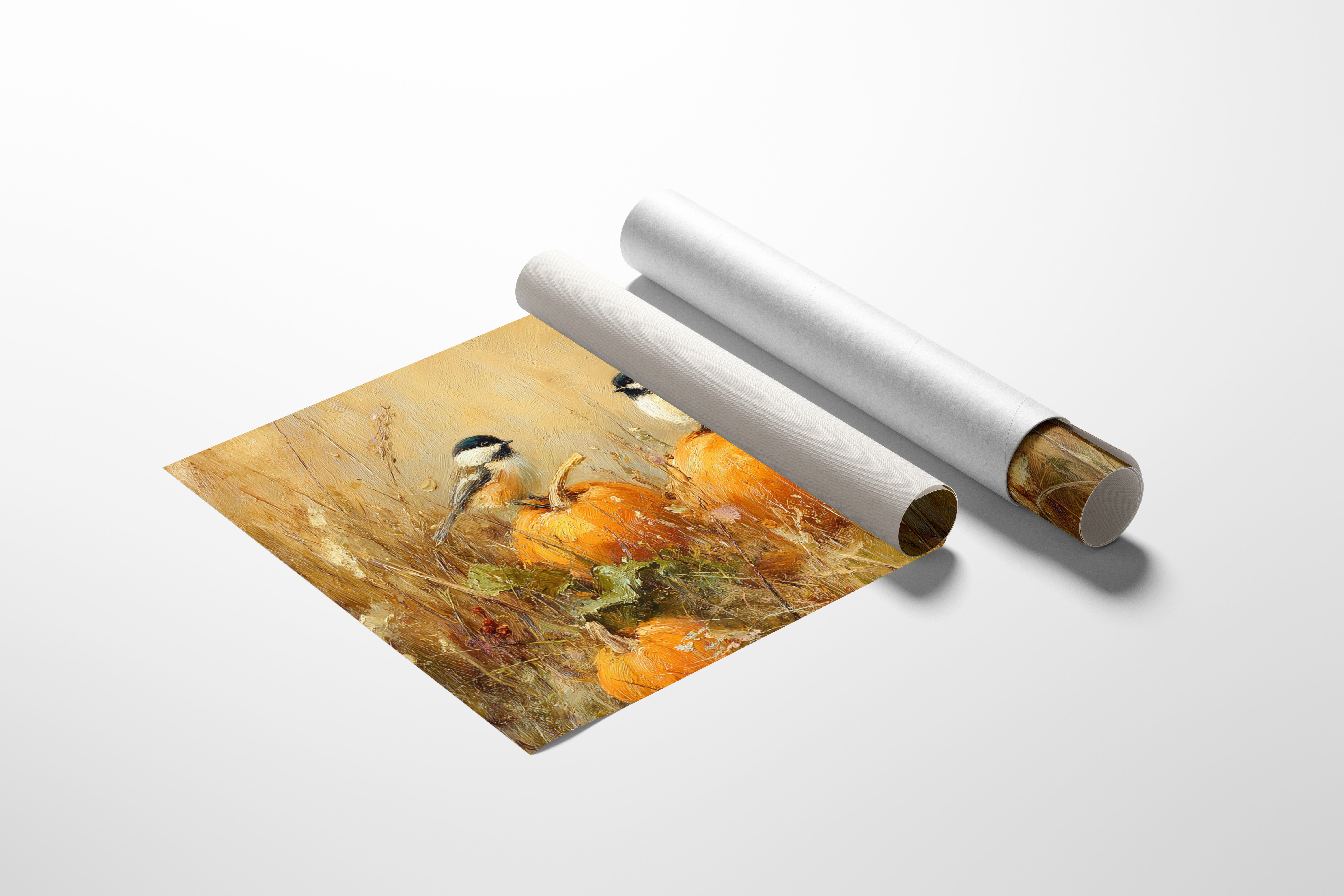 Two charming chickadees perch atop vibrant orange pumpkins, creating a quintessential autumn vignette. The textured brushstrokes capture the warmth of golden hour light filtering through dried grasses and wildflowers. Rich oranges and earthy browns blend seamlessly, while delicate details in the birds' feathers and the subtle variations in the pumpkins' surfaces create depth and visual interest. The composition speaks to the quiet moments of fall, when nature prepares for winter's approach. This piece would bring seasonal charm to a breakfast nook or create a welcoming focal point in an entryway during autumn months.