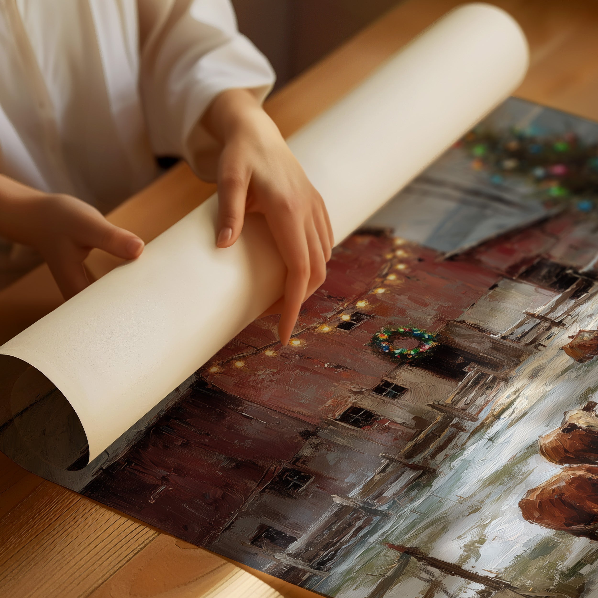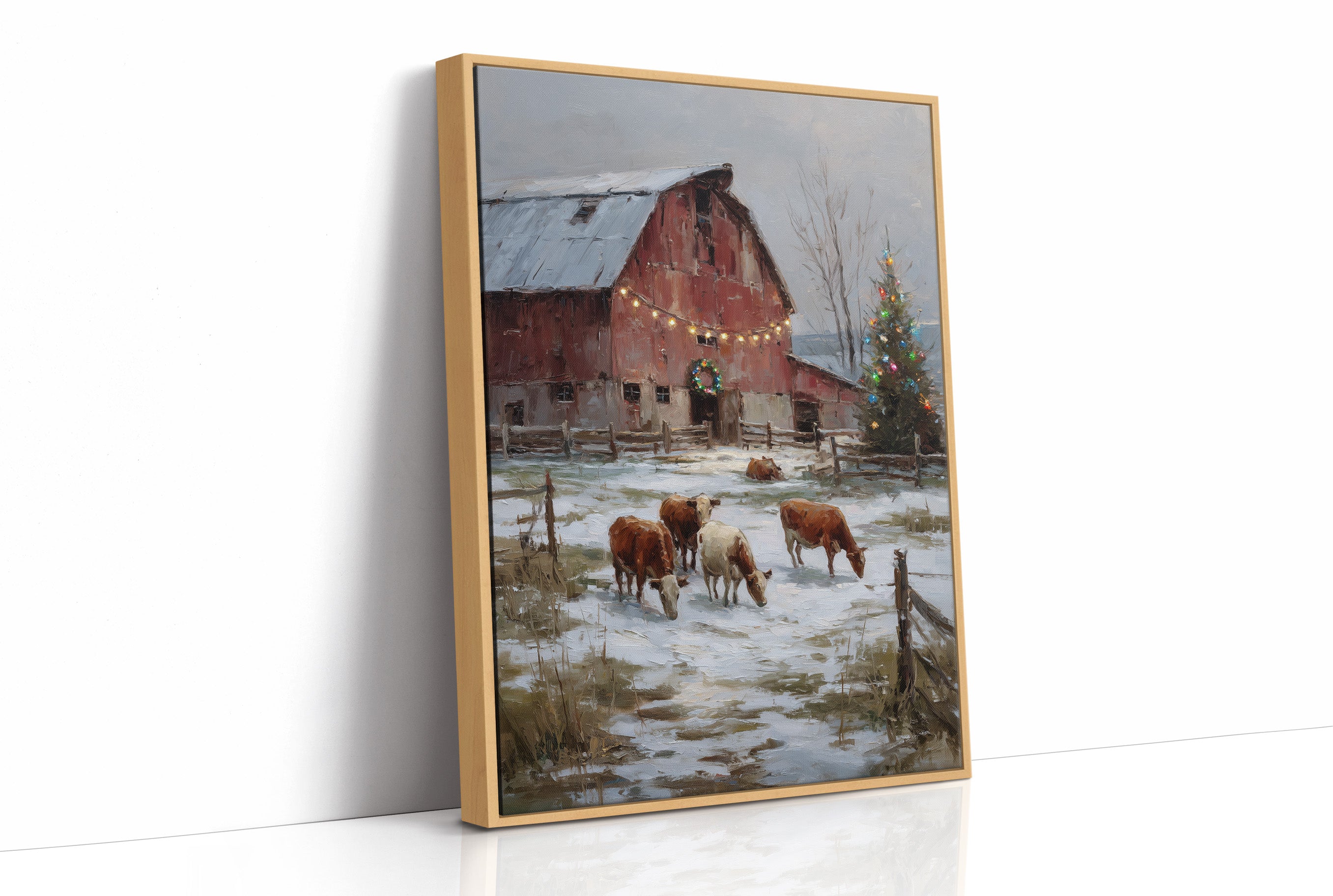 A weathered red barn stands beneath a soft winter sky, its doorway framed with a glowing wreath and warm string lights that shimmer against fresh fallen snow. Nearby, cattle graze peacefully beside a brightly lit Christmas tree, blending rustic farm life with the gentle magic of the season. Part of our Country Christmas collection, this piece pairs impressionist texture with nostalgic rural charm. A heartwarming addition to living rooms, entryways, or farmhouse-inspired spaces that celebrate simple holiday traditions.