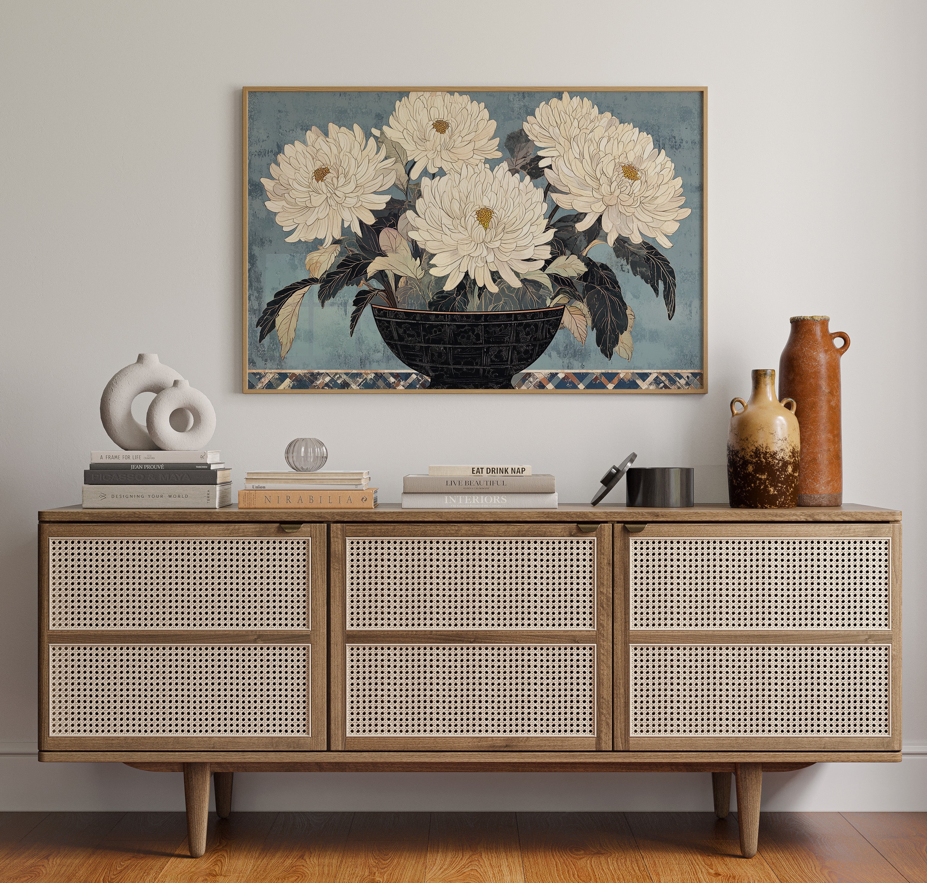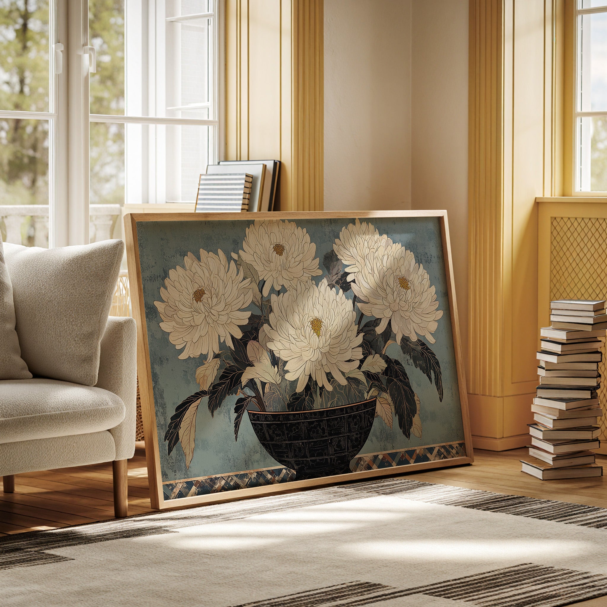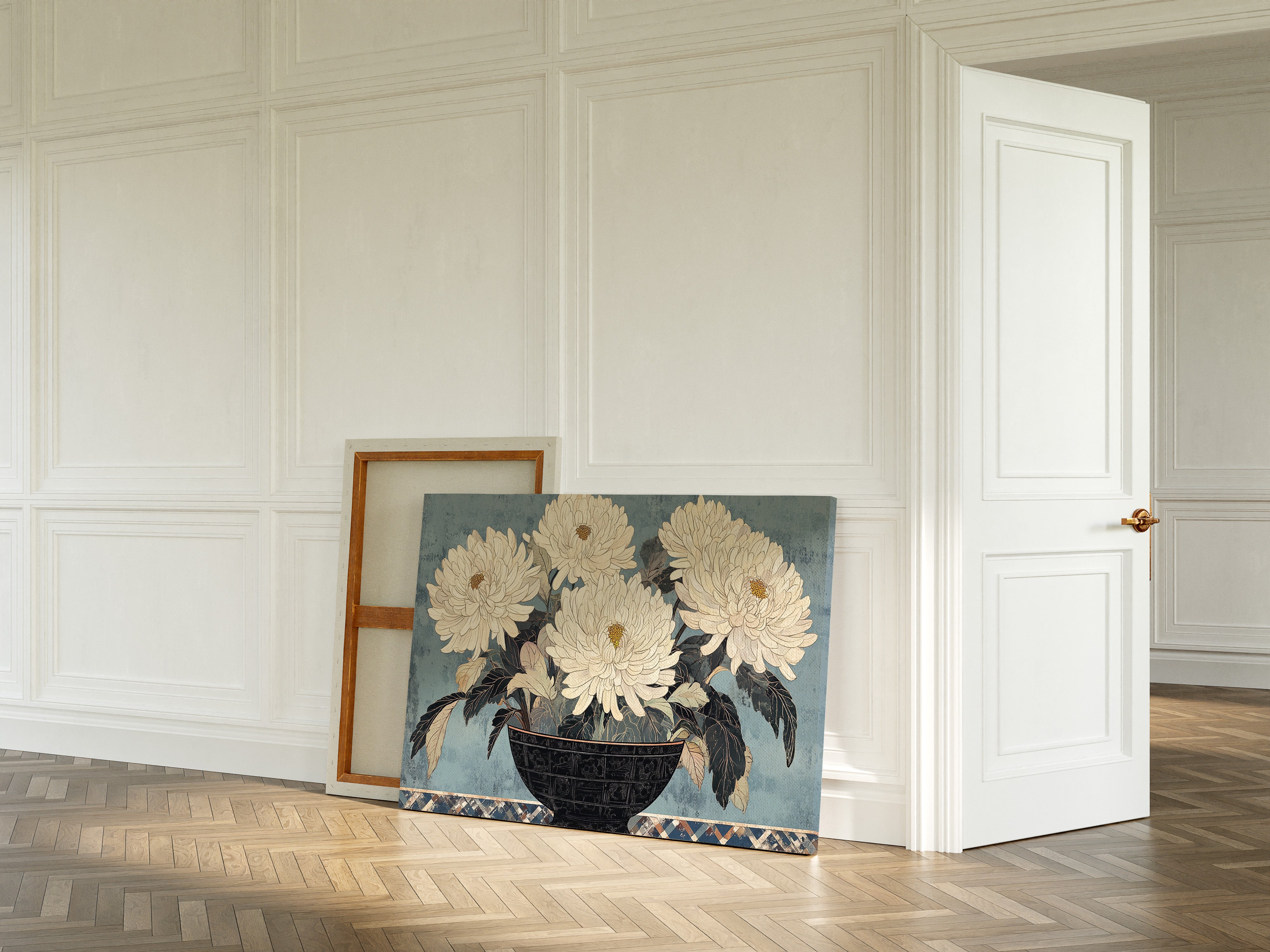Like paper cranes unfolding their wings, pristine white chrysanthemums unfurl their delicate petals against a moody slate-blue backdrop. Each bloom tells a story of perfect symmetry, their layered petals creating a mesmerizing dance of light and shadow. The black ceramic bowl grounds the composition with its bold presence, while dusky leaves add depth and movement to the arrangement. This modern interpretation of traditional Asian floral art brings together contemporary minimalism with timeless botanical beauty. Perfect for creating a sophisticated focal point in a dining room or adding serene elegance to a meditation space.