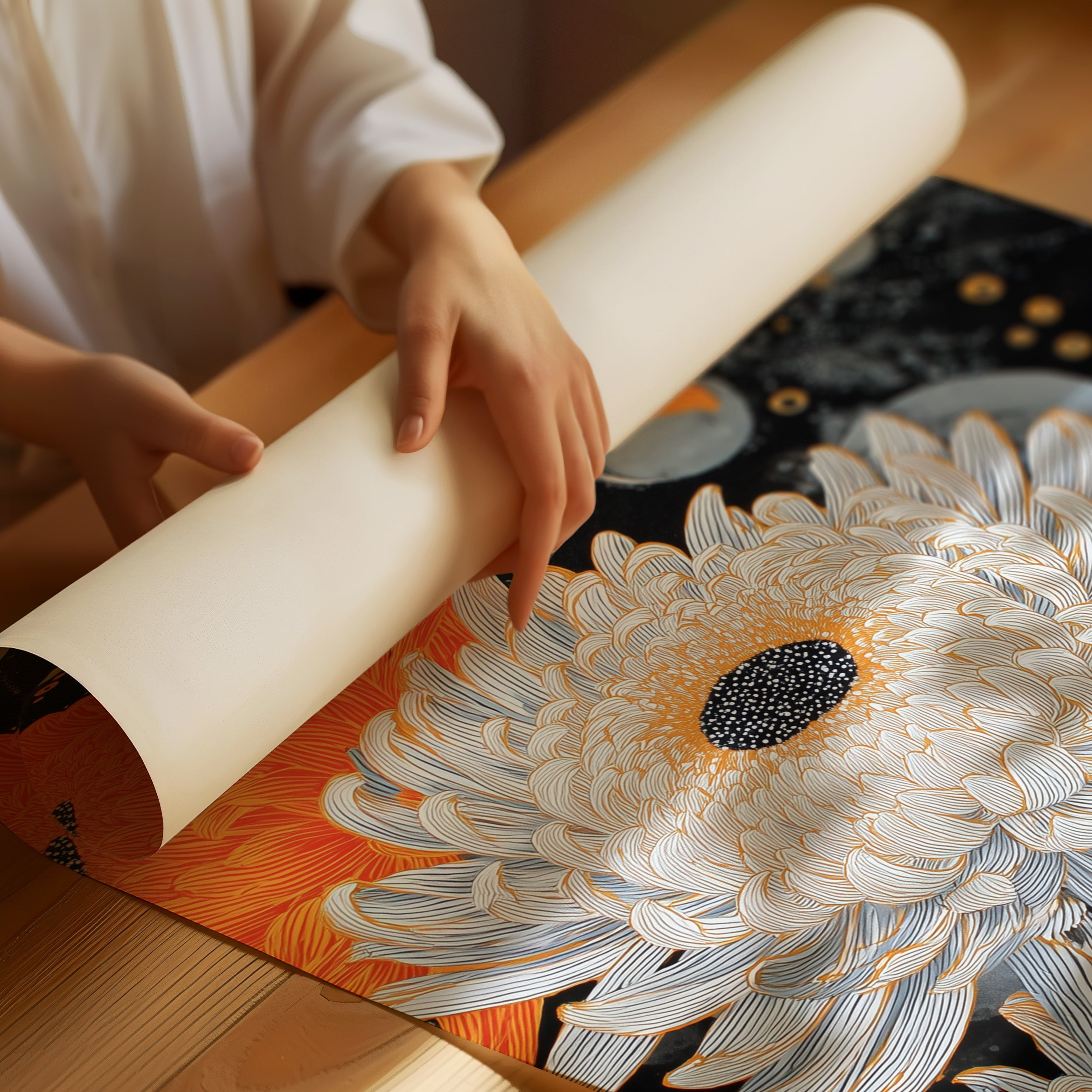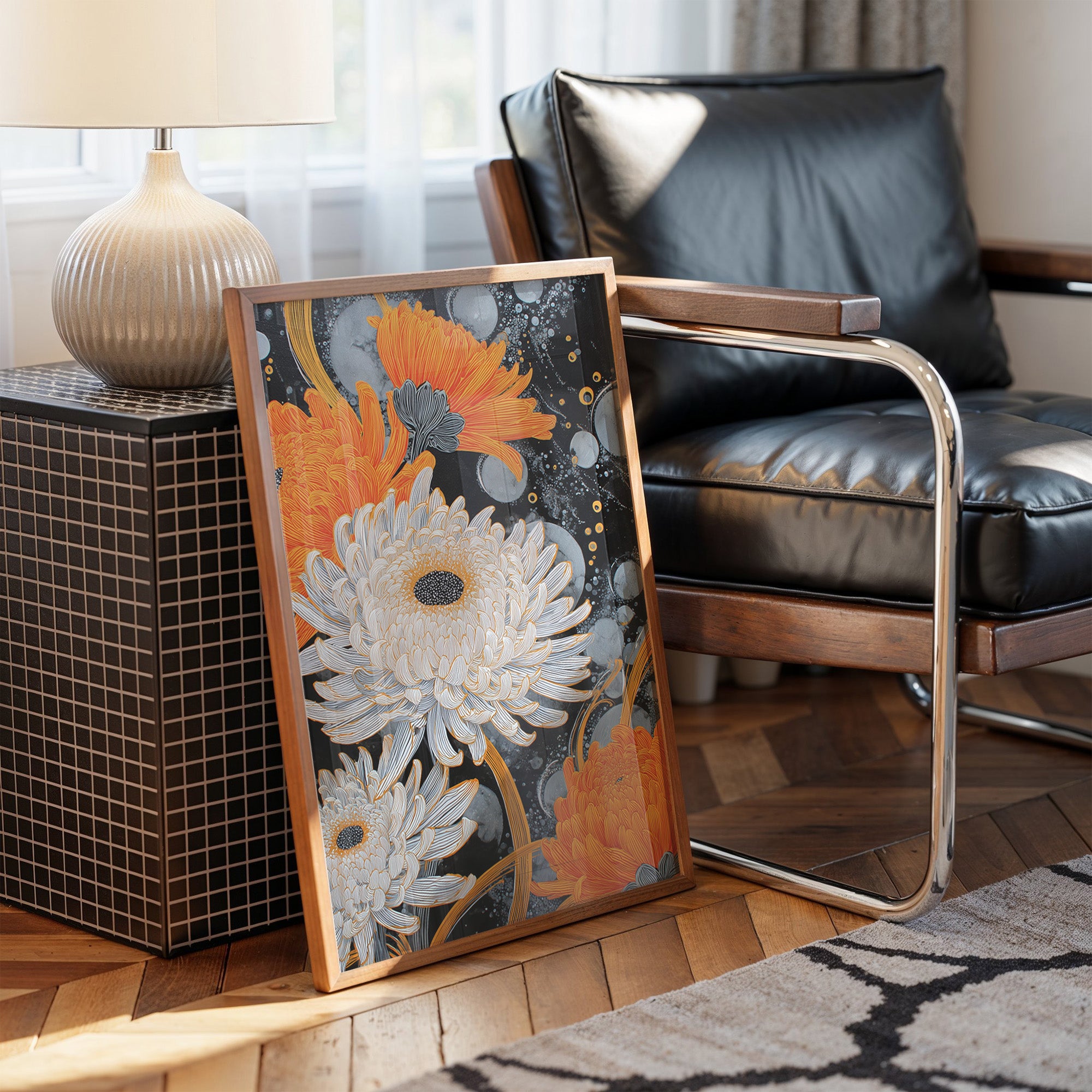 Delicate white blooms float against an inky night sky, their petals unfurling like paper lanterns in the darkness. Orange chrysanthemums burst forth with dramatic flair, their intricate layers creating a mesmerizing dance with silvery companions amid scattered starlight and ethereal bubbles. This contemporary botanical illustration merges Asian-inspired artistry with modern geometric elements, creating a sophisticated interplay of light and shadow. This piece would make a striking focal point in a modern living room or add artistic sophistication to a minimalist home office, especially when paired with clean lines and metallic accents.
