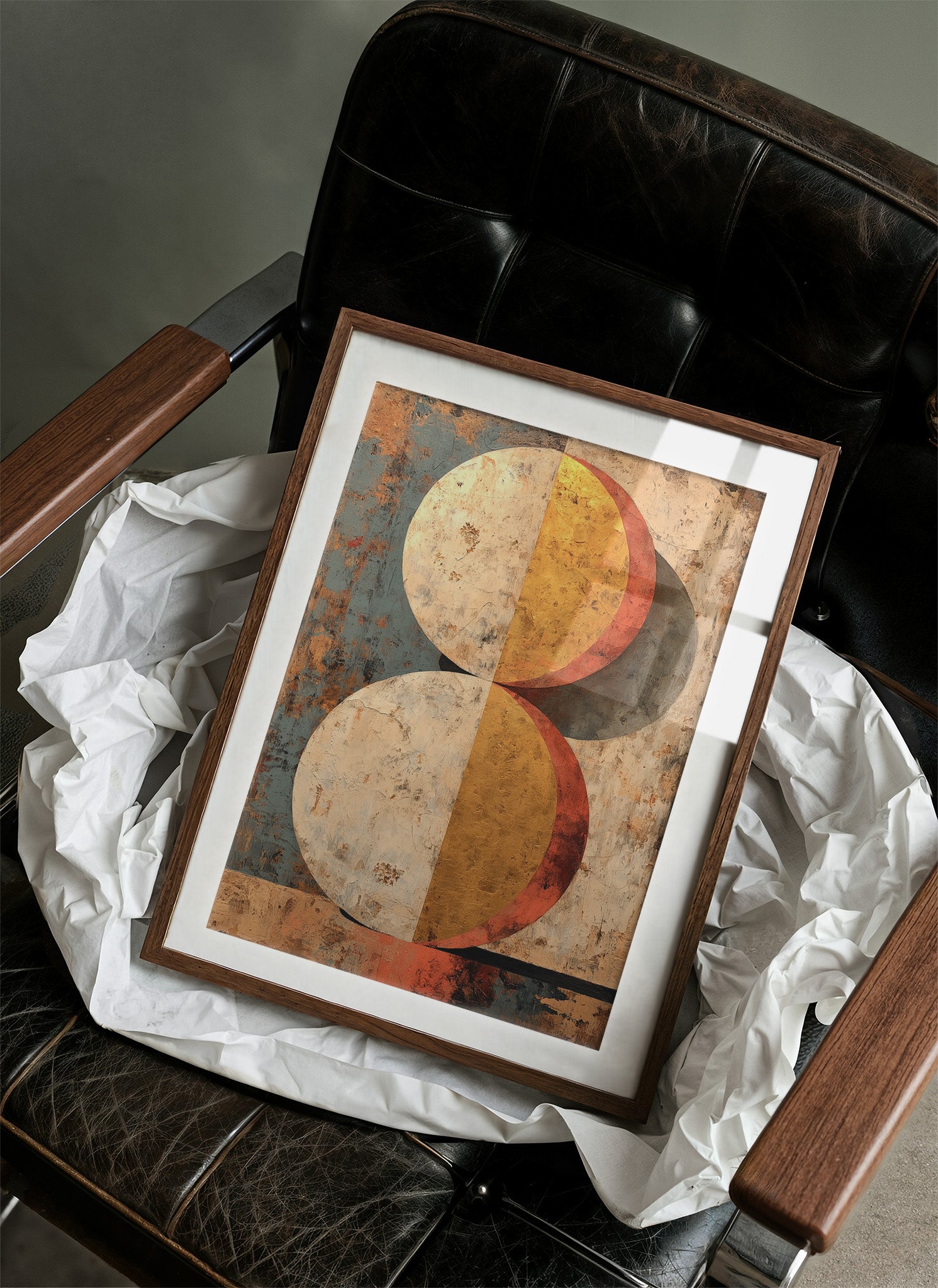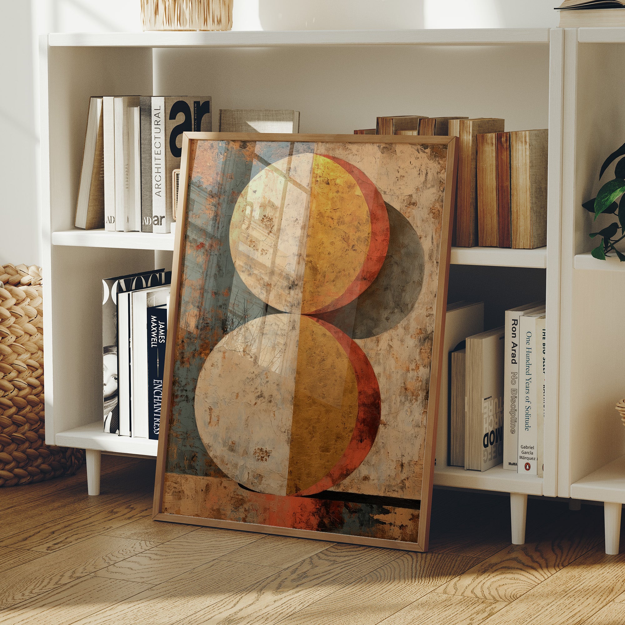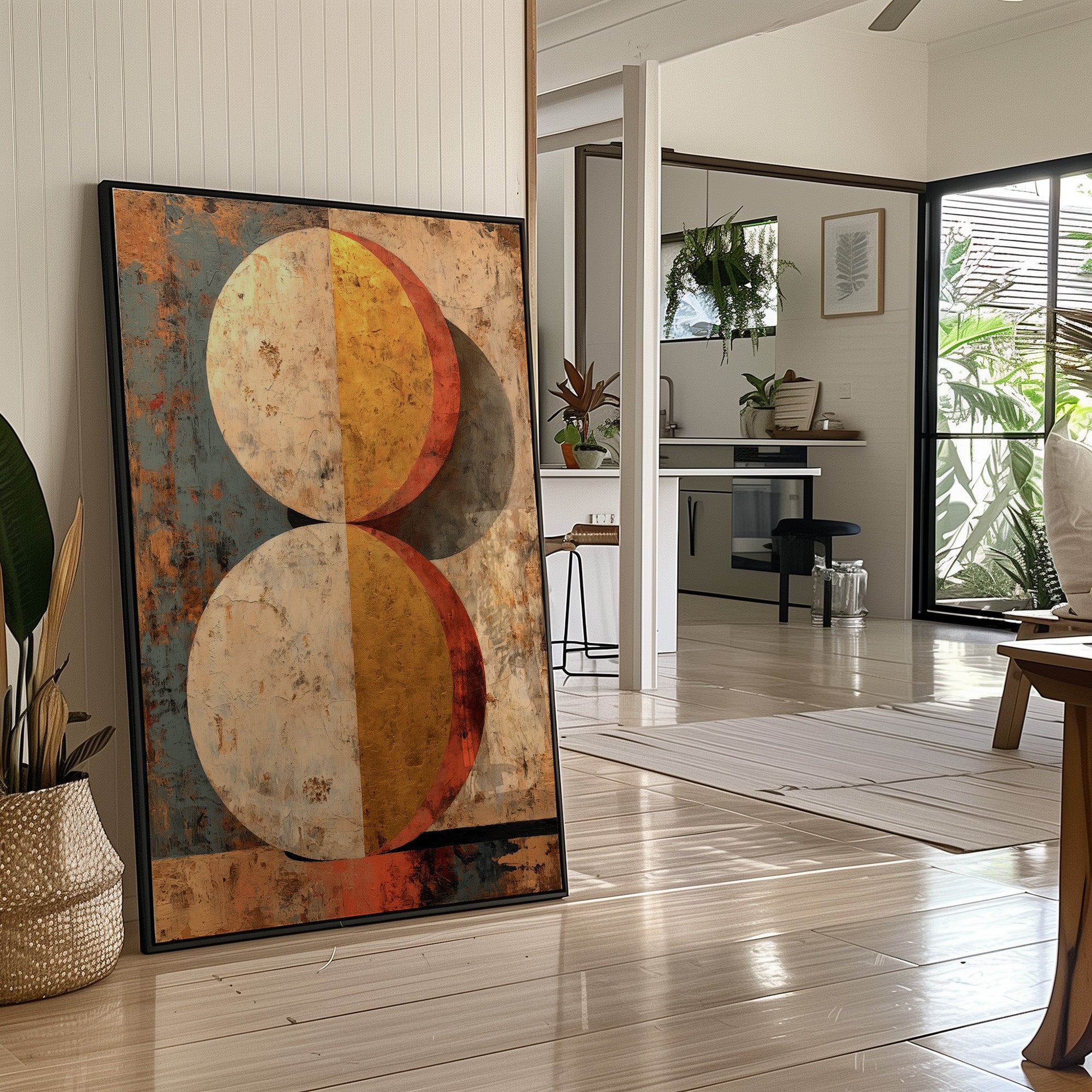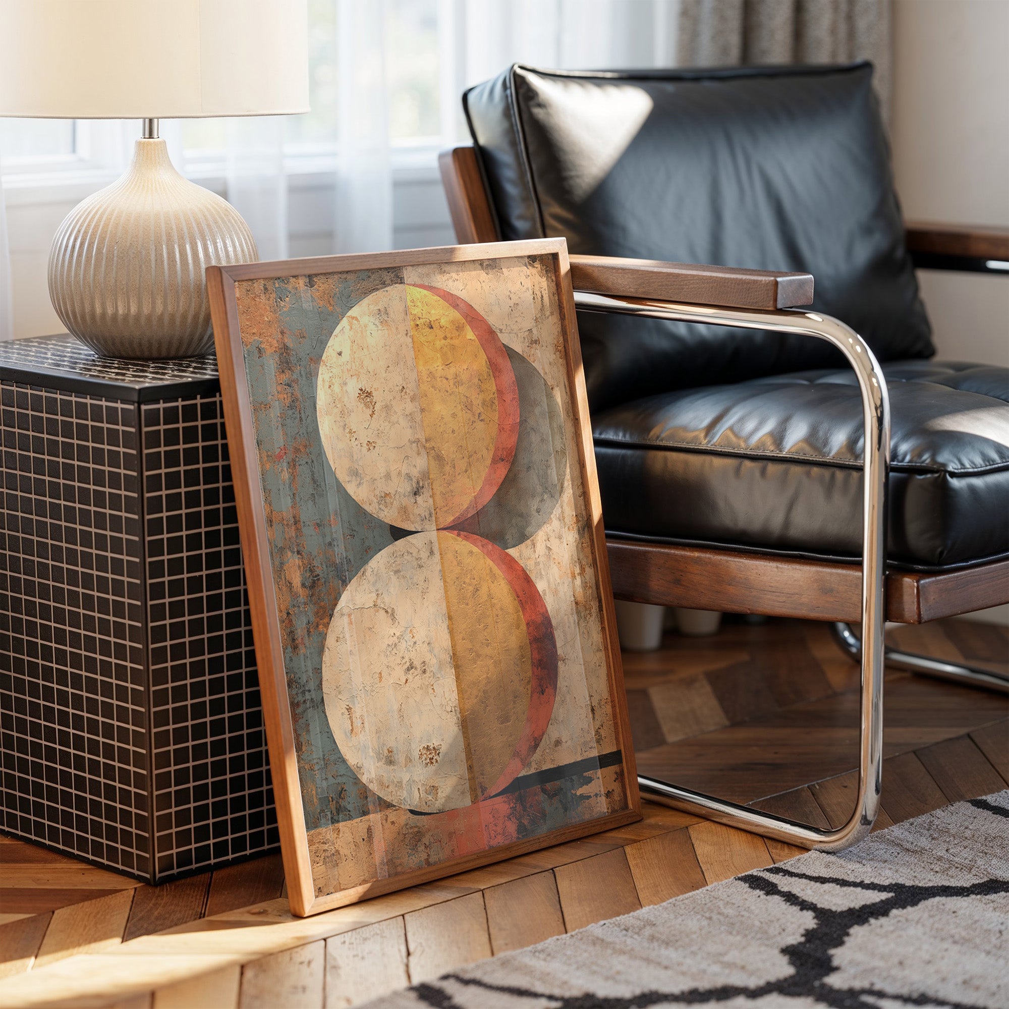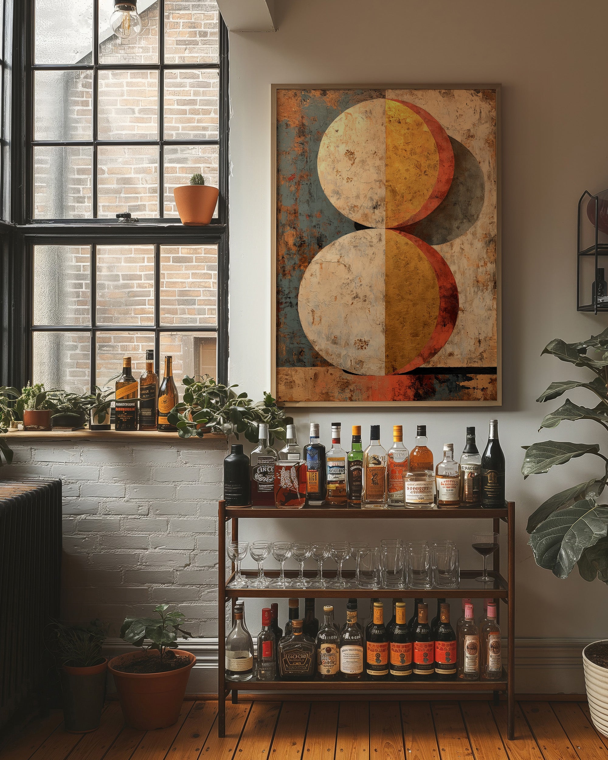 Warm light filters through industrial windows, casting gentle shadows across a thoughtfully curated home bar scene. A striking geometric painting commands attention with its weathered spheres in burnt orange and golden yellow, creating a perfect backdrop for sophisticated entertaining. The careful arrangement of premium spirits on an industrial cart, complemented by trailing plants and terracotta pots, speaks to a space where modern design meets vintage charm. This piece would elevate a dining room, home bar, or living space where conversations flow as freely as the carefully chosen libations below.