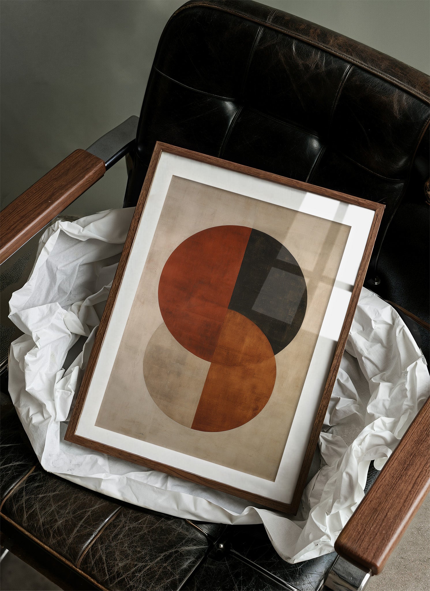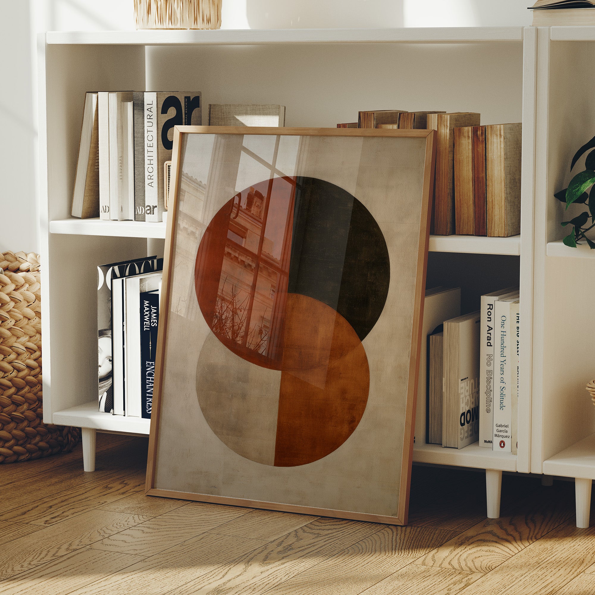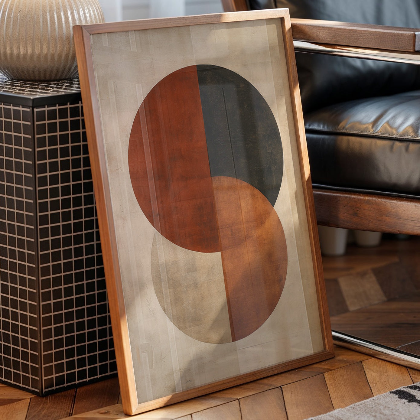 Geometric shapes cast in warm terracotta and deep charcoal overlap in a mesmerizing dance of form and shadow. The composition speaks through its minimalist elegance, where circles intersect like celestial bodies in orbit, creating a harmonious balance between negative space and bold shapes. Natural light plays across the wooden frame, enhancing the piece's organic warmth and sophisticated simplicity. This contemporary piece would elevate a modern reading nook or bring artistic sophistication to a minimalist home office.