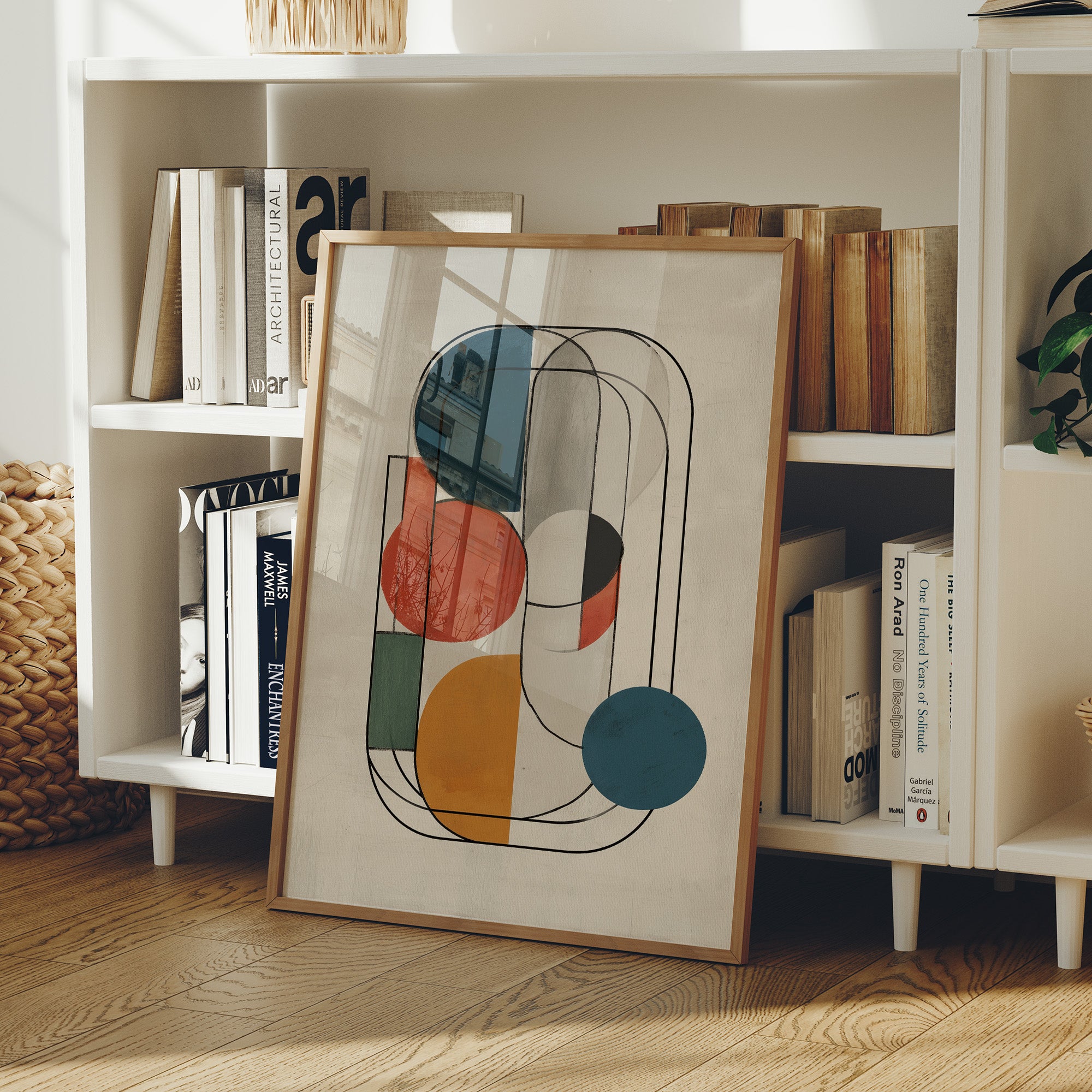 Geometric shapes float in an elegant ballet of color and form, creating a sophisticated visual rhythm against a warm cream backdrop. Bold circles in terracotta, mustard, and teal interweave with graceful linear arches, speaking a language of balanced composition and mindful design. This contemporary piece brings together mid-century modern aesthetics with current minimalist sensibilities, perfect for elevating a reading nook or office space with its thoughtful blend of warmth and structure.
