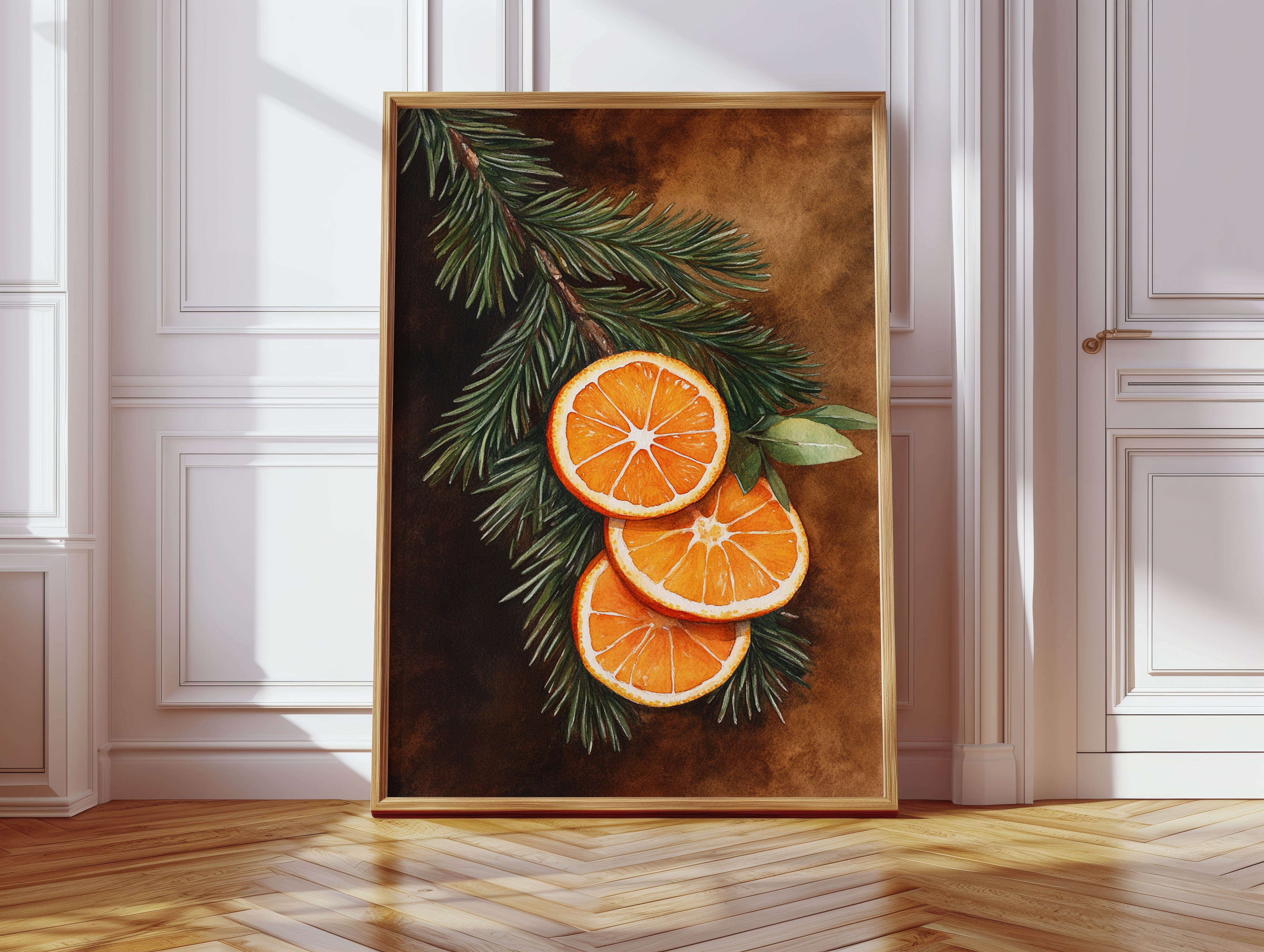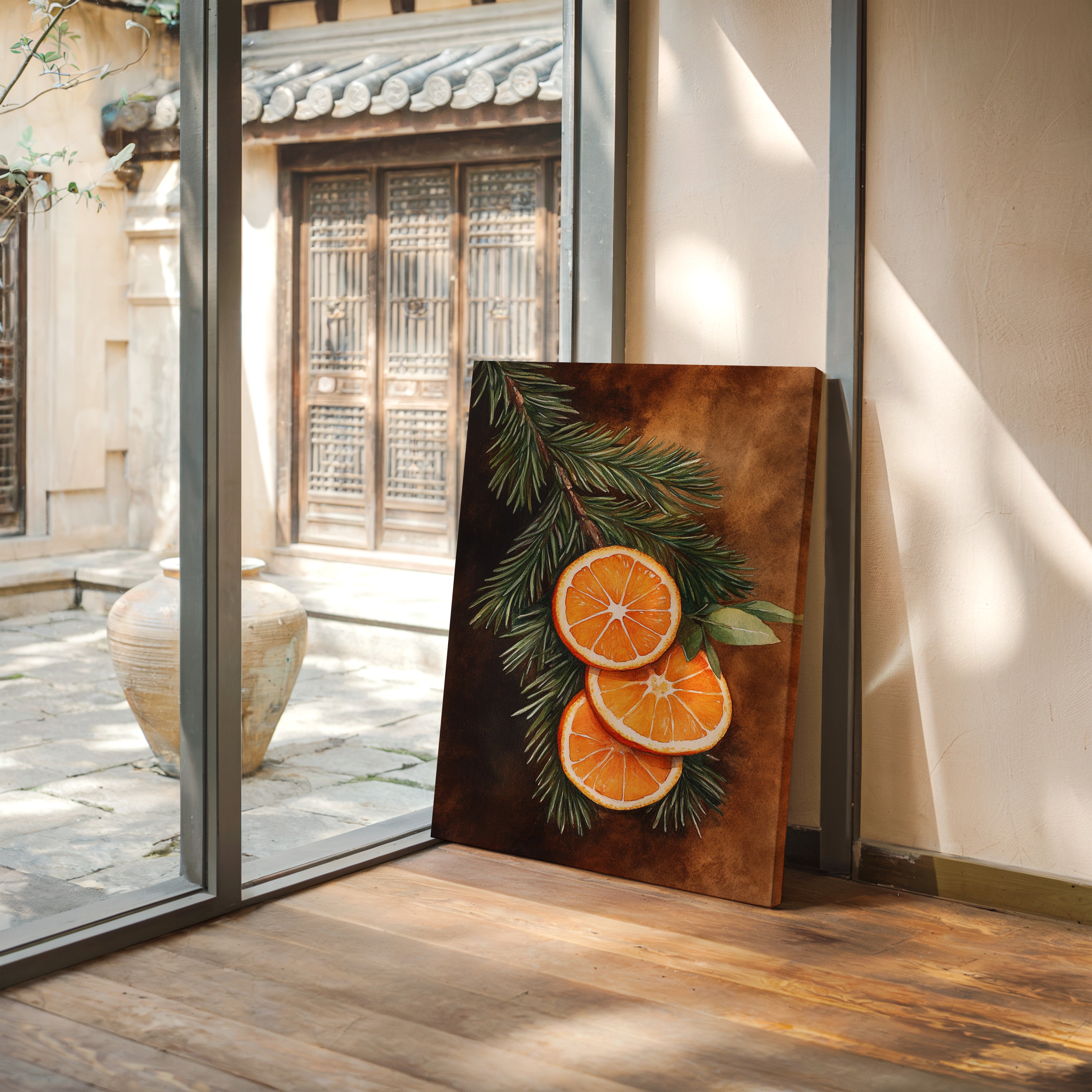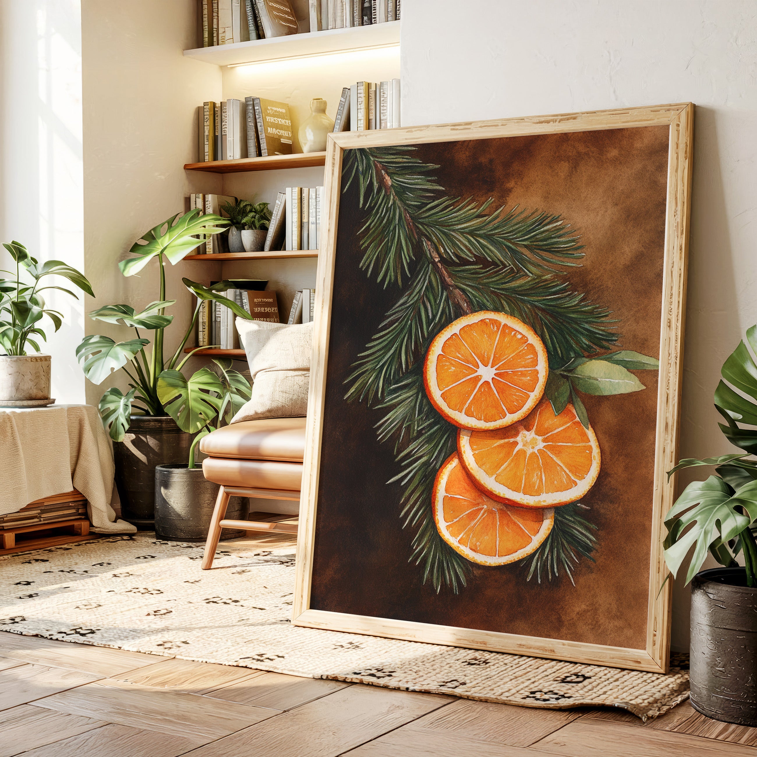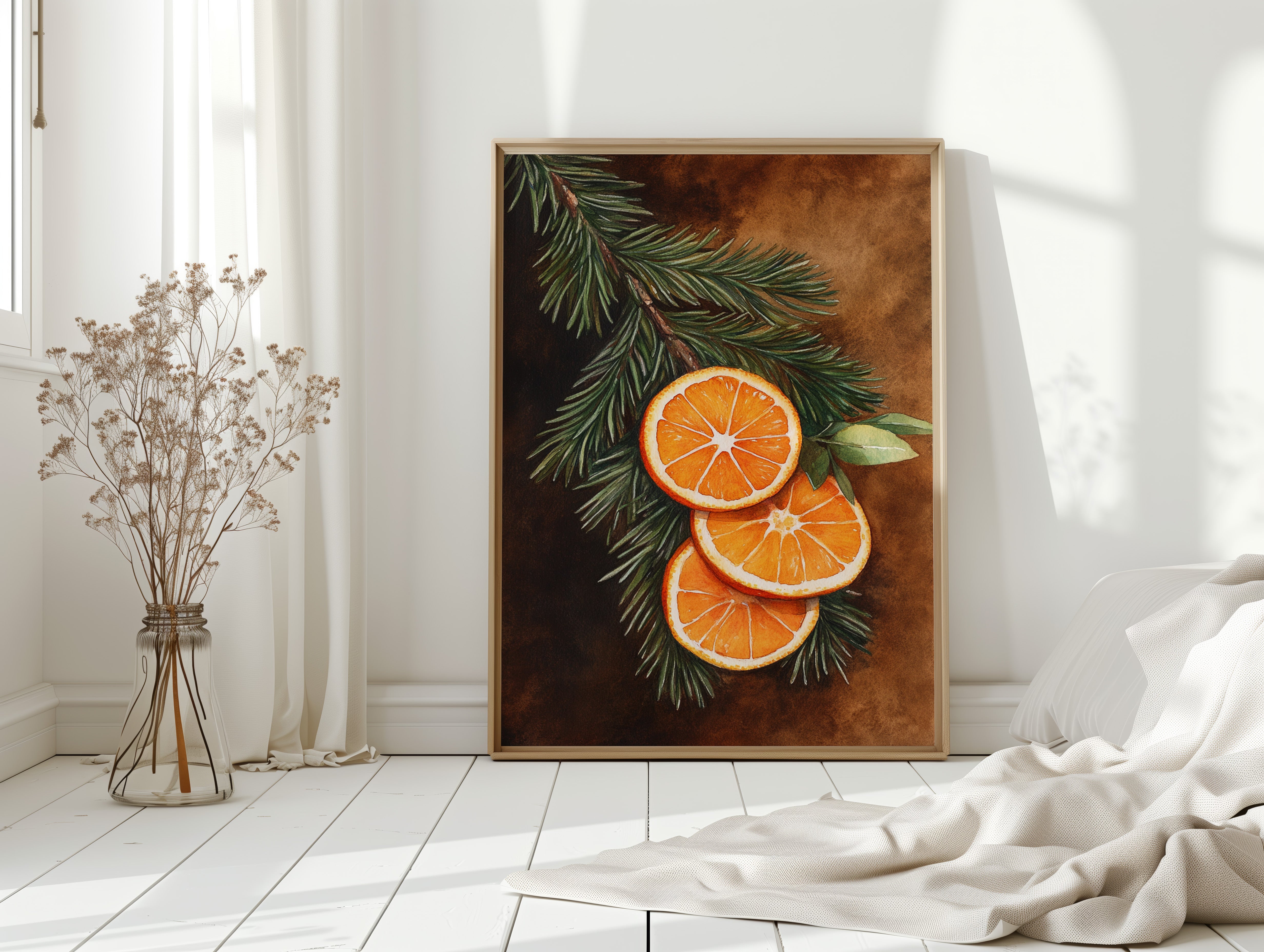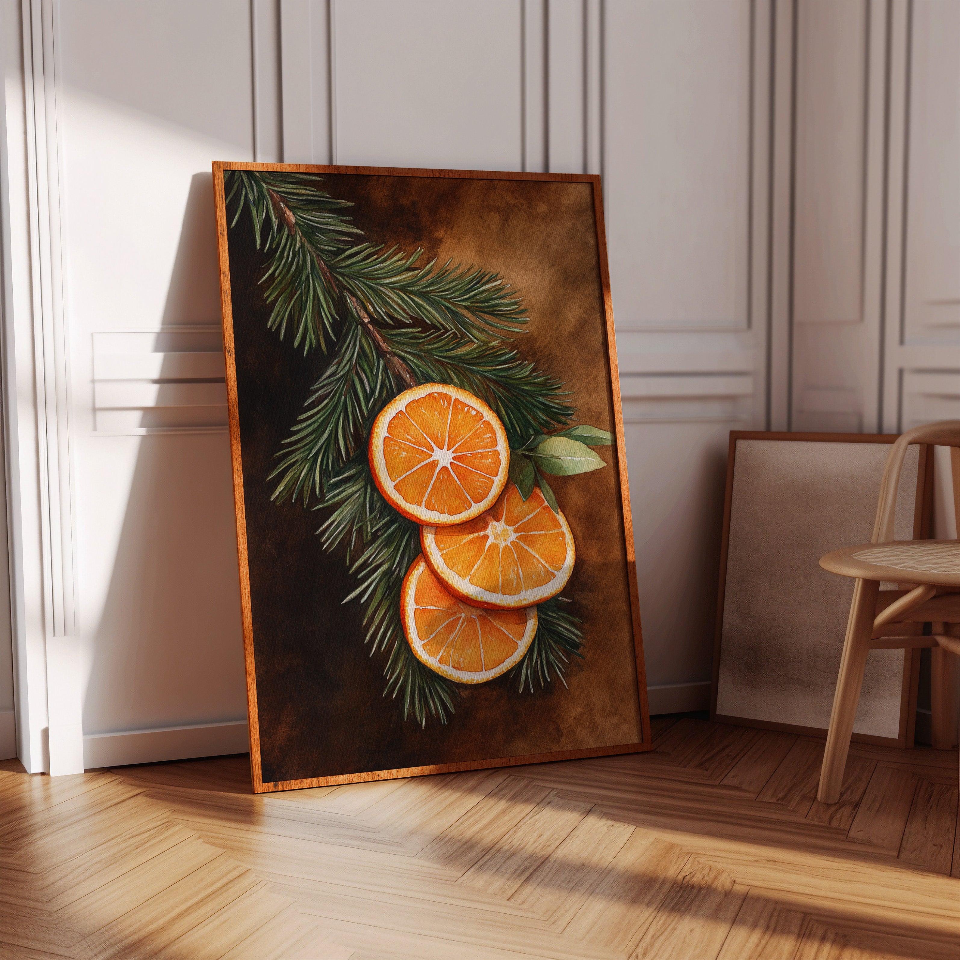 A gentle embrace of winter warmth and citrus zest fills the room. Nestled within 'Winter Solace,' this piece harmonizes festive charm with cozy elegance. Perfect for living rooms or welcoming entryways, where its vibrant tones invite warmth and cheer. - Archival-quality fine art paper (matte or satin) - Premium pigment-based inks - Available unframed or in natural wood frames - Printed in the USA - Size refers to print only; frame adds ~1" to all sides