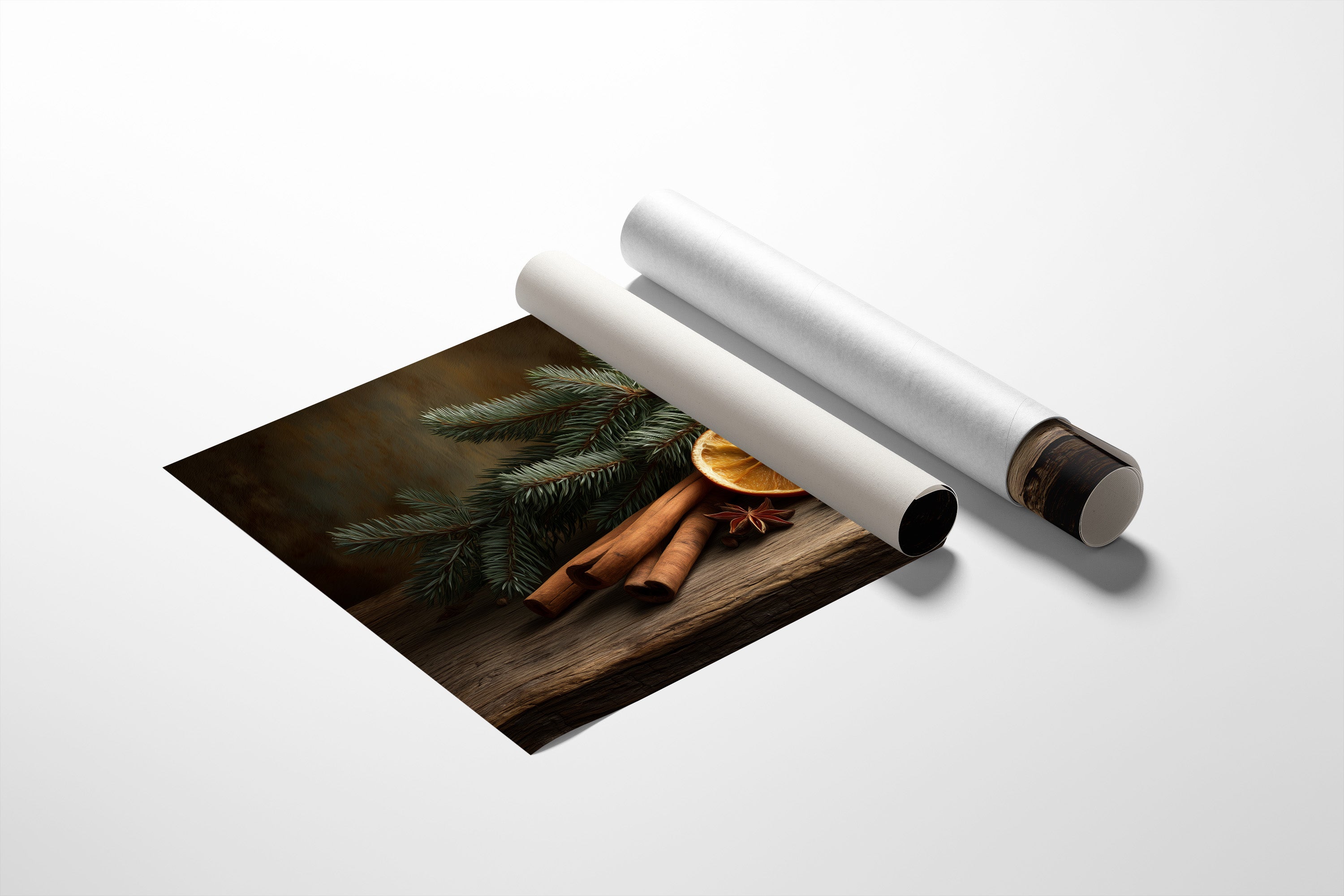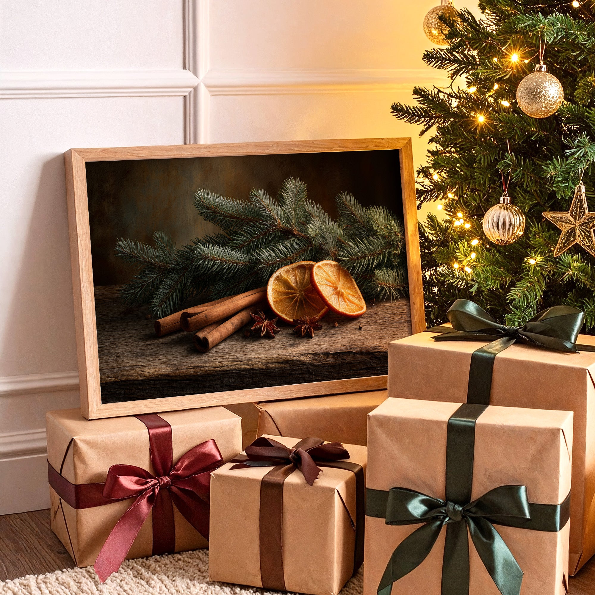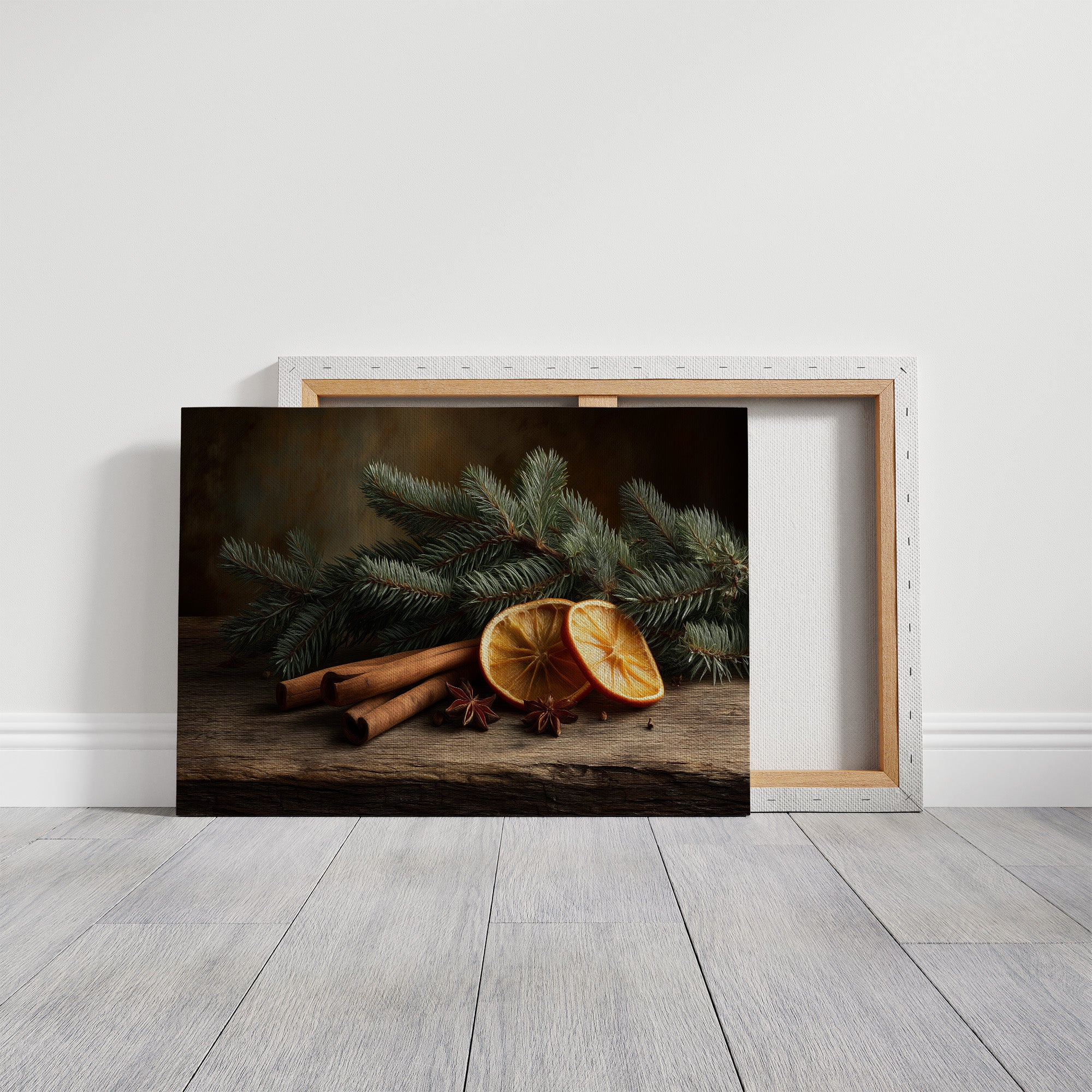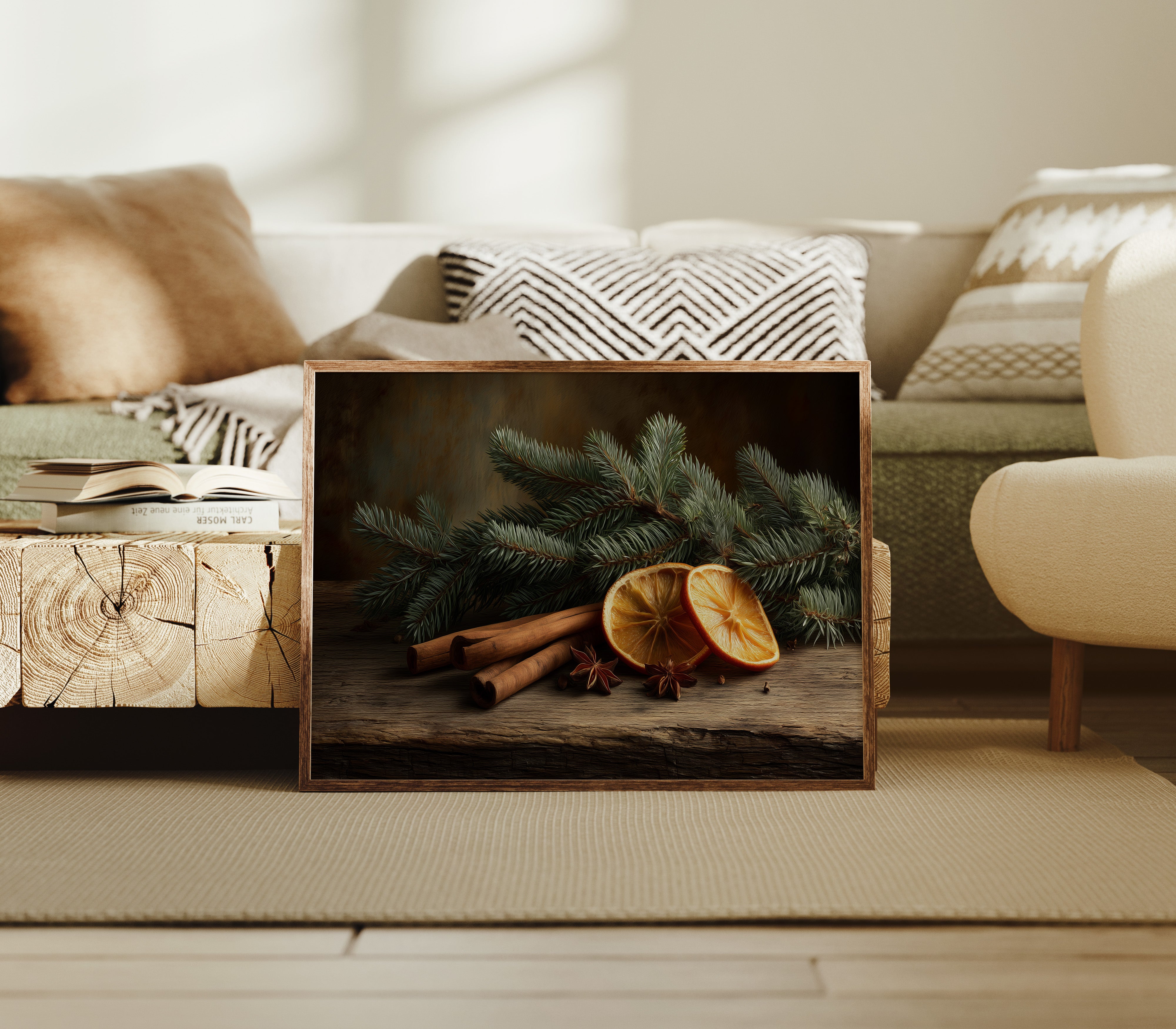 Warm orange slices catch subtle light against rustic wood, their bright flesh a striking contrast to deep evergreen boughs. Cinnamon sticks and star anise rest nearby, weaving an aromatic story of holiday traditions and winter comforts. The composition balances the fresh vitality of citrus with the earthy warmth of spices, while pine needles add a touch of forest magic to this seasonal still life. This piece brings the essence of winter entertaining and festive gatherings into your space. Perfect for creating a cozy atmosphere in dining rooms or kitchens where family recipes come to life during the holiday season.