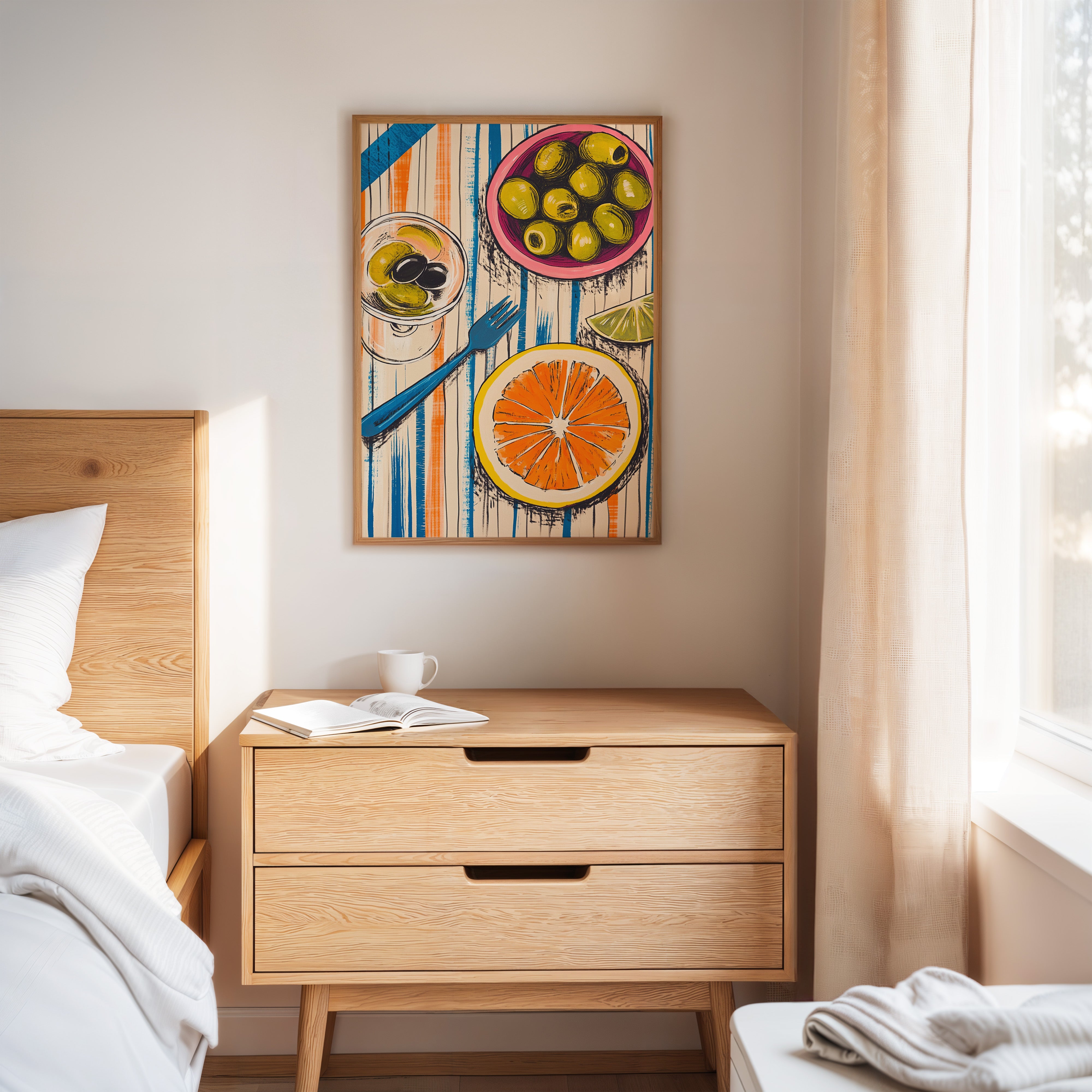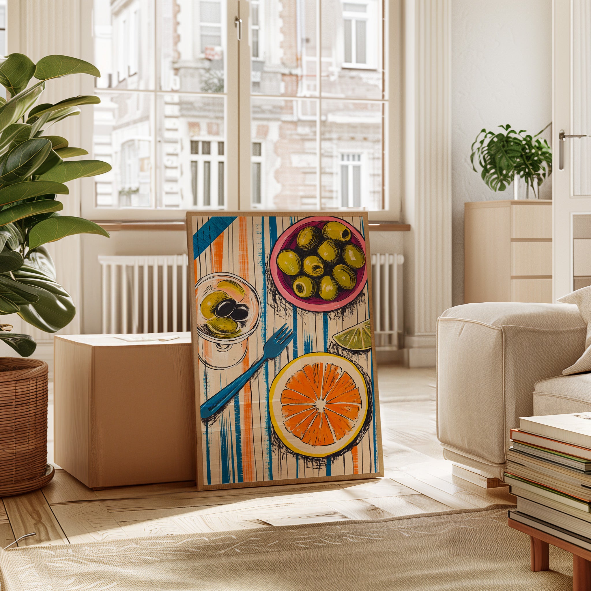 A vibrant celebration of Mediterranean appetizers comes alive through bold strokes and playful composition. Plump olives rest in pink and peach bowls while a perfectly sectioned orange slice commands attention with its brilliant hue. Electric blue utensils and striped textures create a rhythmic dance across the surface, while hints of lime add a fresh burst of zesty energy. This contemporary take on classic kitchen motifs transforms a simple spread into a moment of pure culinary joy.