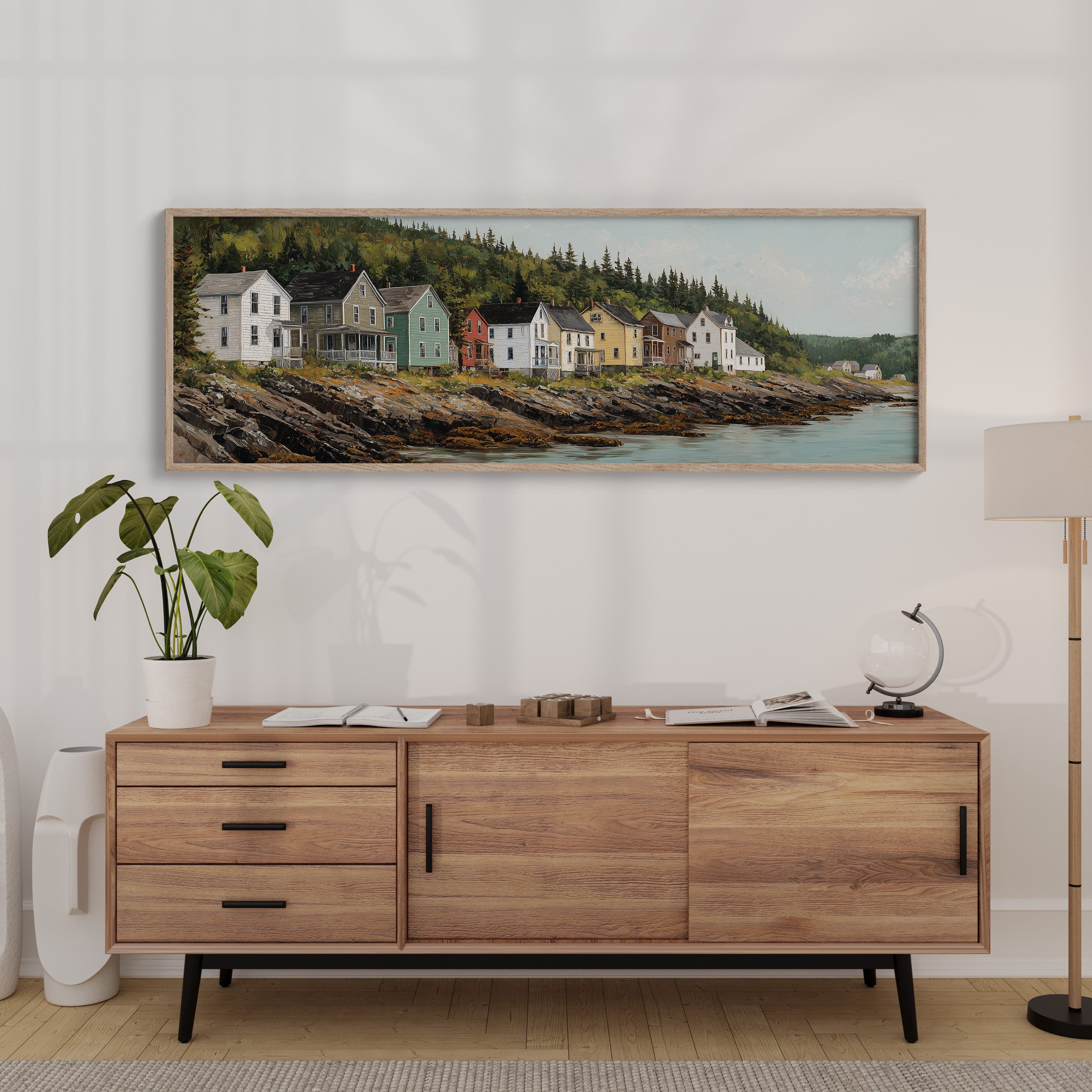 Colorful coastal houses line a rocky shoreline, their weathered porches overlooking calm tidal waters as evergreen forests rise behind them. Soft light warms the quaint row of homes, creating a nostalgic sense of seaside living—quiet mornings, sea breezes, and the gentle rhythm of small-town life. Perfect for coastal décor, living rooms, or entryways, this artwork brings charm, warmth, and New England serenity to any space.