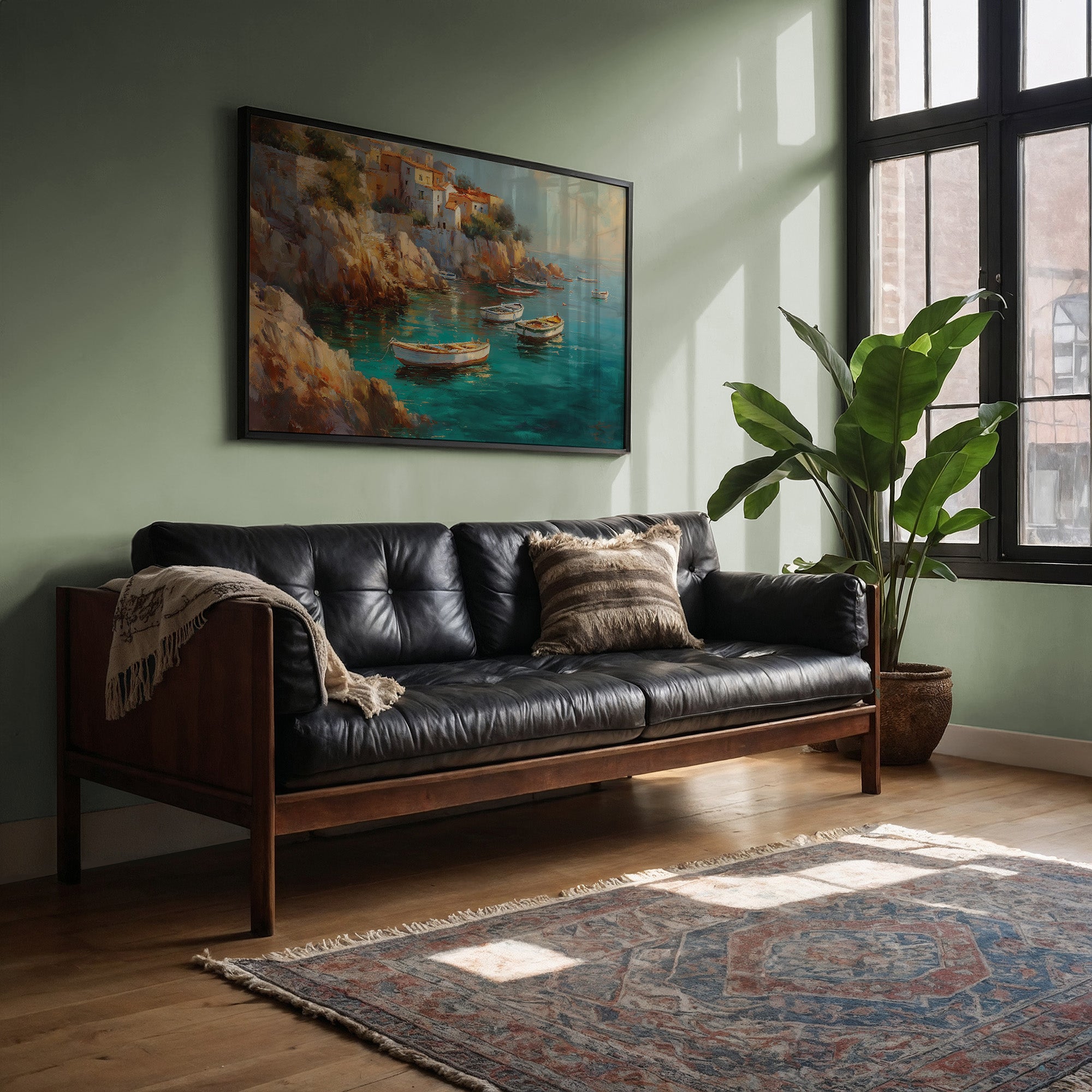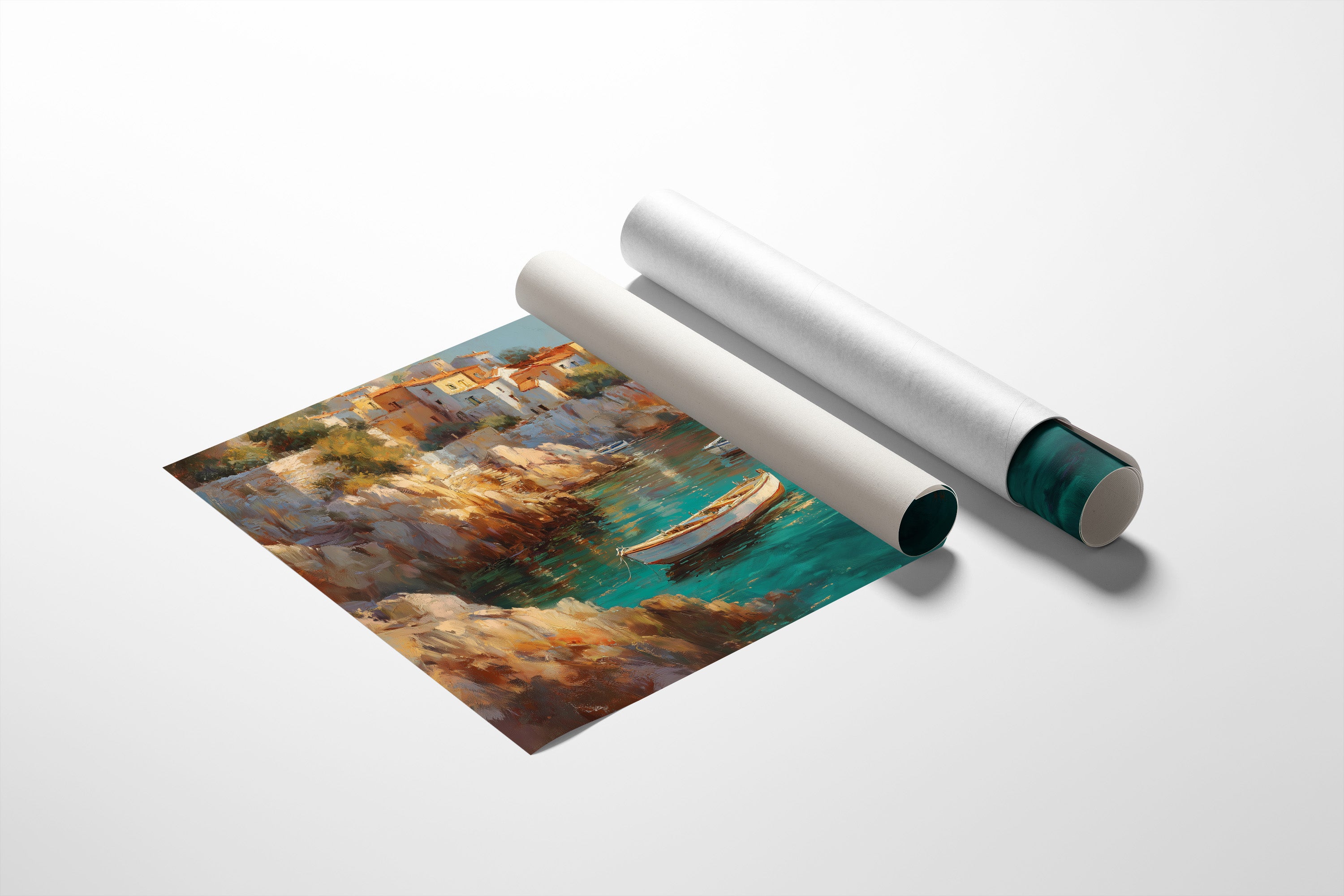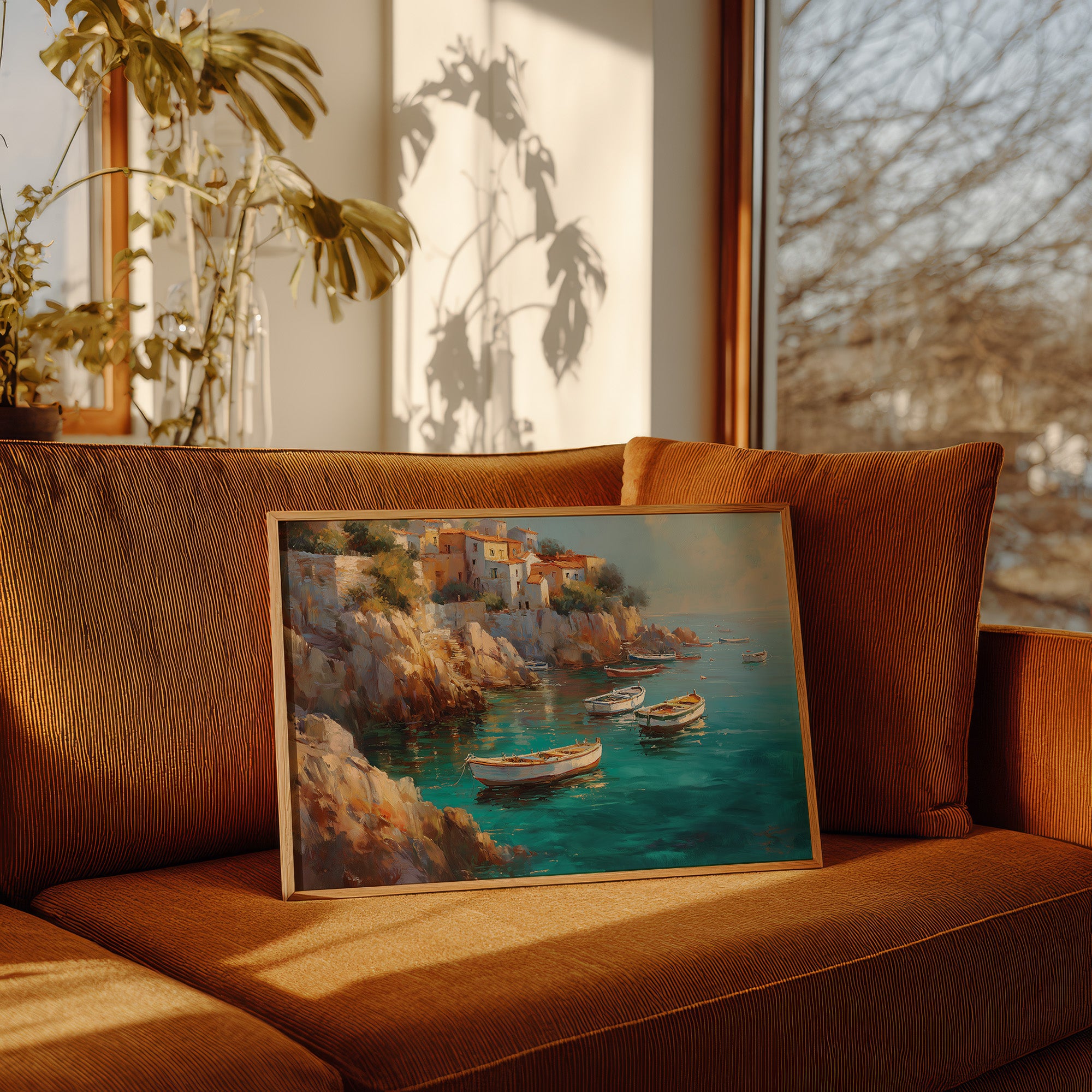 Sunlight bathes terracotta rooftops as they cling to rugged cliffs above impossibly blue waters. The painting captures that perfect Mediterranean moment where time seems suspendedfishing boats gently bobbing on turquoise waves while the ancient village rises from golden rock faces. The impressionist brushstrokes create a textural feast, blending warm ochres and burnt sienna of the sun-drenched architecture with the cool cerulean depths below. This coastal escape brings a sense of wanderlust and serenity to dining rooms or living spaces where you long to be transported to faraway shores.