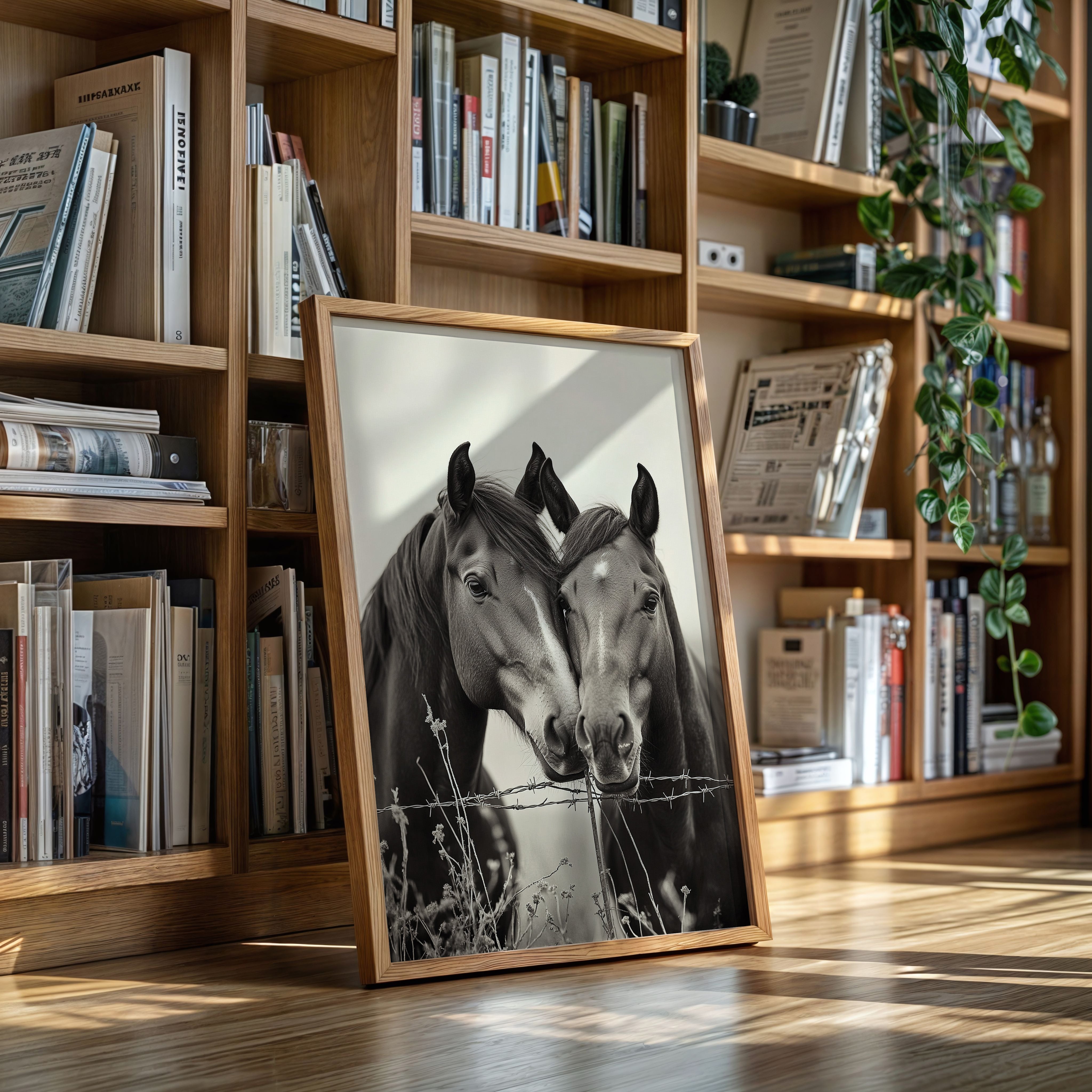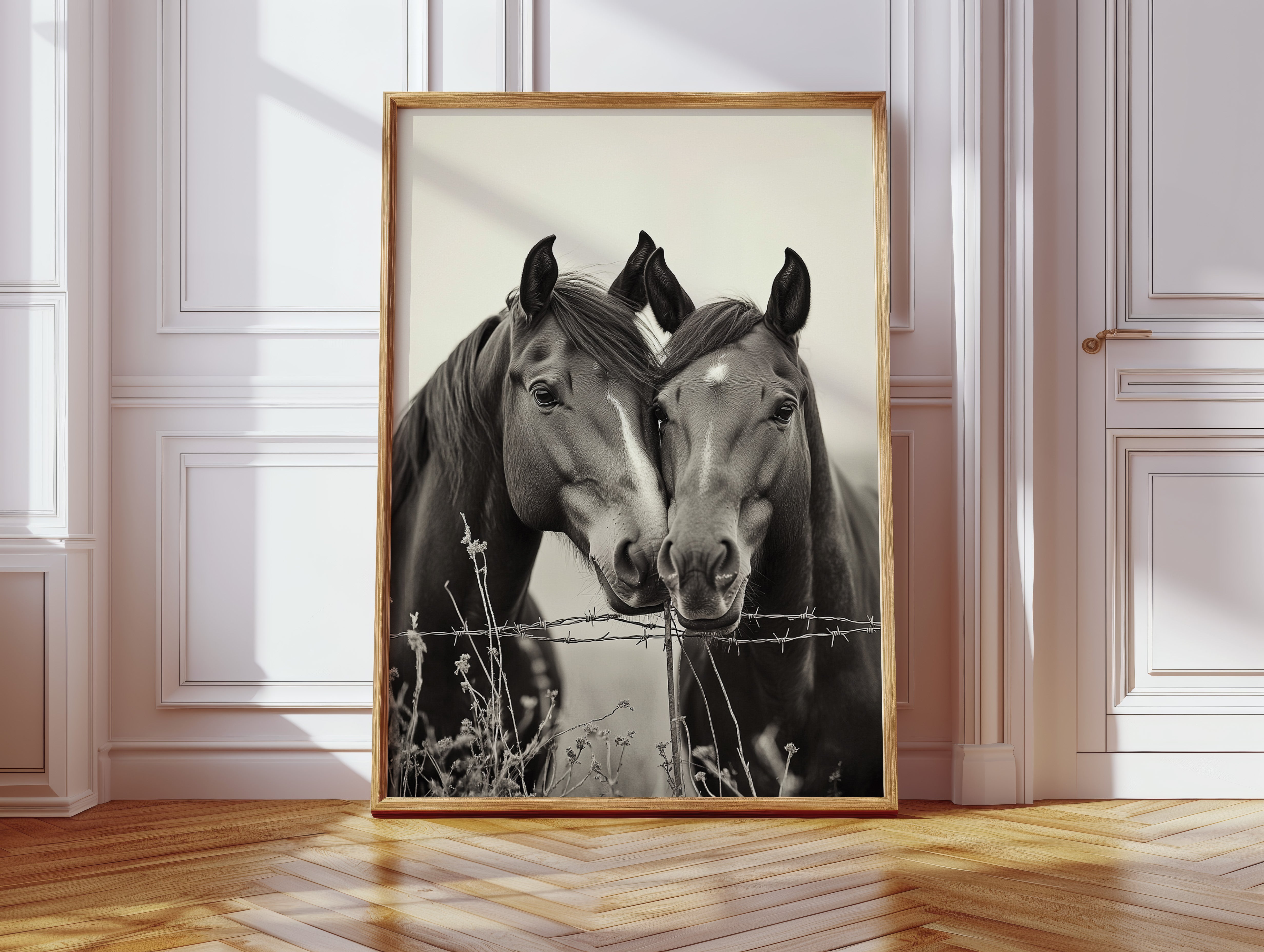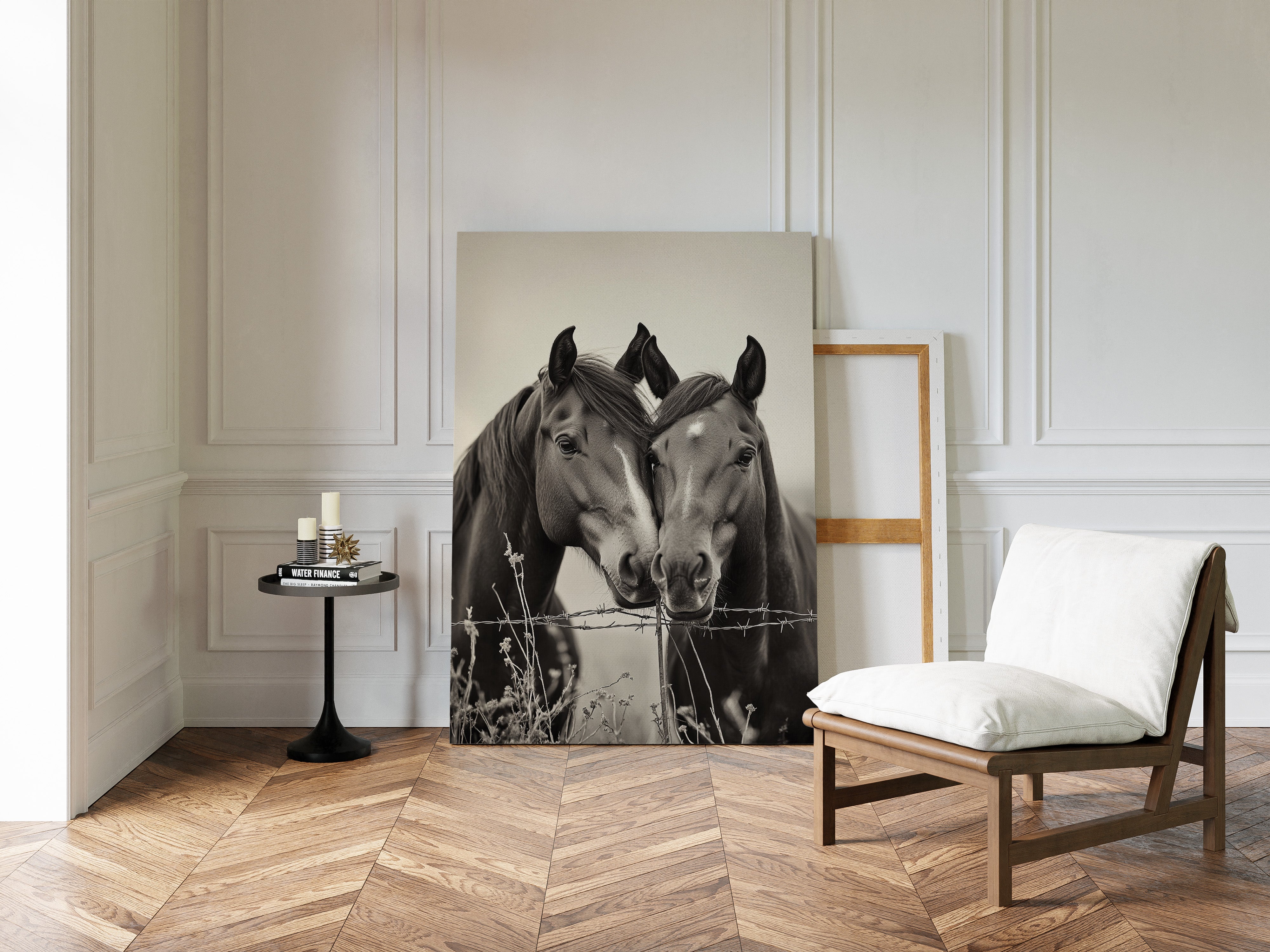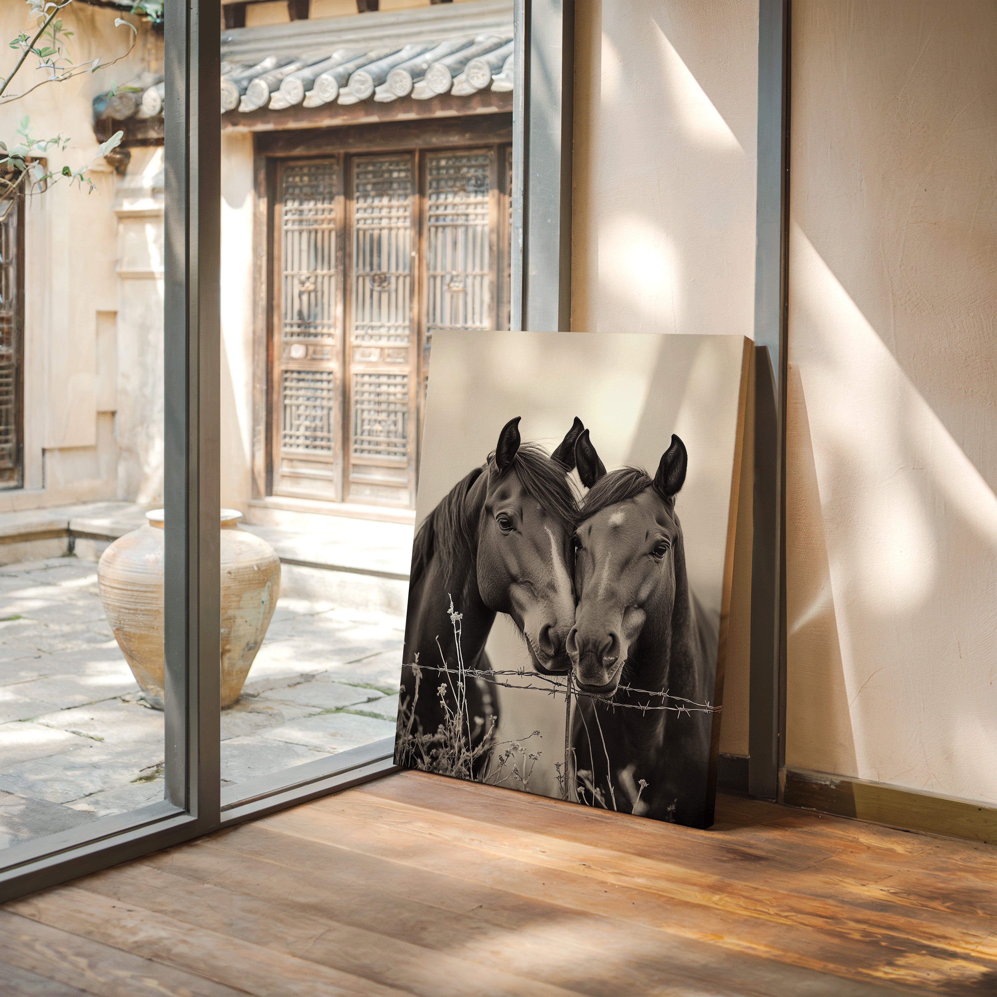 Two horses press close, their faces gently touching in a quiet display of trust. This black and white portrait captures a moment of pure equine connection.