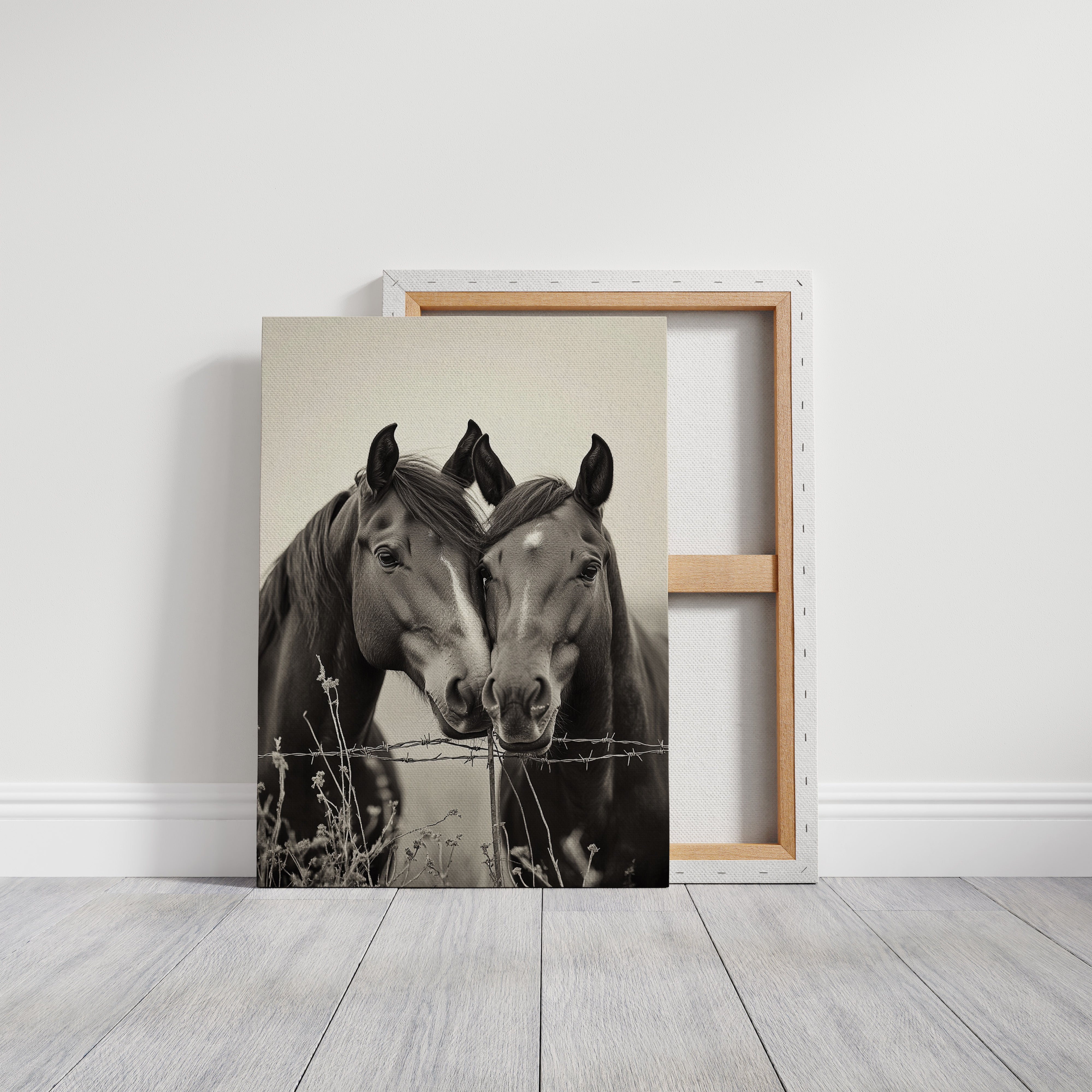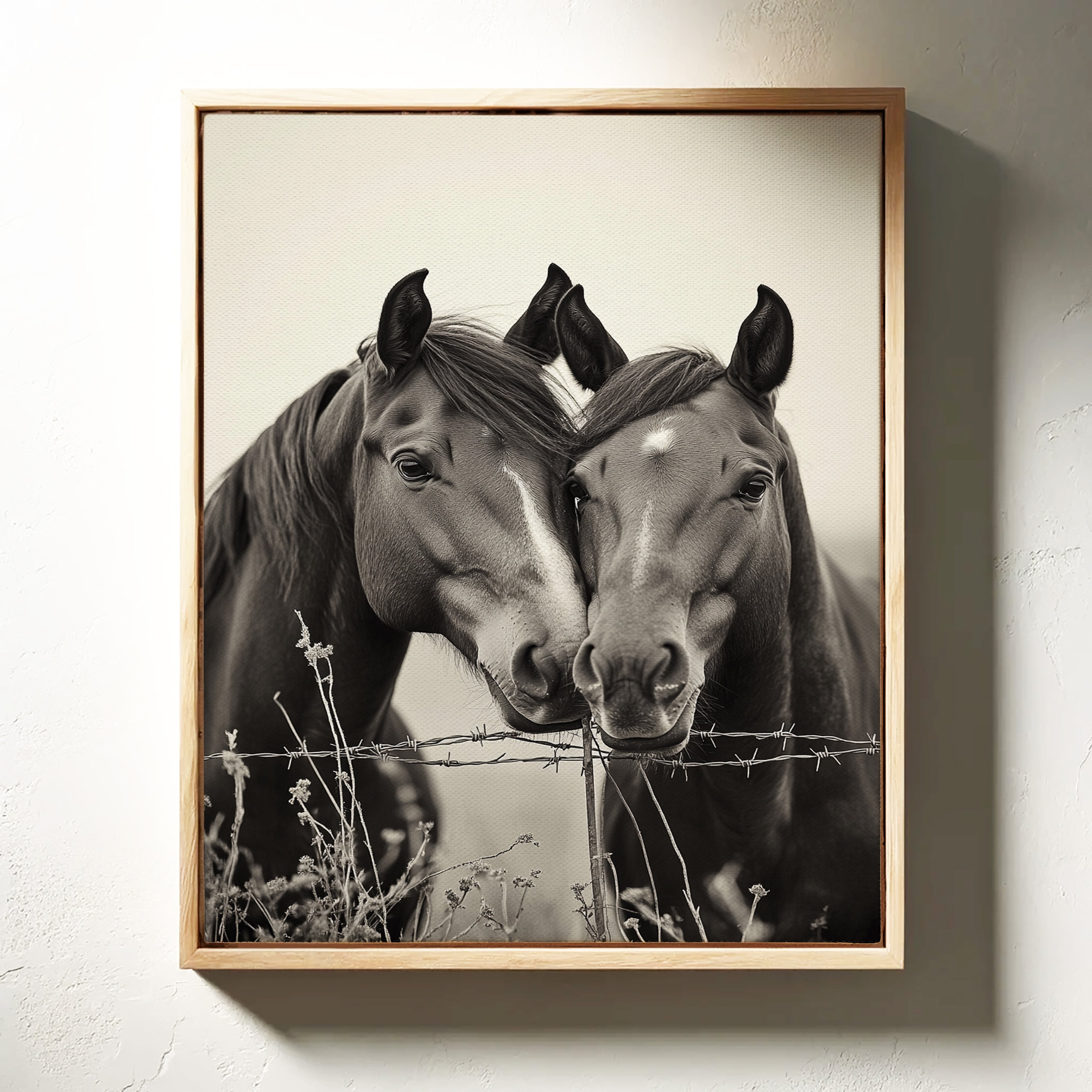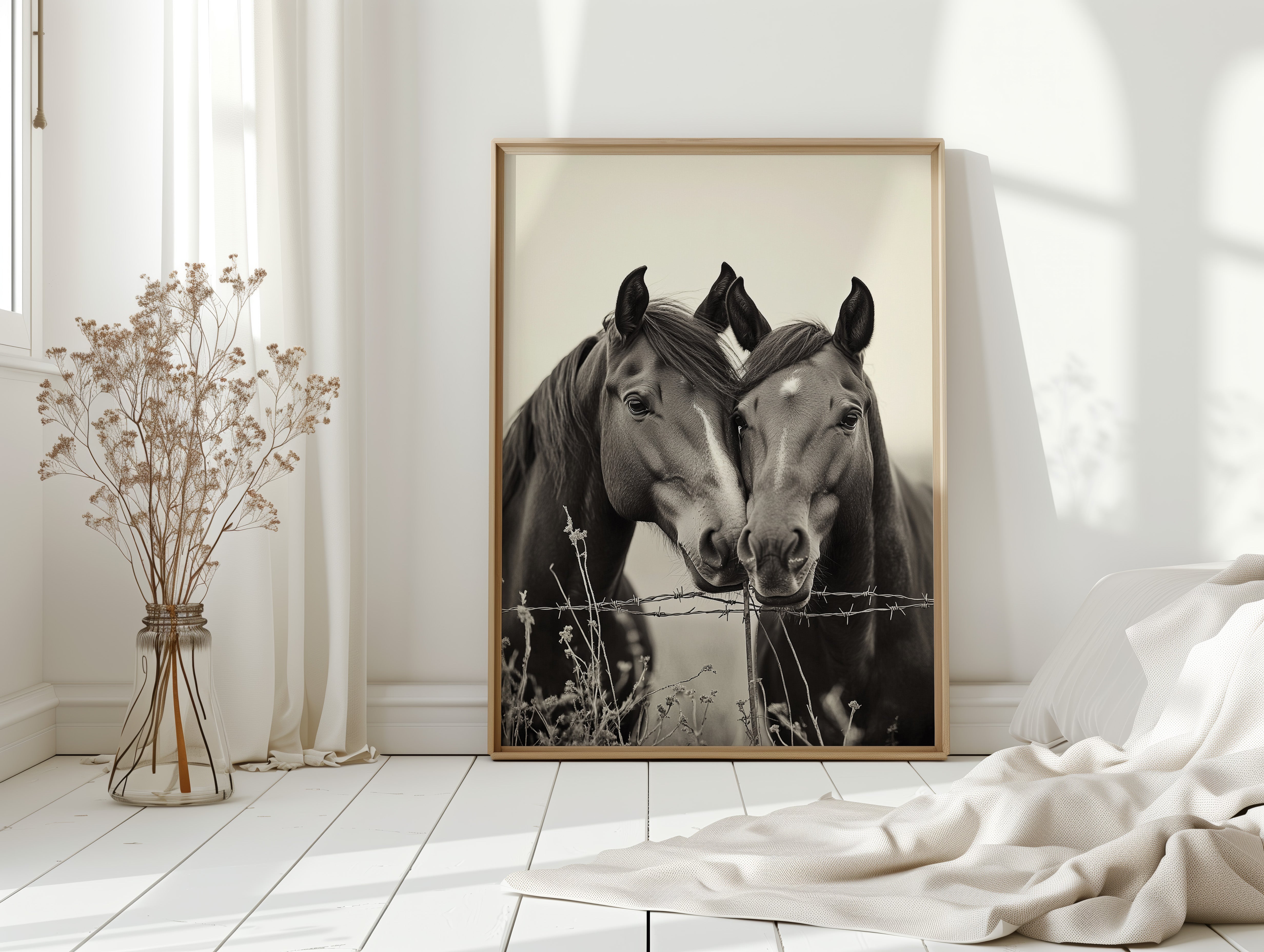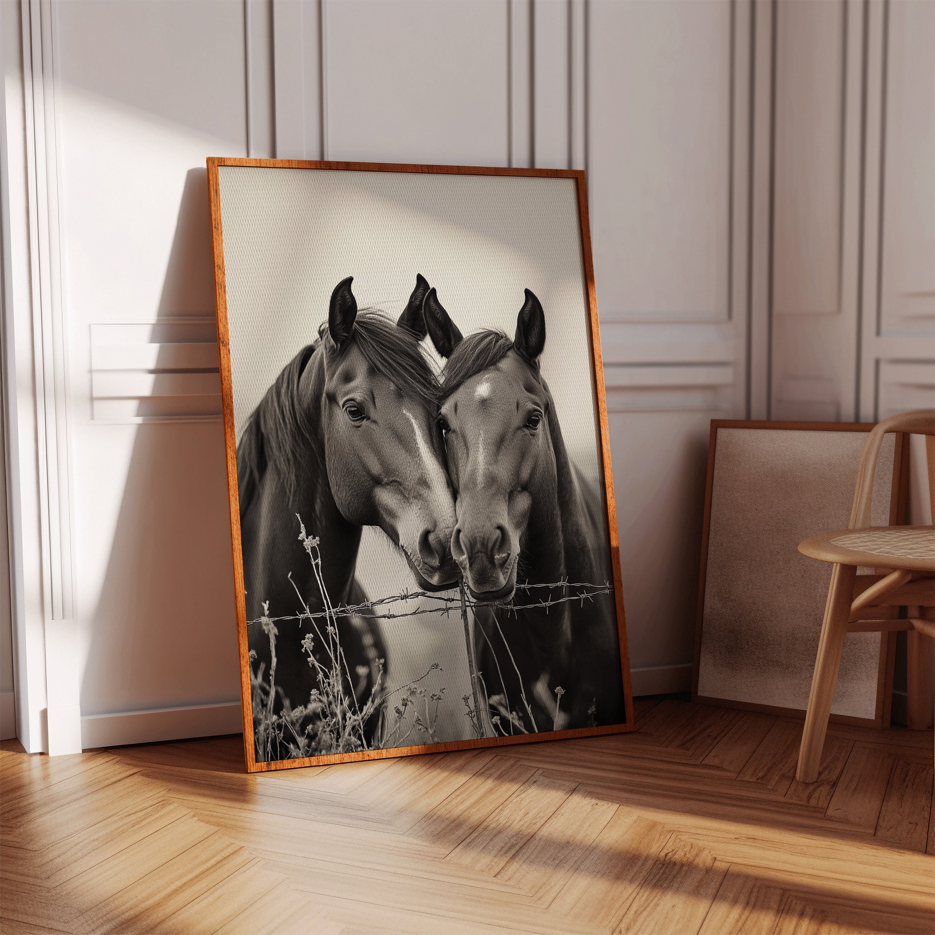 Two horses press close, their faces gently touching in a quiet display of trust. This black and white portrait captures a moment of pure equine connection.