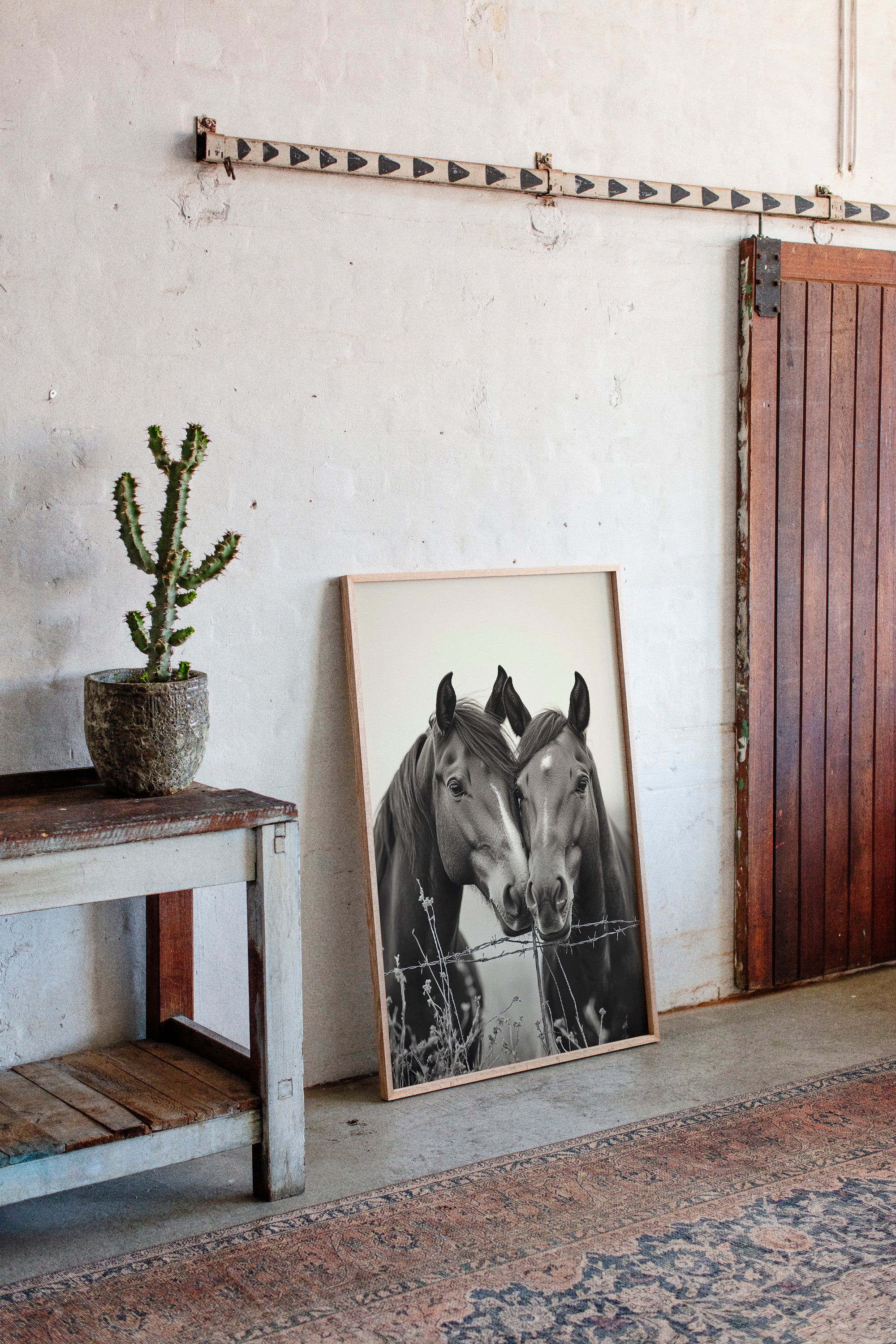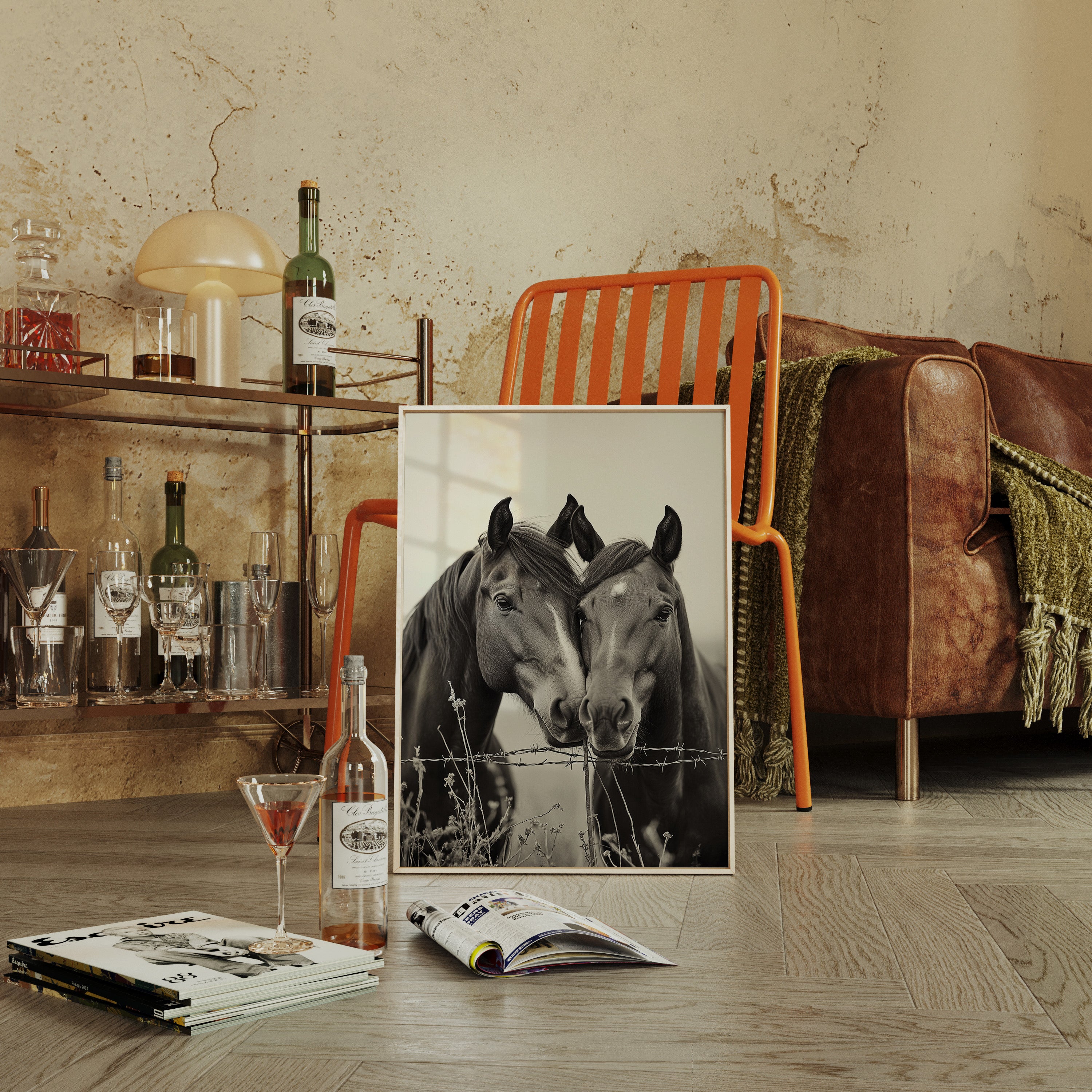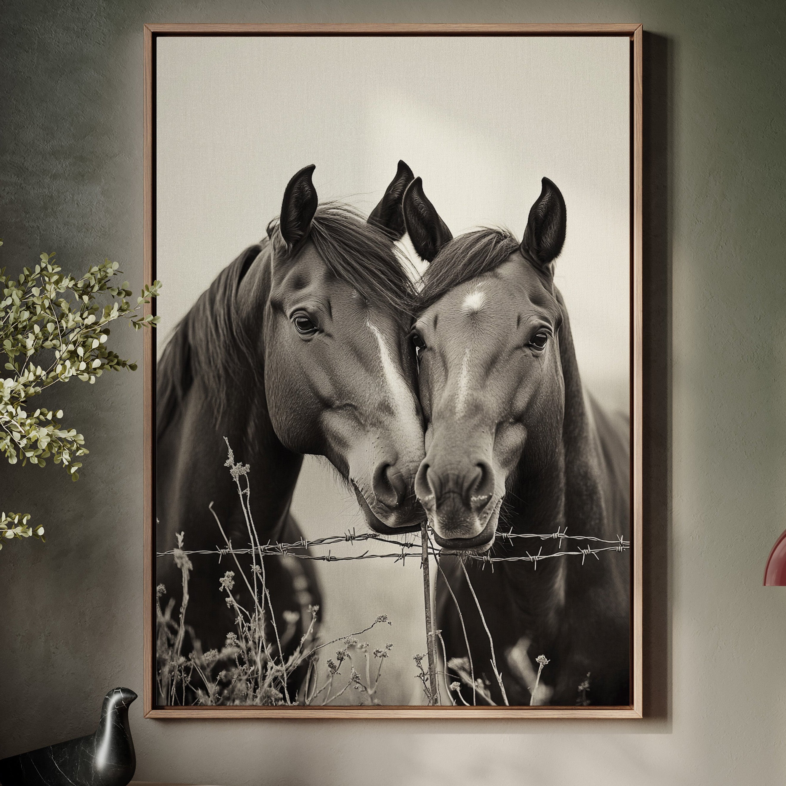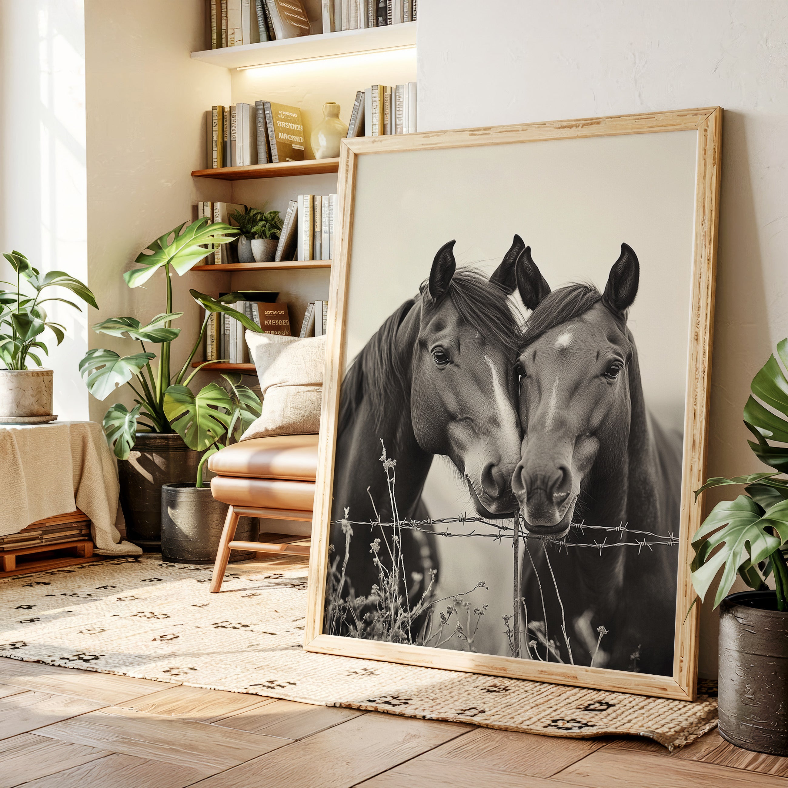 Two horses press close, their faces gently touching in a quiet display of trust. This black and white portrait captures a moment of pure equine connection.