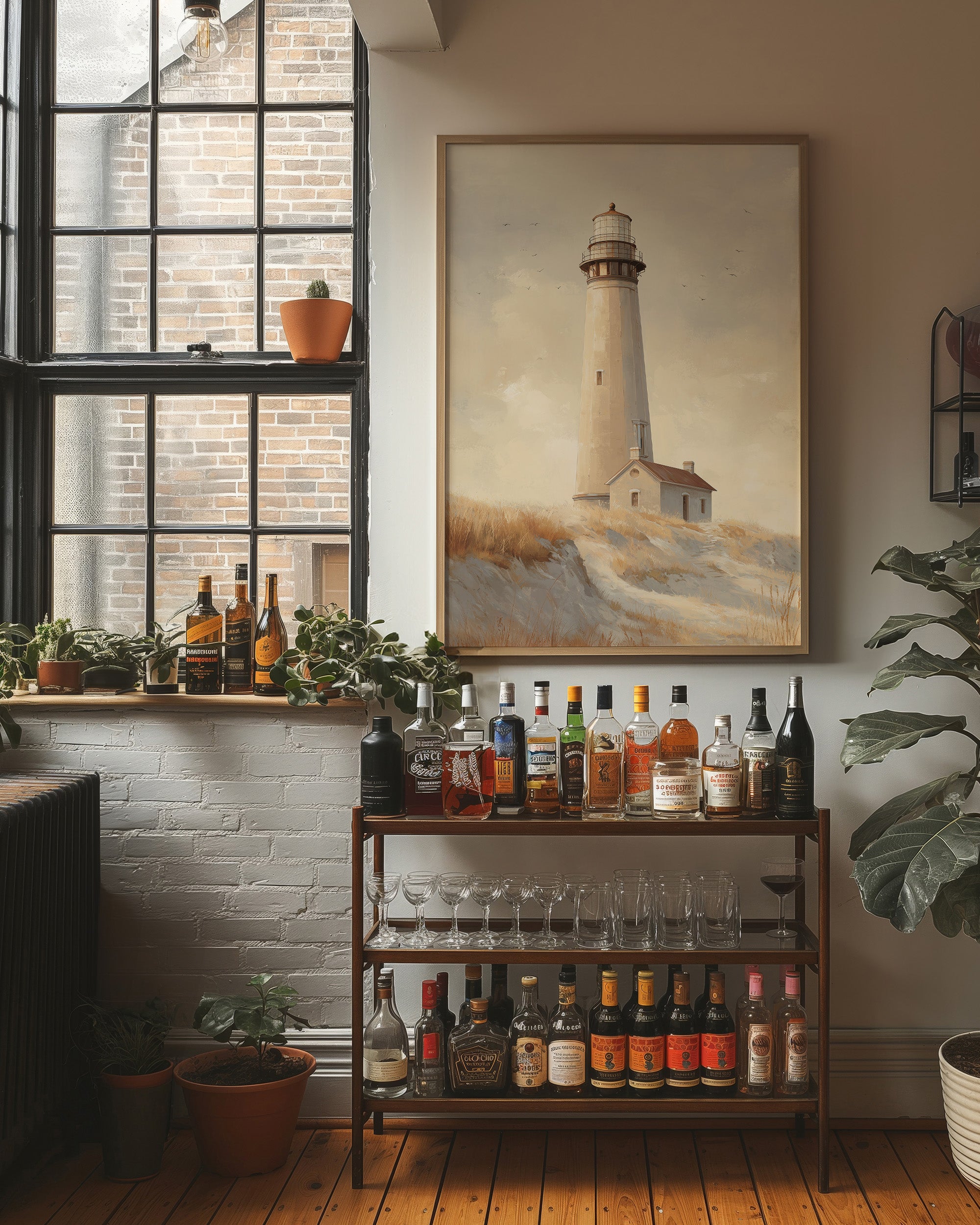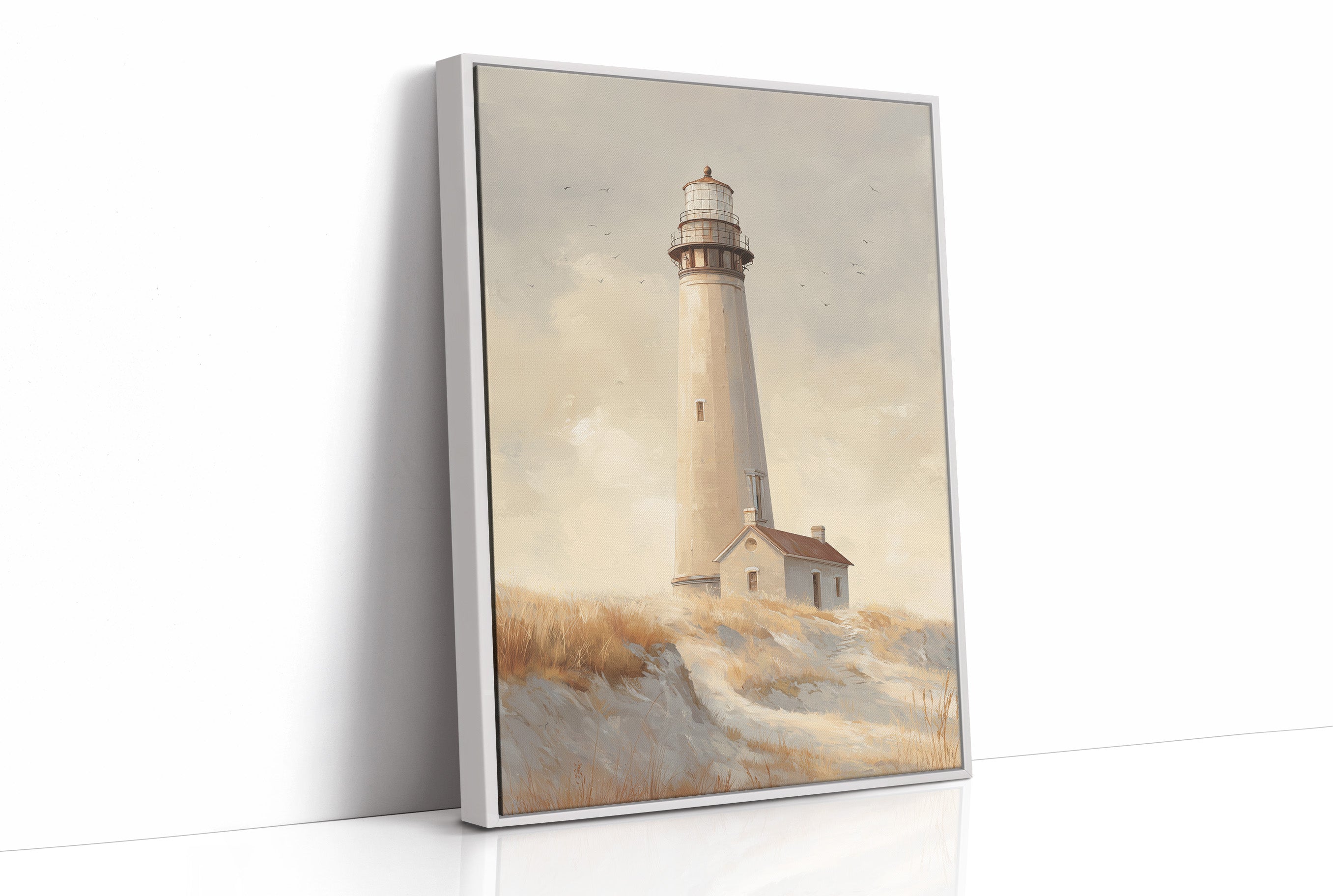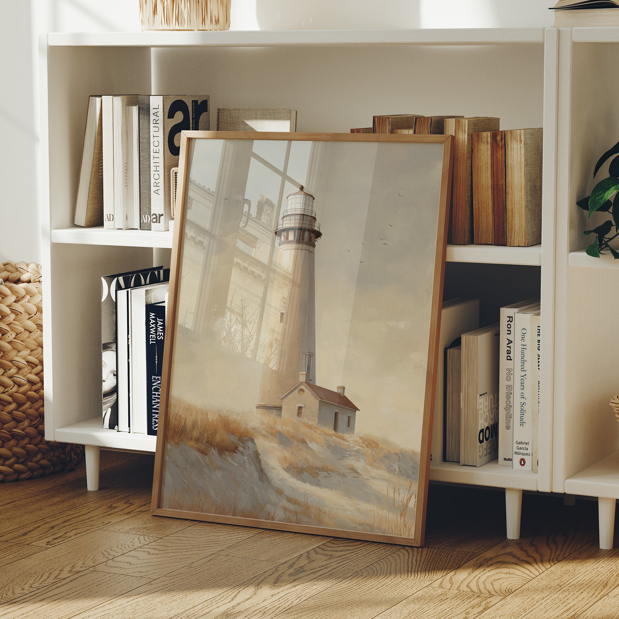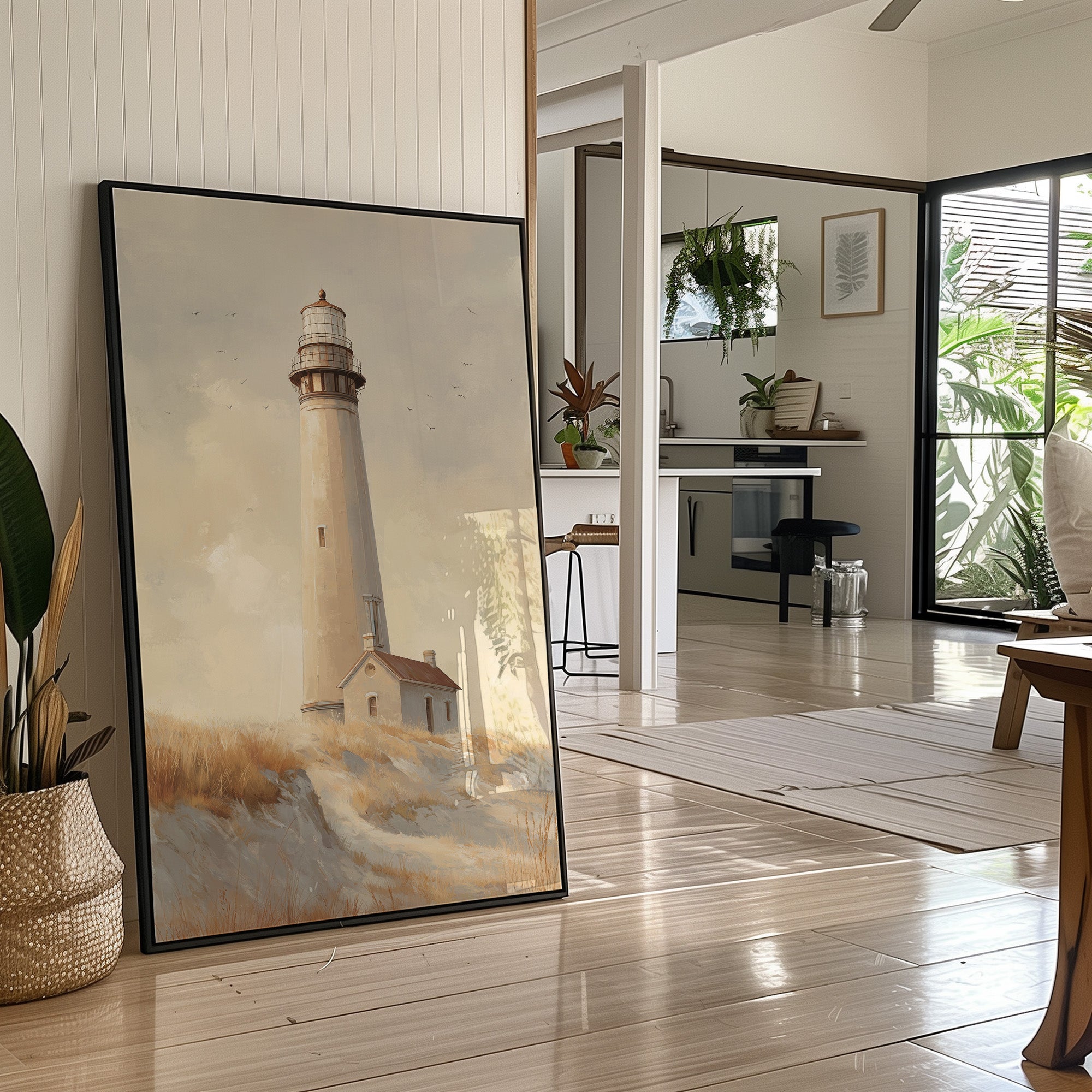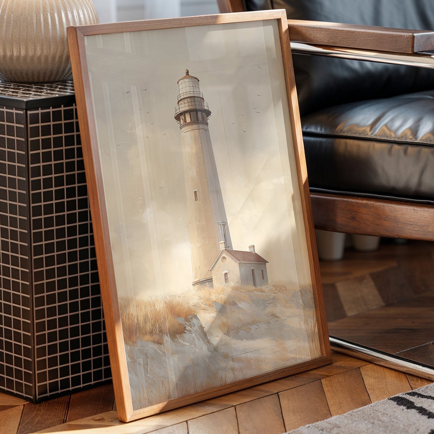 Morning light spills across the scene, illuminating a framed lighthouse painting resting against a modern leather chair. The artwork captures a solitary sentinel standing tall among golden grasses, painted in soft, misty neutrals that evoke coastal nostalgia. The warm wooden frame complements the mid-century furniture surrounding it, creating a harmonious dialogue between the maritime imagery and the sophisticated interior elements.