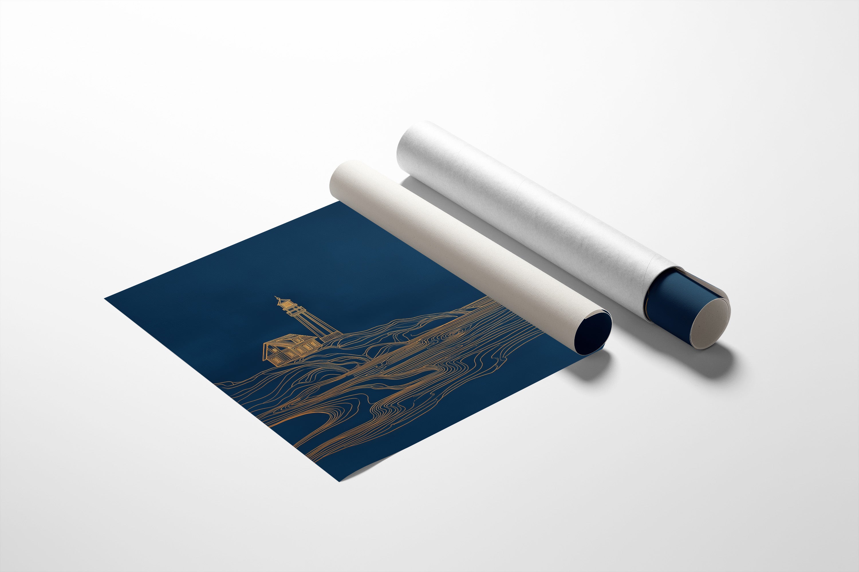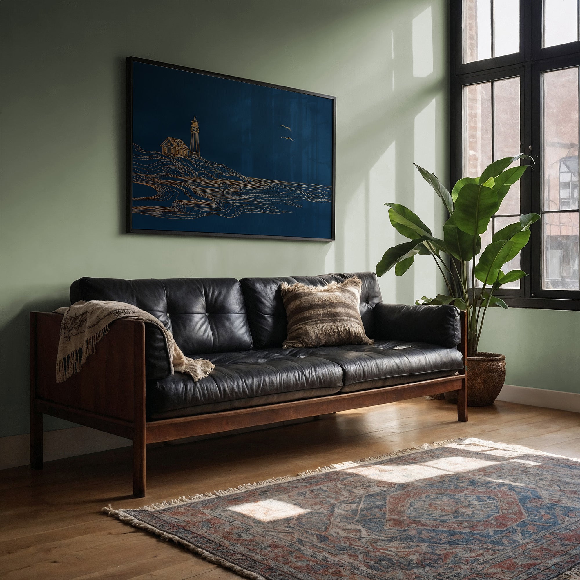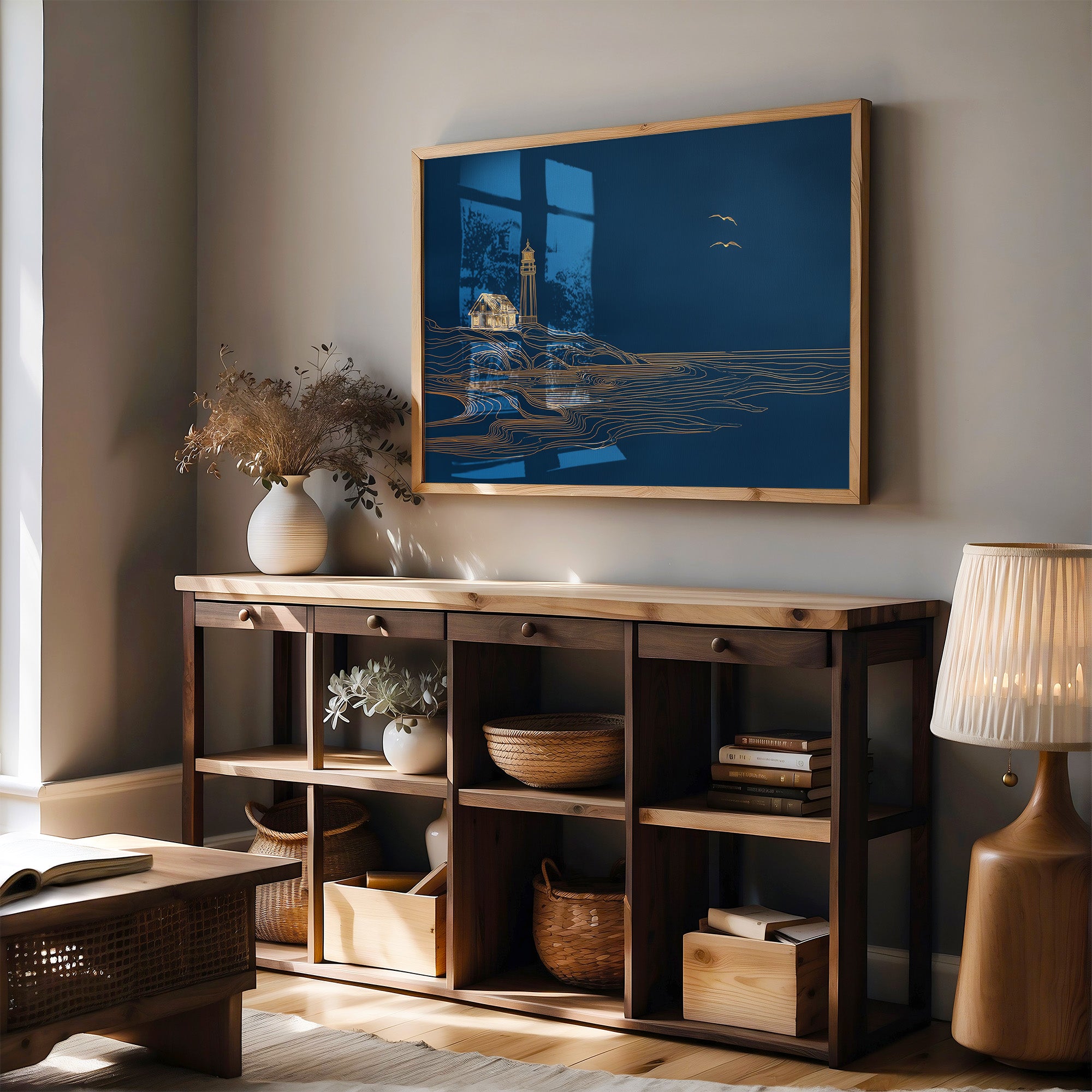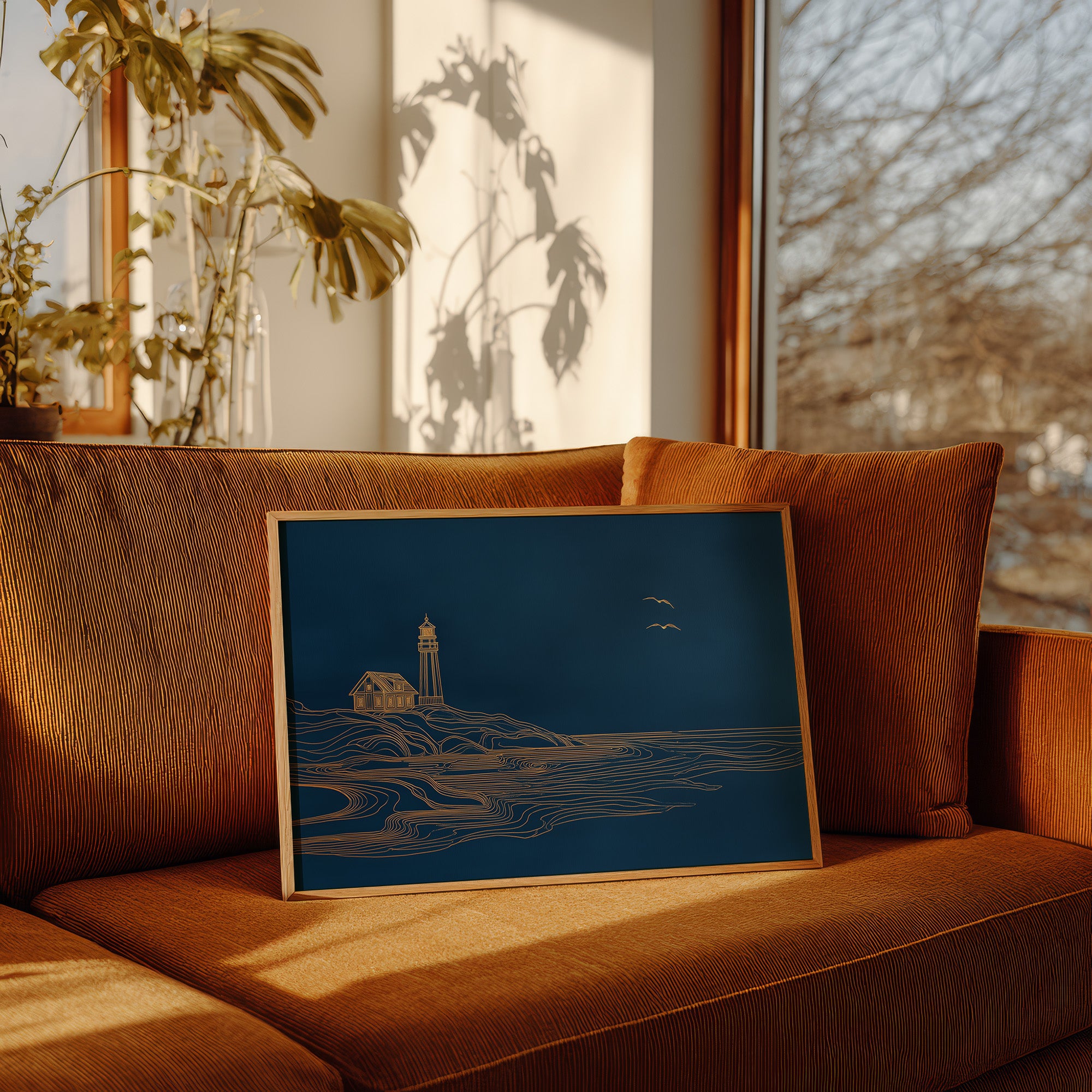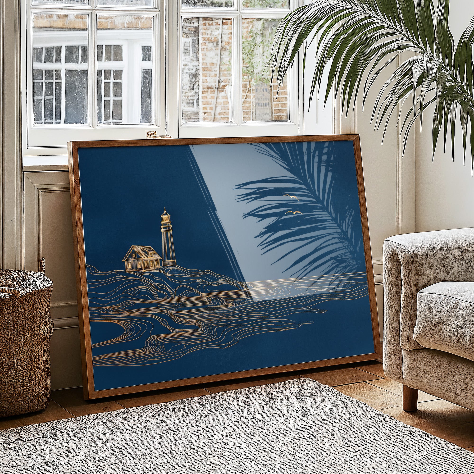 Golden lines trace a solitary lighthouse standing vigilant against the deep navy backdrop, like a midnight memory etched in starlight. The elegant illustration captures the flowing movement of waves meeting rocky shores, with delicate birds soaring abovea perfect balance of tranquility and maritime adventure. This sophisticated coastal scene brings timeless nautical elegance to any space, creating a focal point that invites contemplation and calm.