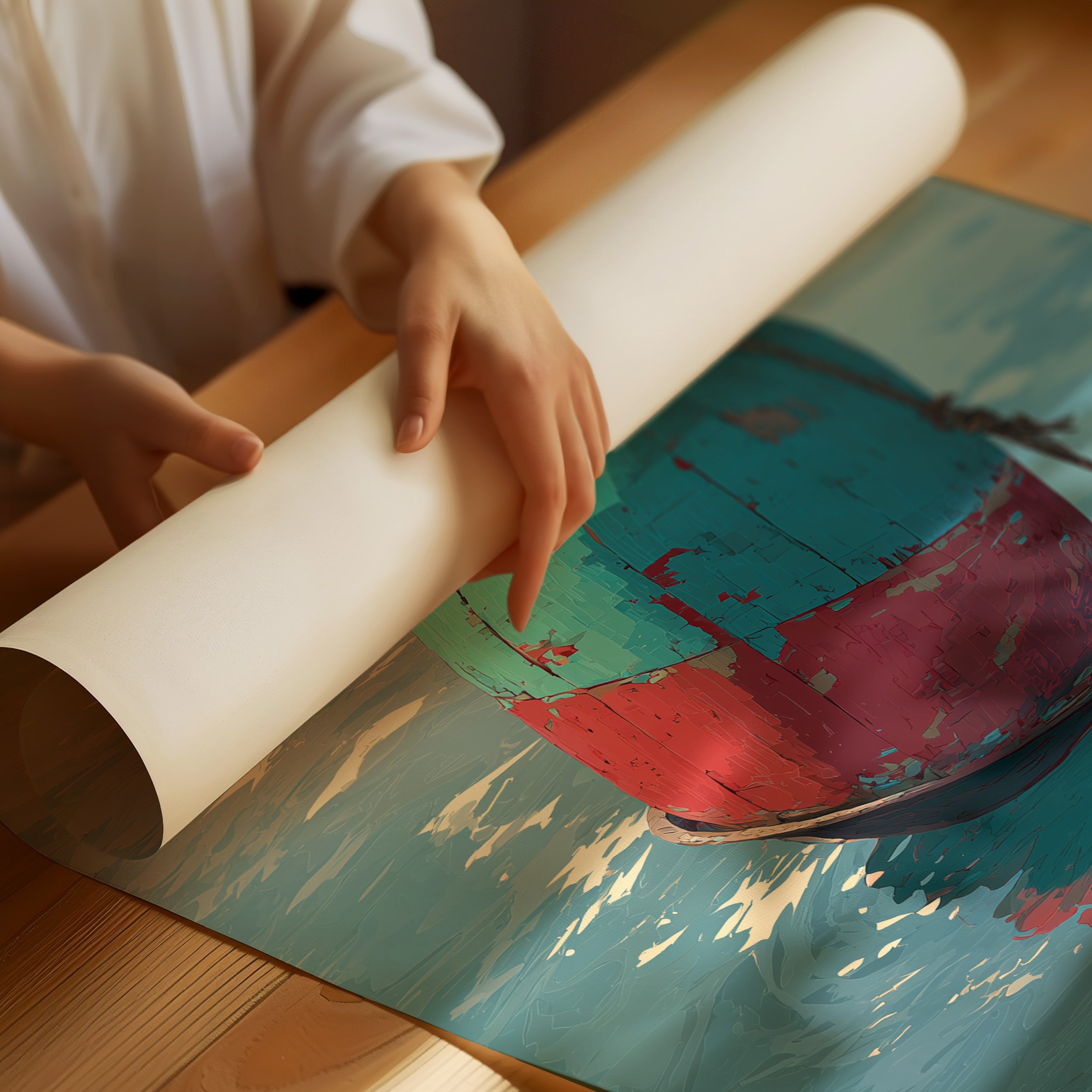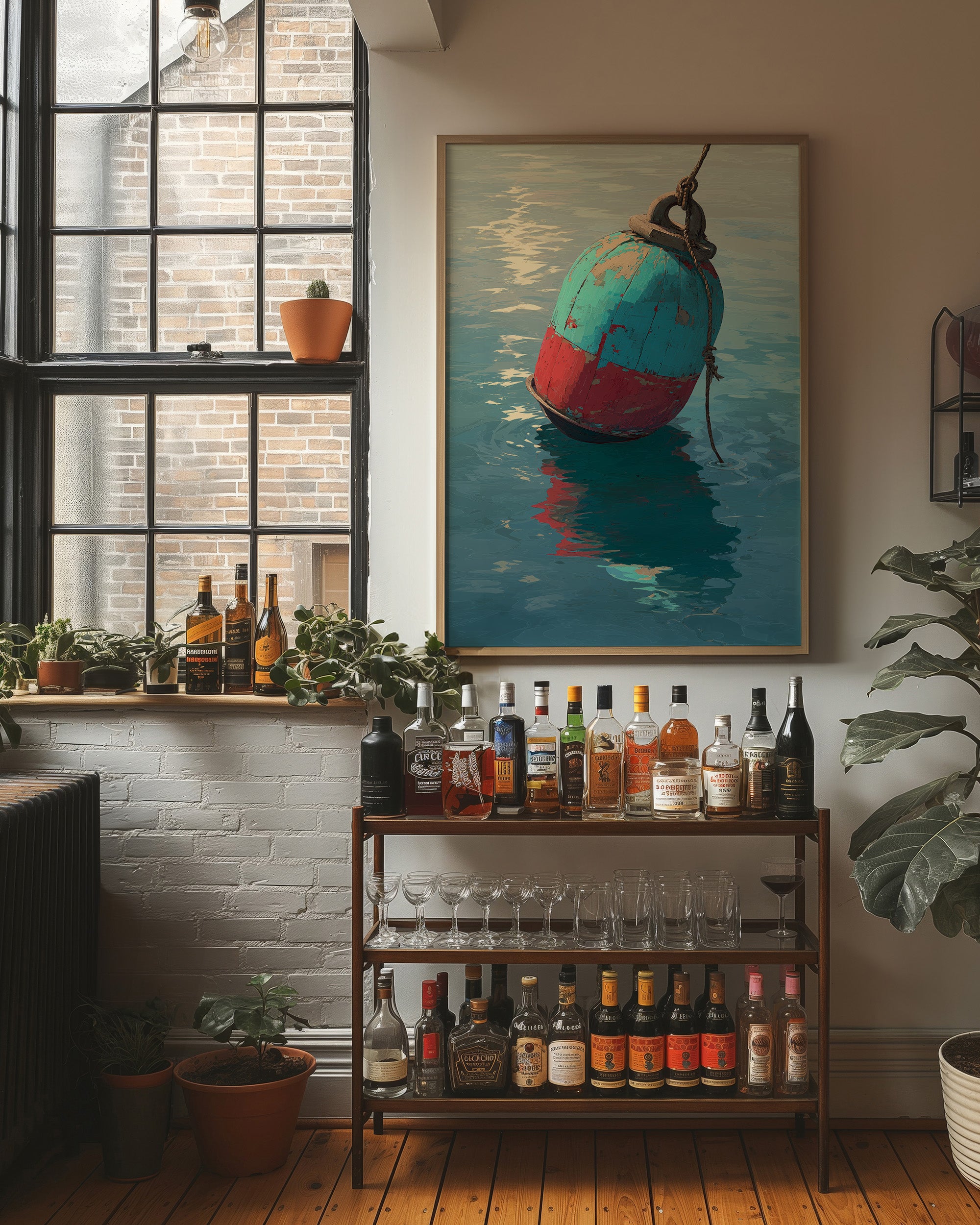Sunlight catches the weathered patina of a floating buoy, its turquoise and coral surfaces telling stories of salt and time. The gentle ripples mirror its form, creating a conversation between object and element in tranquil coastal waters. This nostalgic maritime piece brings the contemplative rhythm of shoreline living into your space.