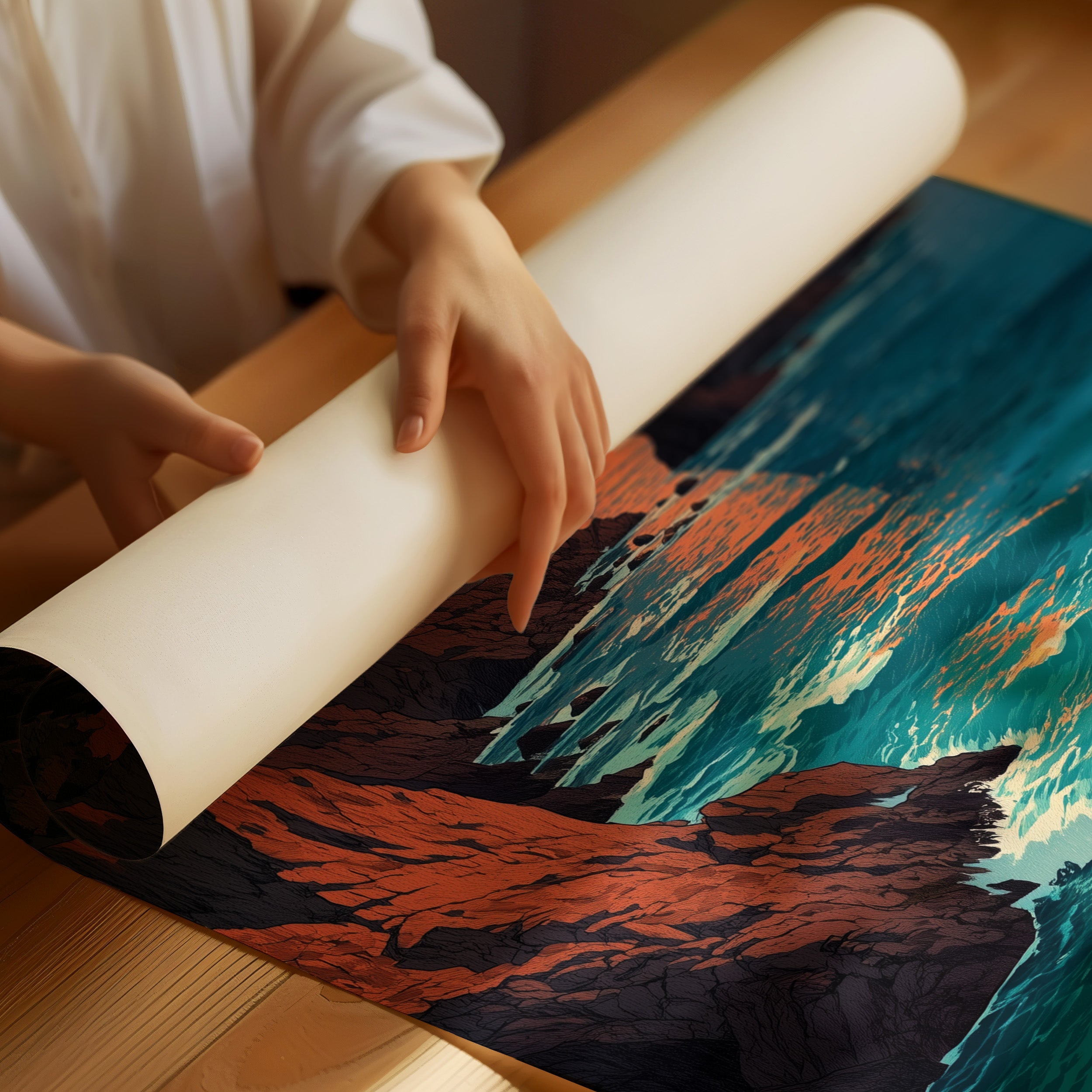 Turquoise waves crash against rugged coastal cliffs as a golden sun hangs low in a coral-streaked sky. The dramatic seascape captures nature's raw power where deep teal waters meet weathered rock formations, their shadows stretching across the turbulent surface. This contemporary piece balances the wild energy of crashing waves with the steadfast presence of ancient stone guardians, all bathed in the warm glow of dusk. This statement piece demands attention while adding sophisticated coastal energy to modern living spaces. Perfect for creating a focal point in minimal, contemporary rooms where its rich colors can take center stage.