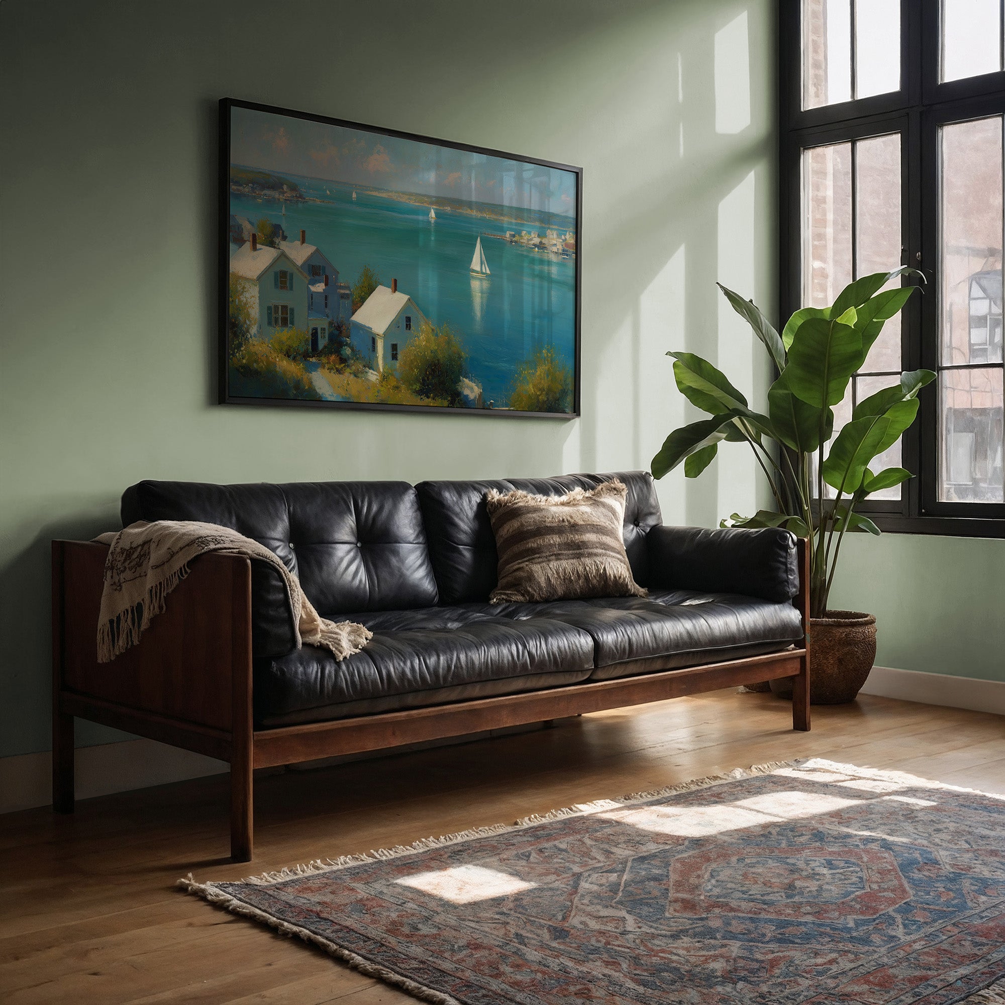 Your artwork should take up 60-75% of wall space above furniture. For standard sofas, choose 24"x36" or larger. When in doubt, go slightly bigger.