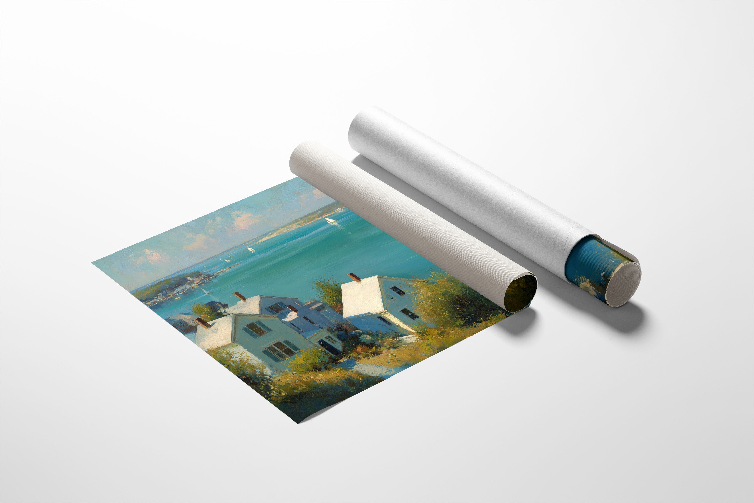 Sunlight dances across turquoise waters as white sails drift lazily between shorelines. The scene captures a perfect summer day where quaint coastal homes perch on gentle slopes, their blue-gray facades and white rooftops standing sentinel over the bay. Rich azure waters stretch toward distant shores dotted with small towns, while golden foliage frames the foreground cottages in a warm embrace. This coastal sanctuary would bring serene maritime charm to a living room, bedroom, or any space where you seek to evoke the peaceful rhythm of seaside living.
