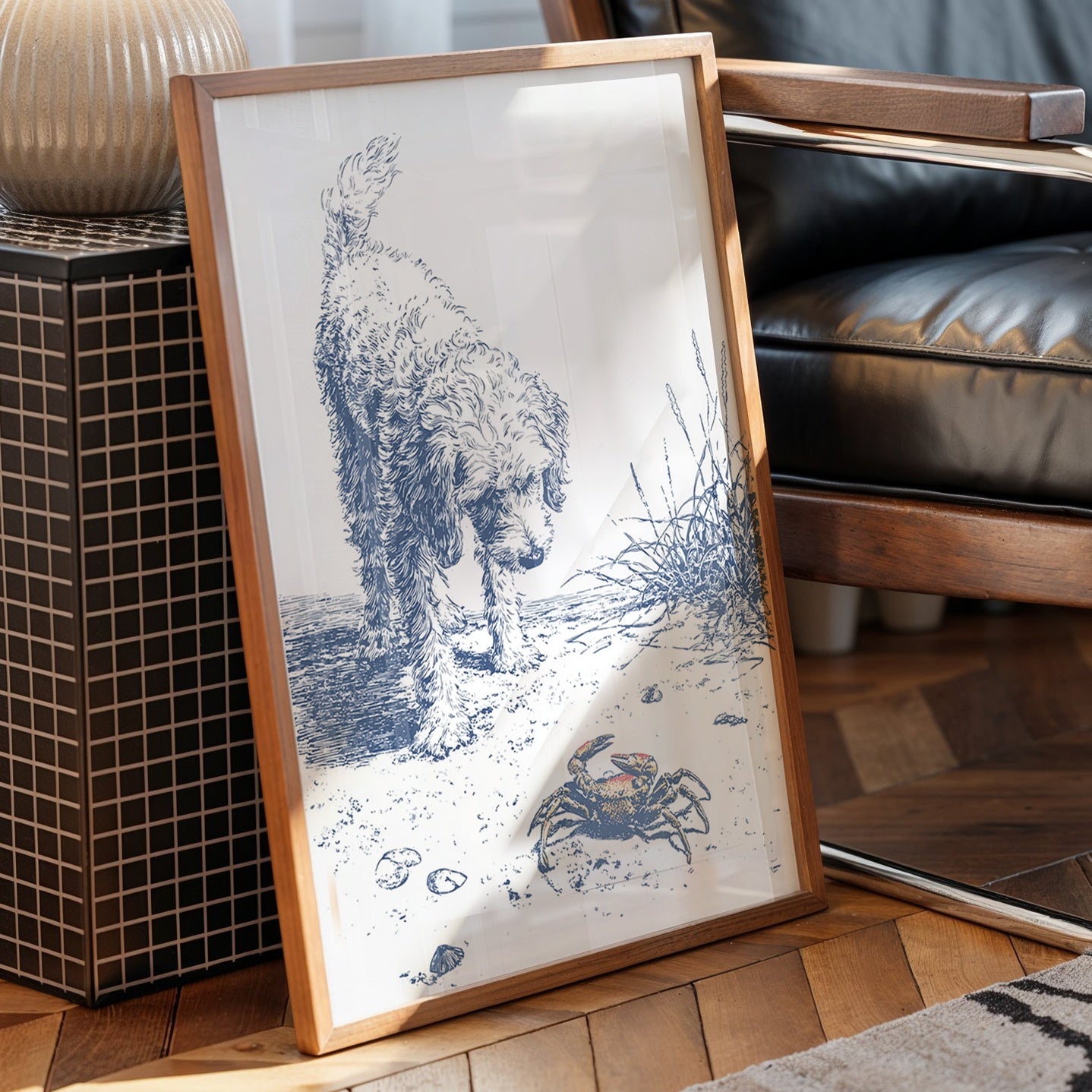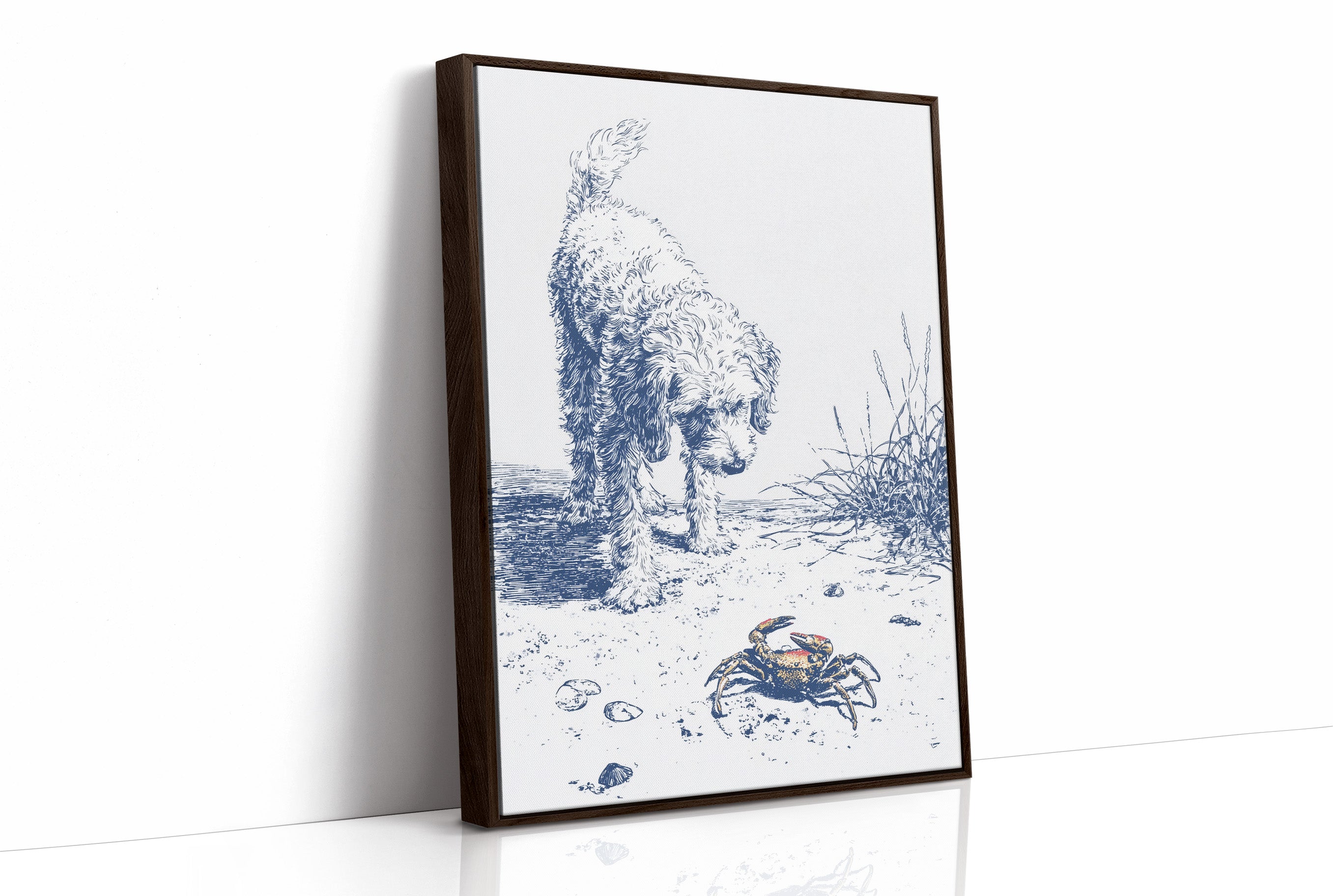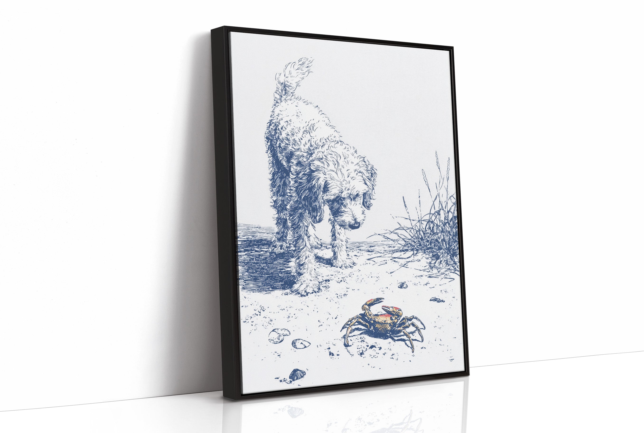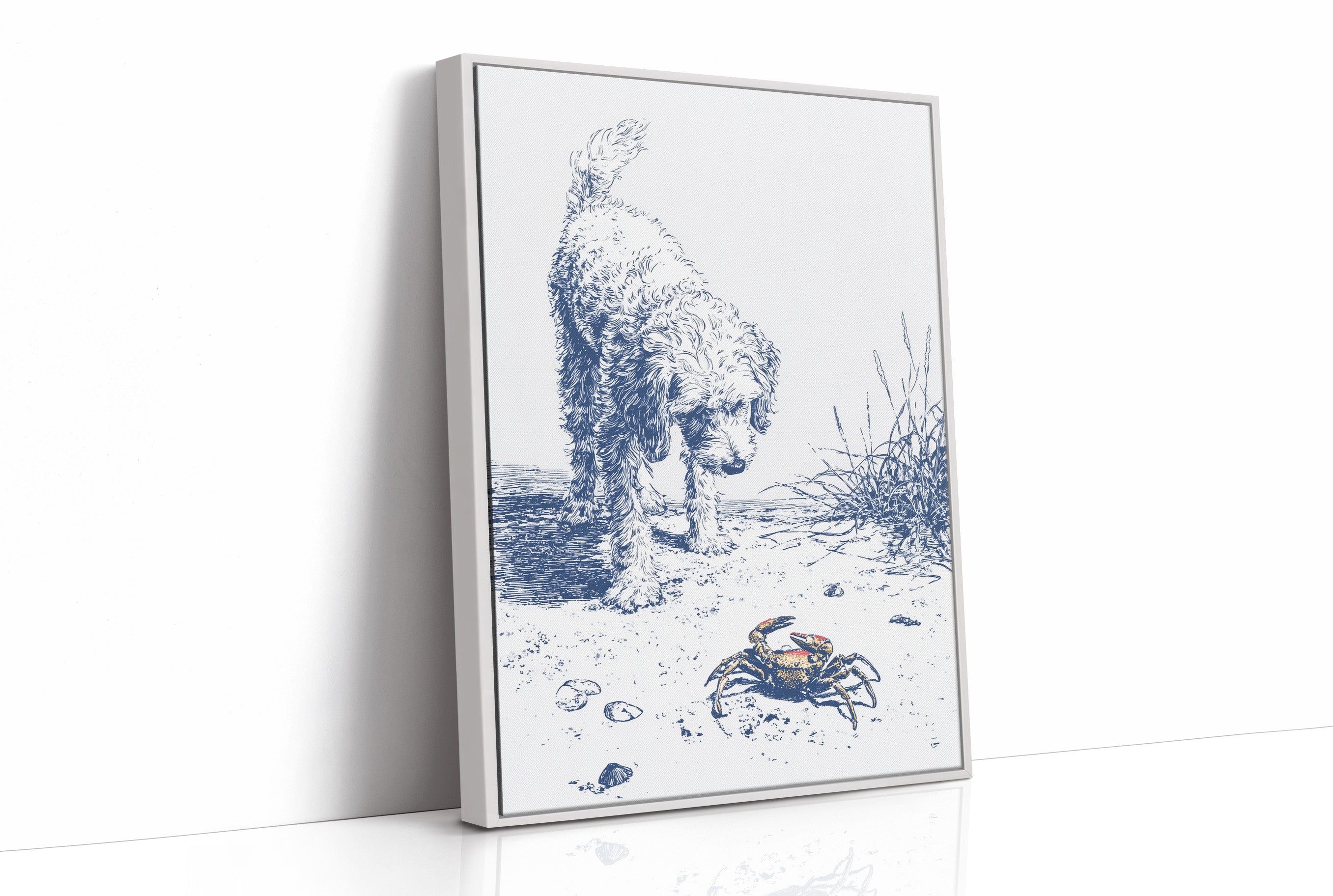 A delicate blue and white illustration on canvas depicts a curious curly-haired dog investigating a small crab on a sandy beach. The artwork, rendered in a sketch-like style with fine lines, captures a moment of gentle discovery as the fluffy canine examines the crustacean among scattered shells and beach grasses.
