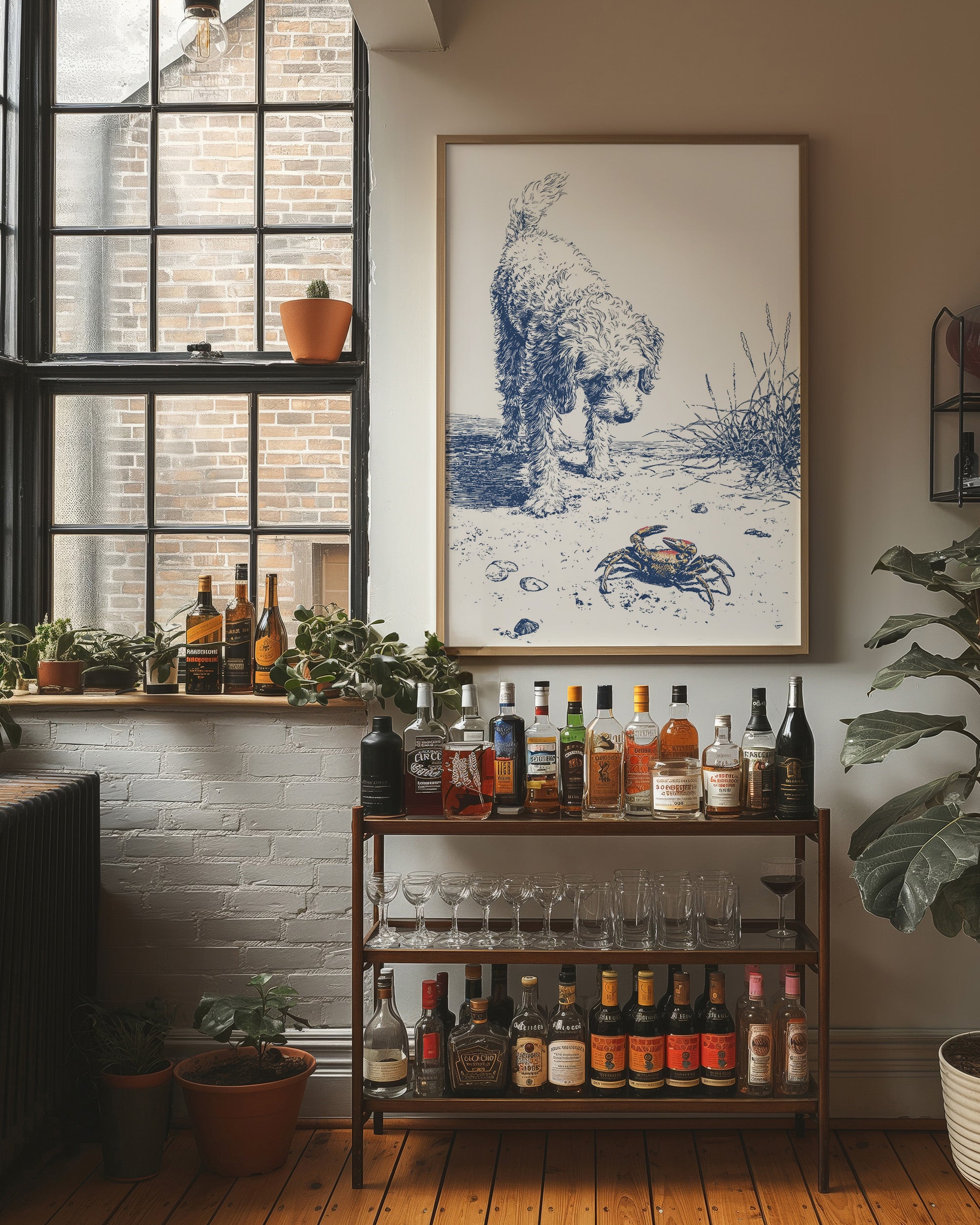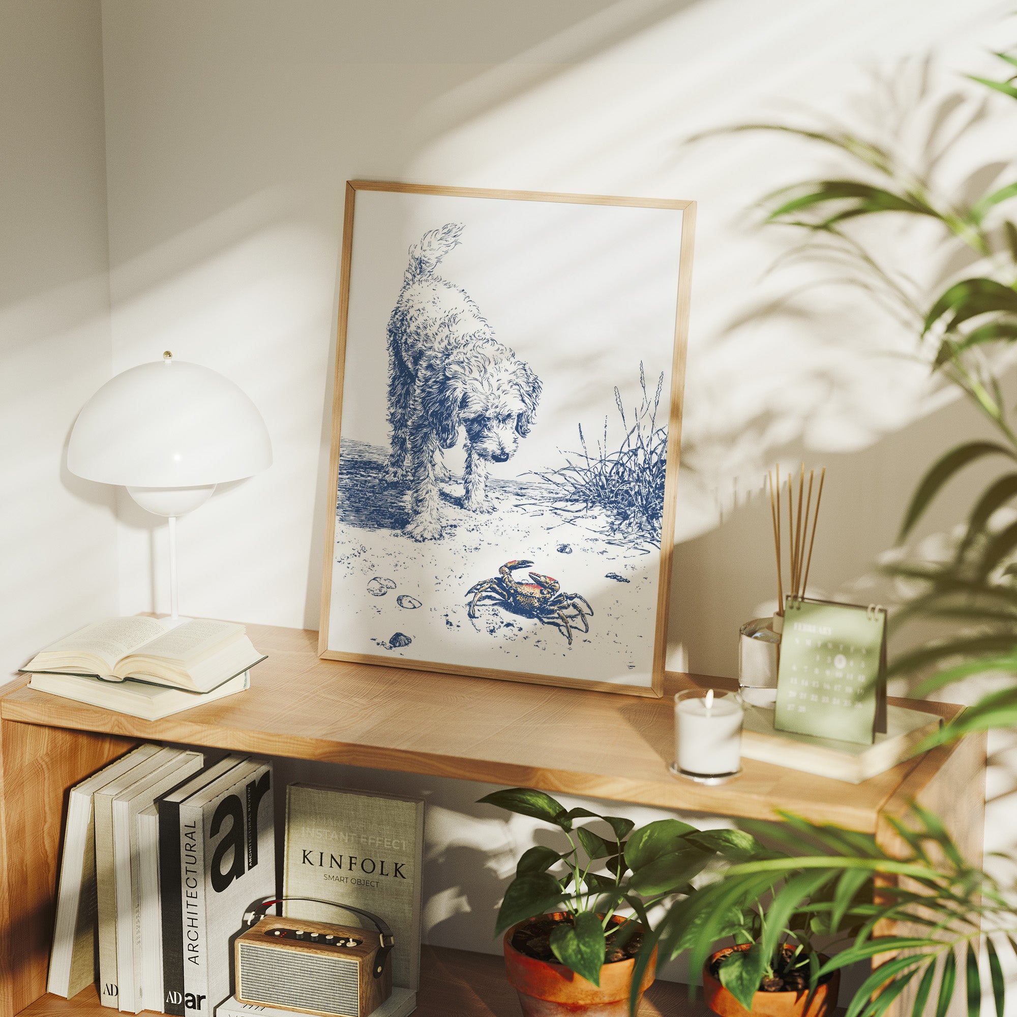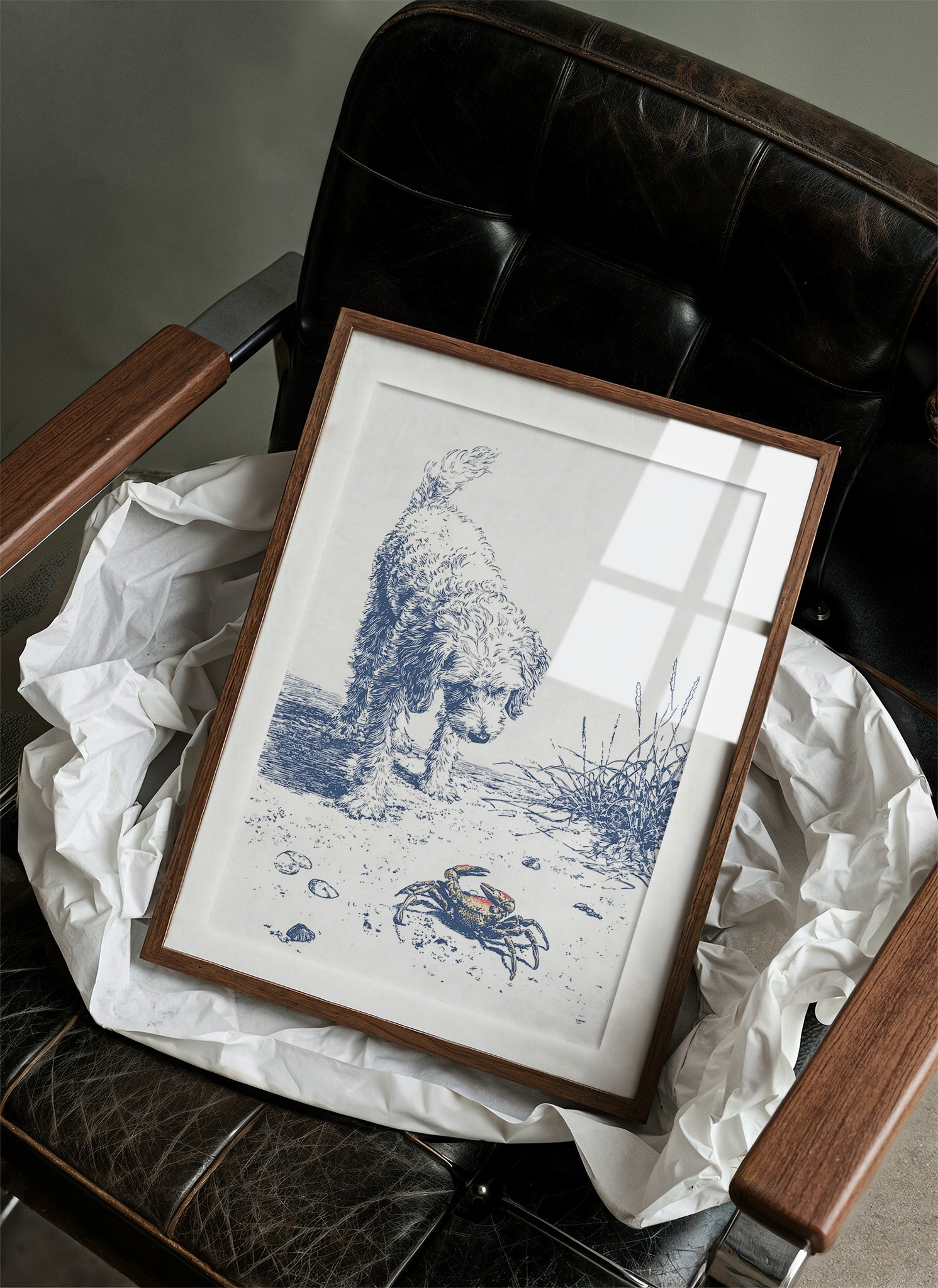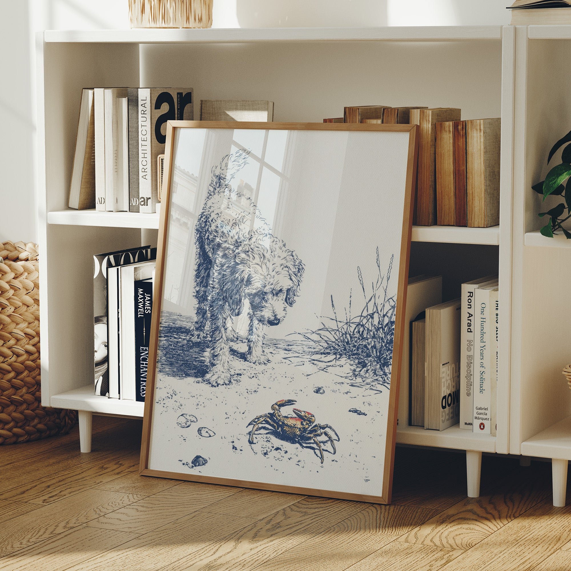 A delicate blue and white illustration on canvas depicts a curious curly-haired dog investigating a small crab on a sandy beach. The artwork, rendered in a sketch-like style with fine lines, captures a moment of gentle discovery as the fluffy canine examines the crustacean among scattered shells and beach grasses.