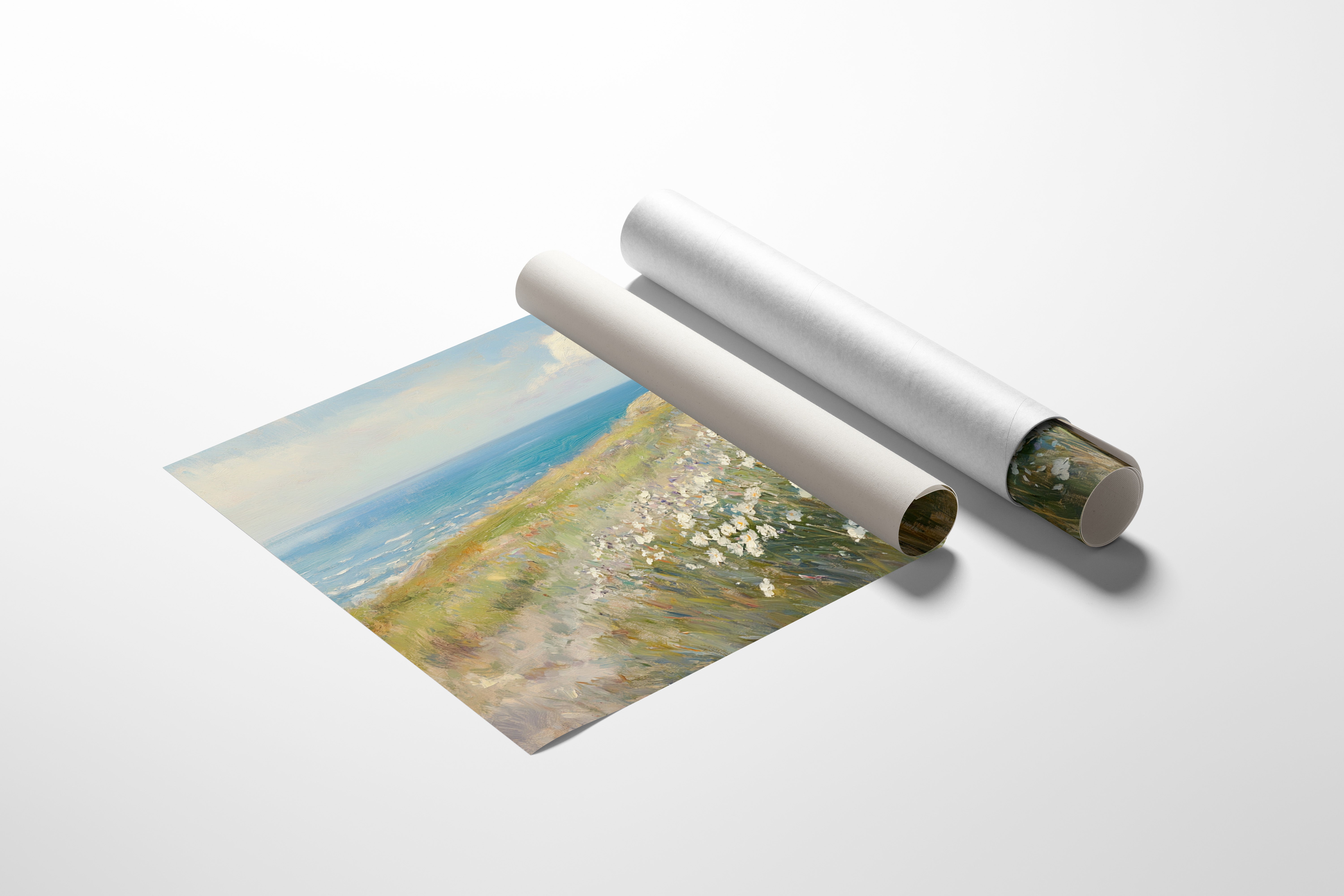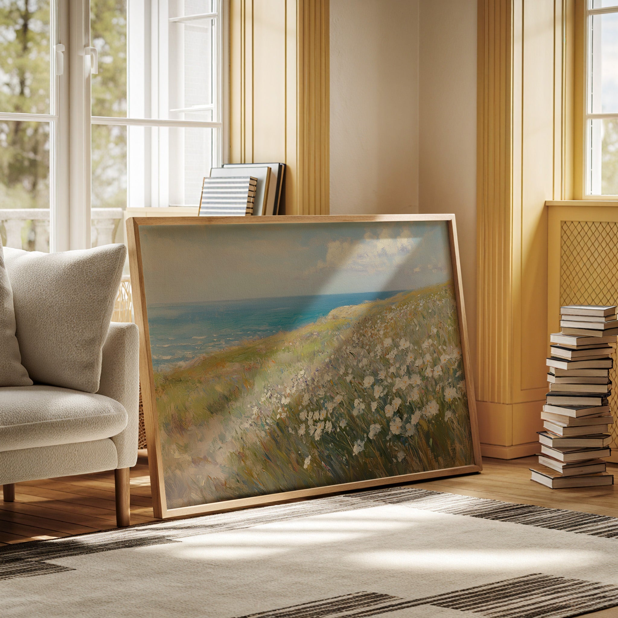 A gentle breeze carries the sweet scent of wild coastal flowers across sun-warmed meadows. White daisies dot the windswept hillside like scattered clouds, their delicate petals catching the golden light. The composition flows from detailed wildflowers in the foreground to the sweeping cerulean waters below, creating a perfect harmony between land and sea. Rich impasto brushstrokes capture the texture of grass and petals, while soft blues and greens blend seamlessly into the distant horizon. This piece brings the fresh vitality of a coastal summer day into any space, ideal for brightening a bedroom or adding natural charm to a living area.